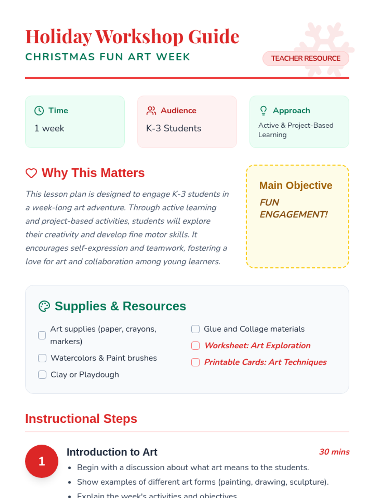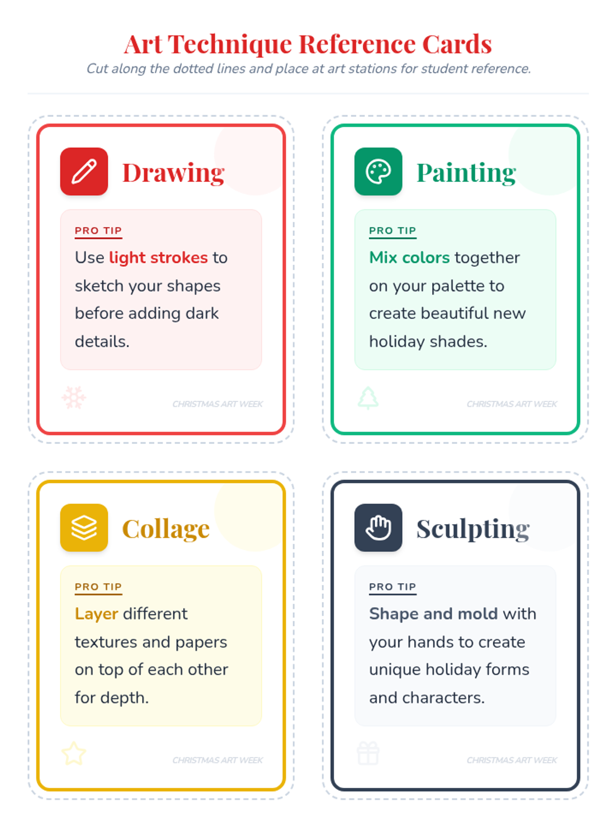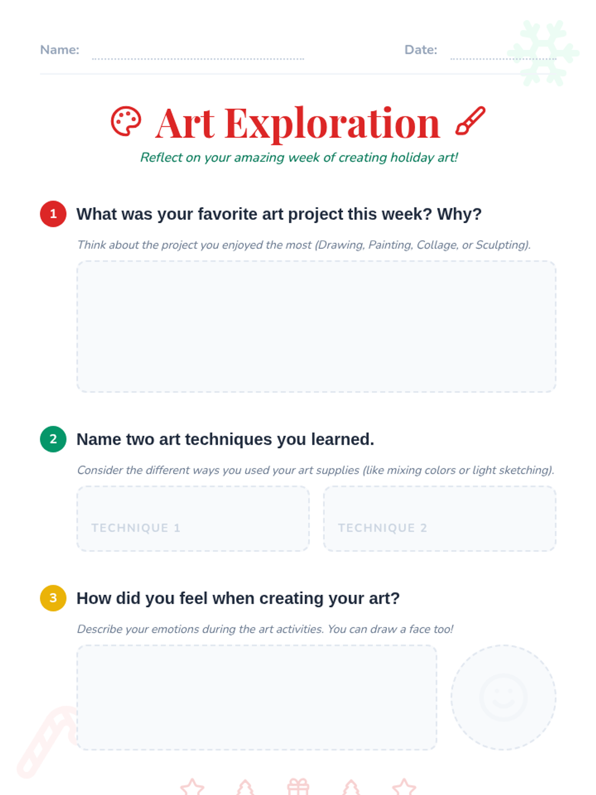 An engaging holiday-themed art curriculum designed to foster creativity, fine motor skills, and self-expression through daily projects and reflection.