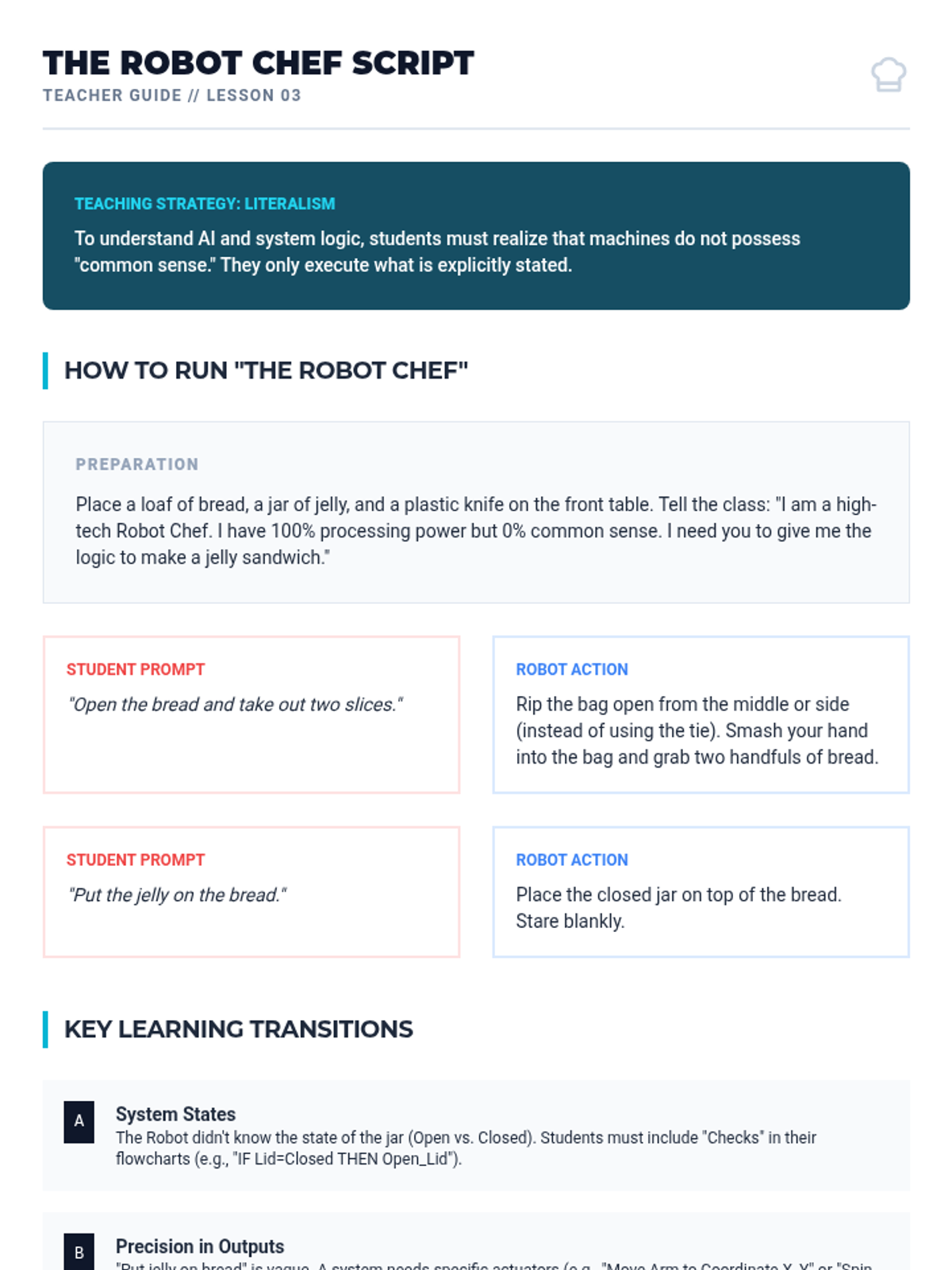 A comprehensive K-8 curriculum designed to build foundational AI literacy through understanding, evaluation, application, and ethics. Each grade level tackles a specific theme, progressing from basic robot concepts to complex algorithmic bias and societal impact.