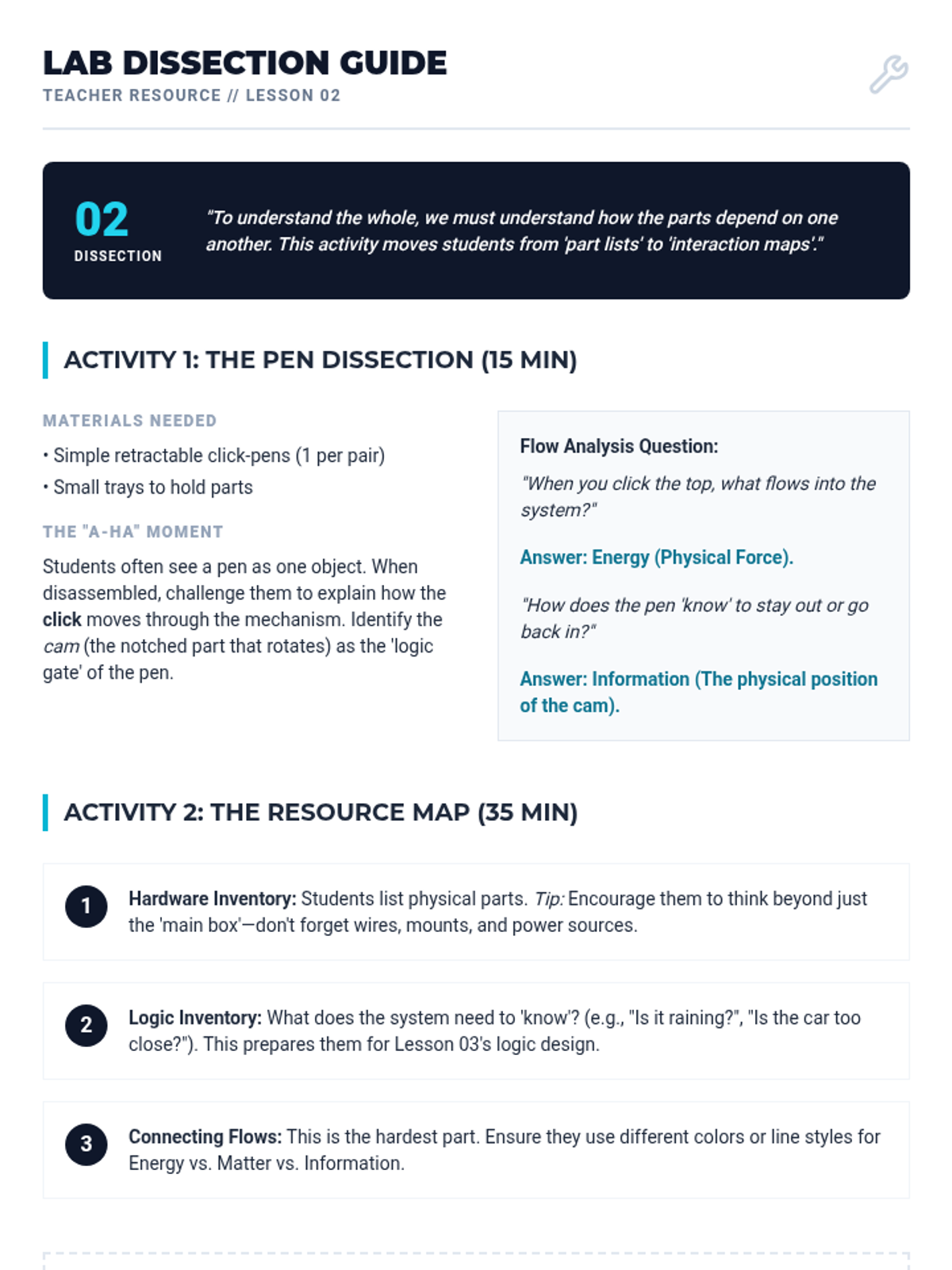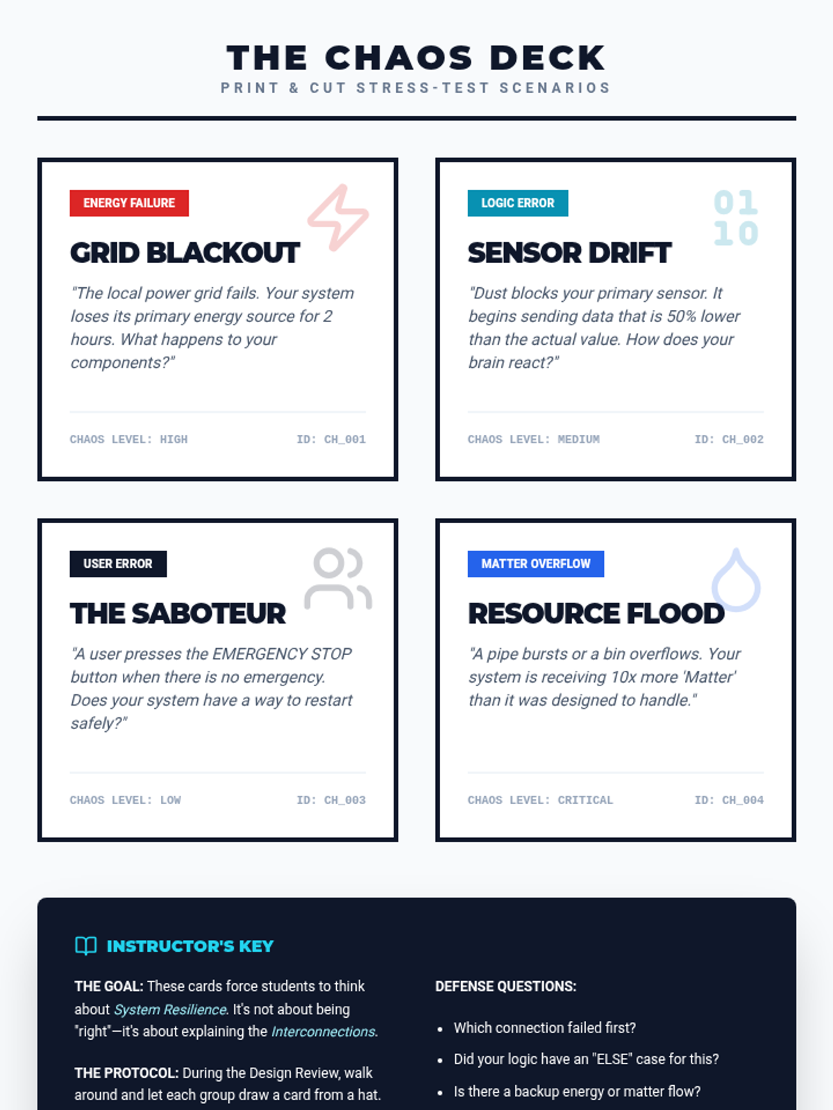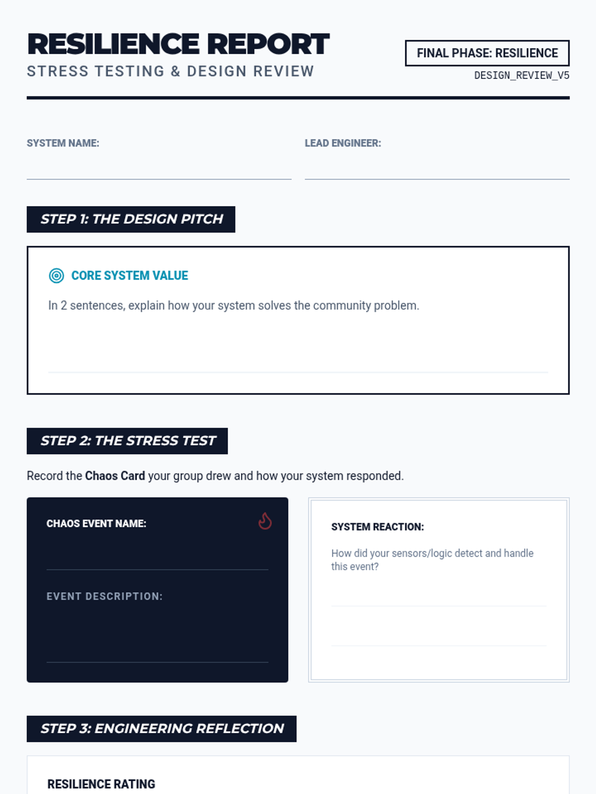 Students adopt the role of systems engineers to design sustainable solutions for community needs. They learn to define boundaries, map component interactions, and develop control logic, culminating in a resilient design review.