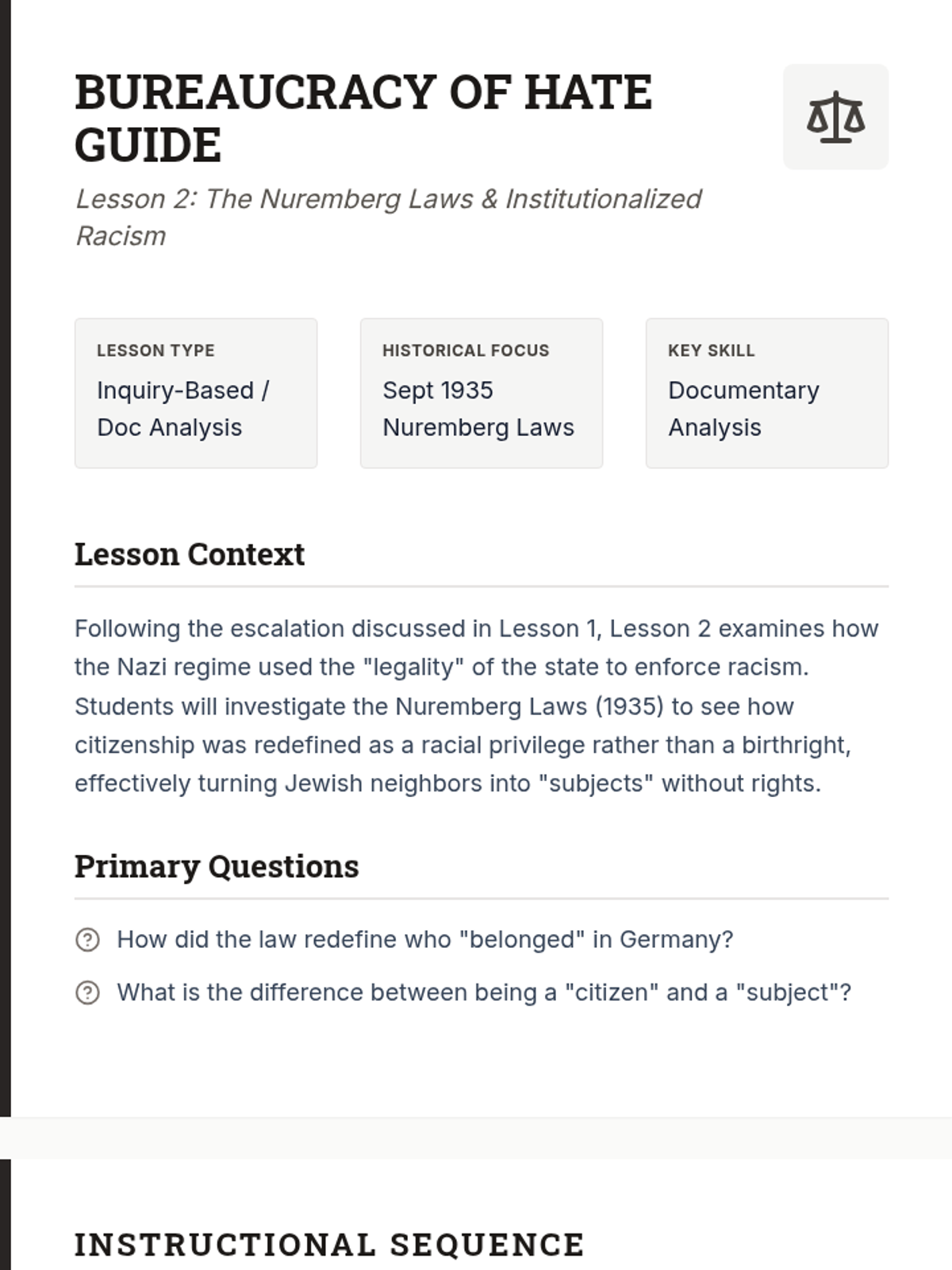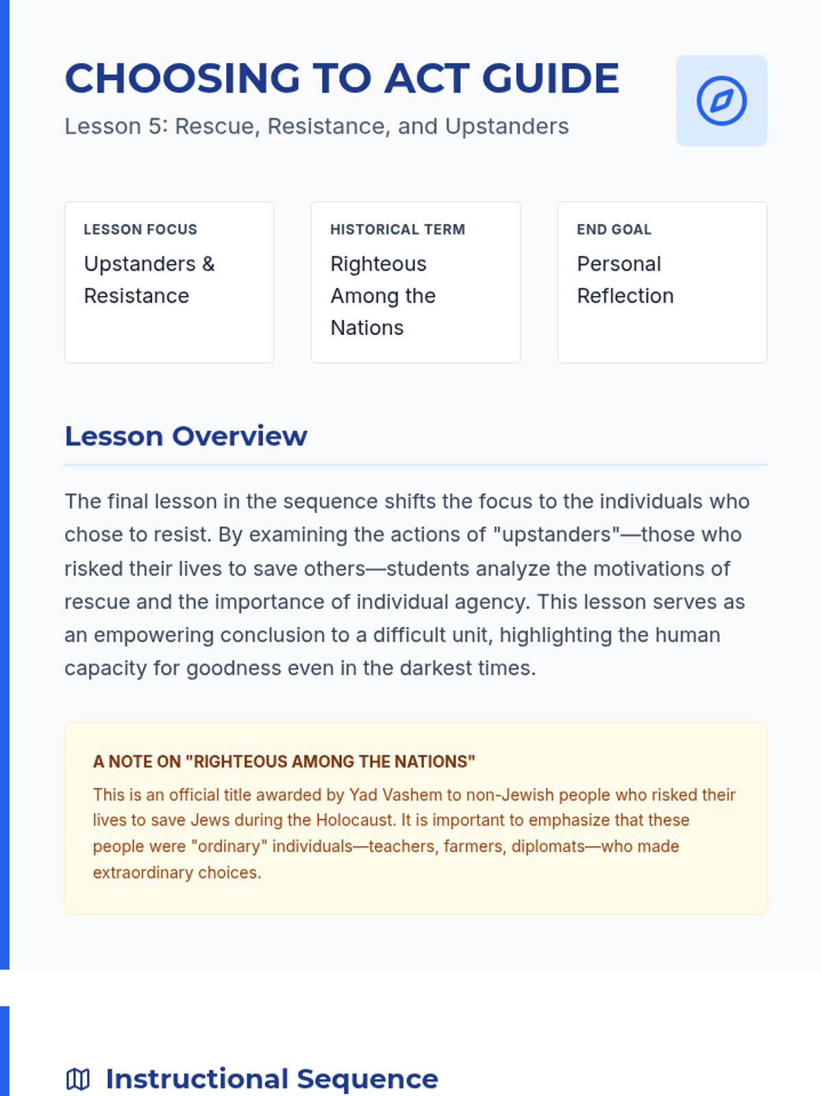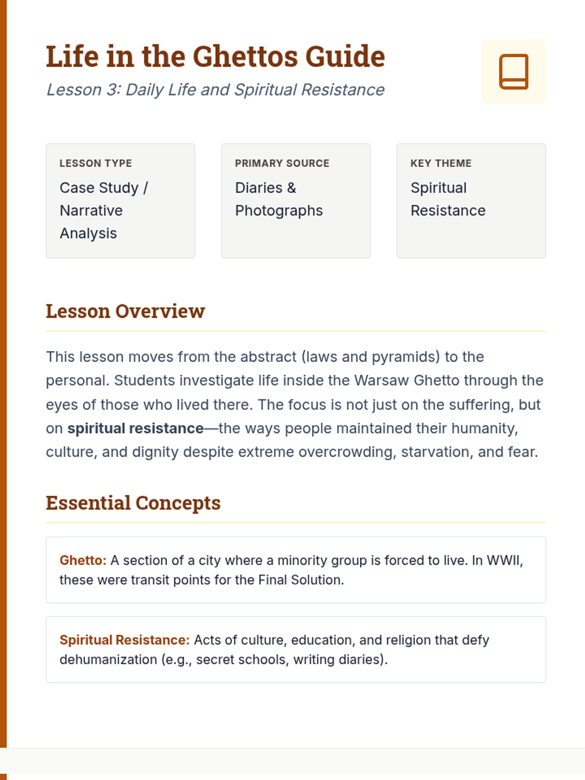 A 5-lesson sequence for 7th Grade Social Studies exploring the Holocaust through the lens of prejudice escalation, institutionalized racism, and the human narratives of victims, survivors, and upstanders. Students move from analyzing the 'Pyramid of Hate' to researching resistance movements and individuals who chose to act against injustice.