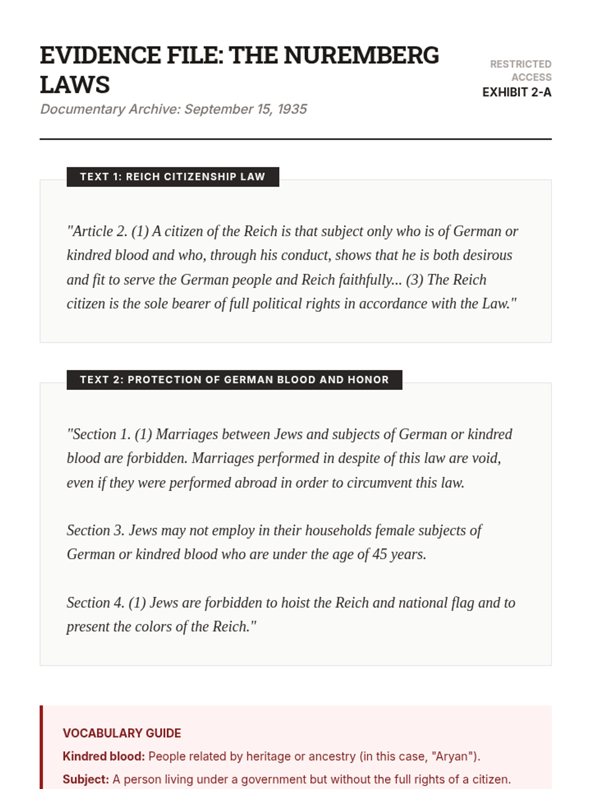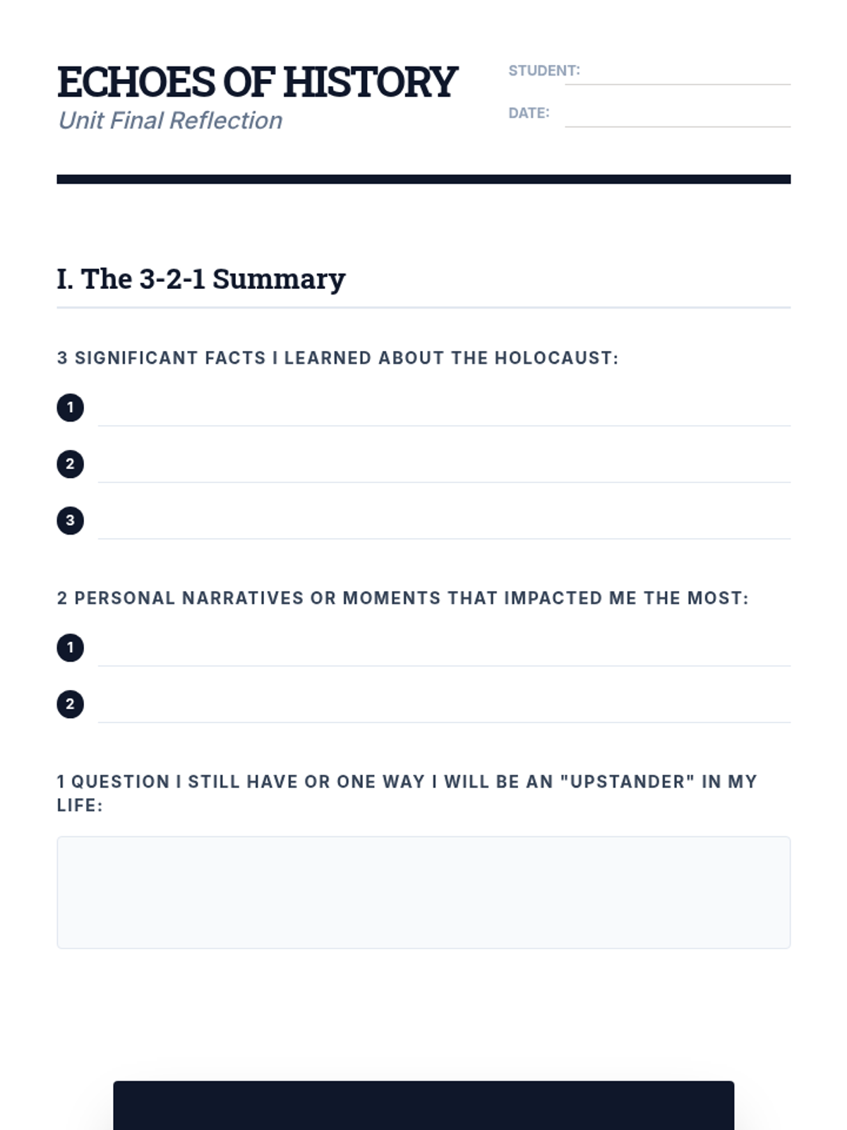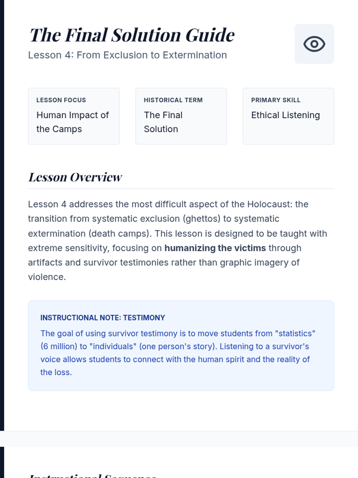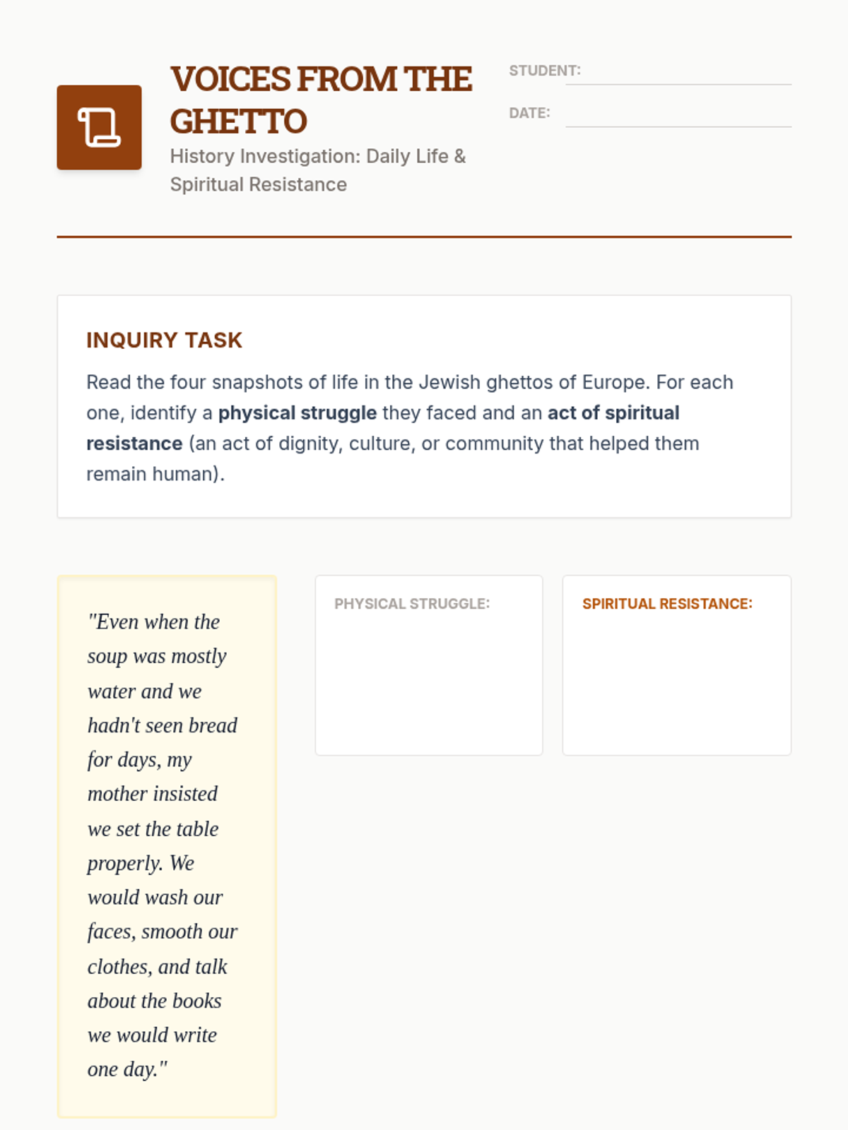 A 5-lesson sequence for 7th Grade Social Studies exploring the Holocaust through the lens of prejudice escalation, institutionalized racism, and the human narratives of victims, survivors, and upstanders. Students move from analyzing the 'Pyramid of Hate' to researching resistance movements and individuals who chose to act against injustice.