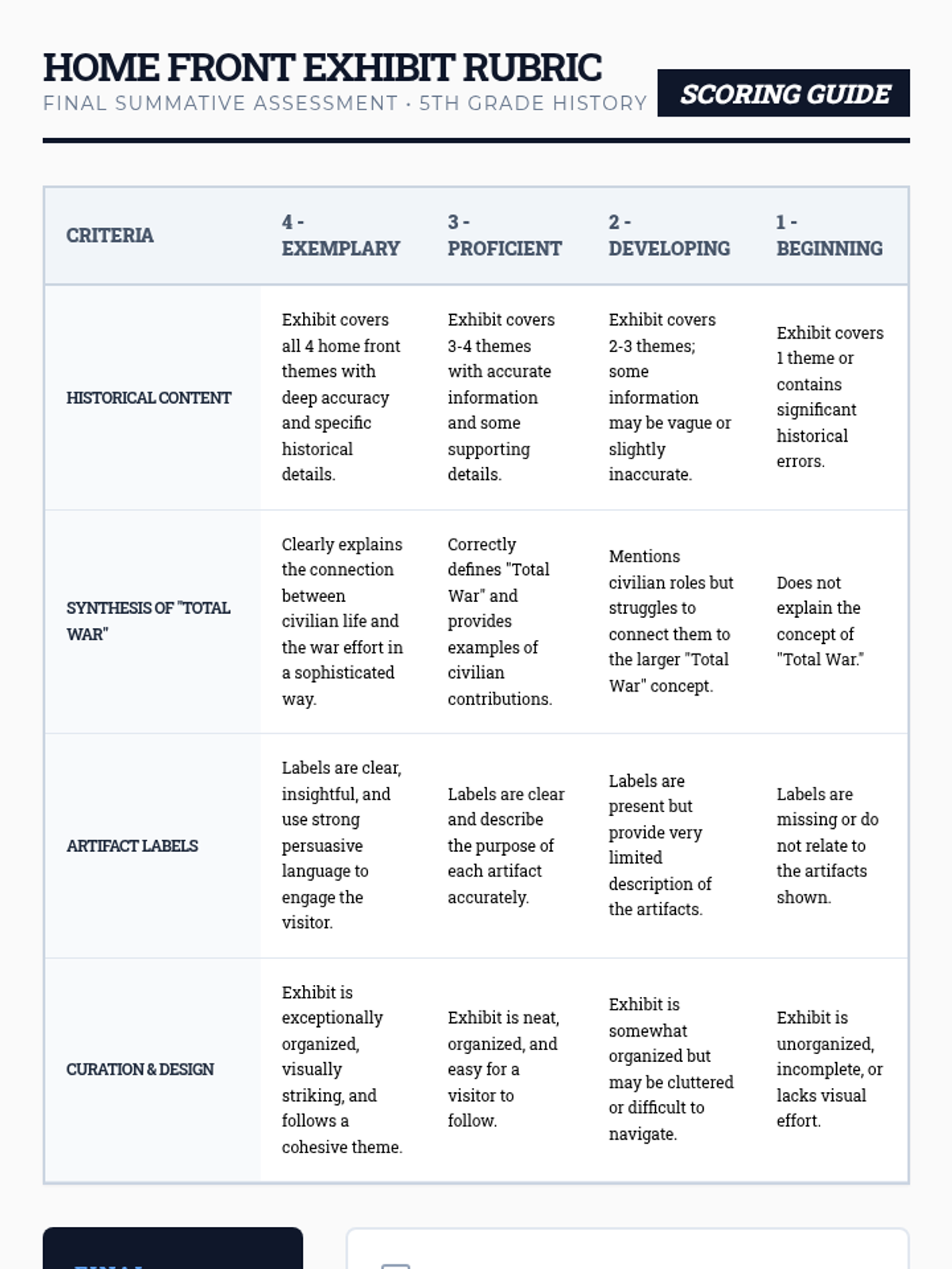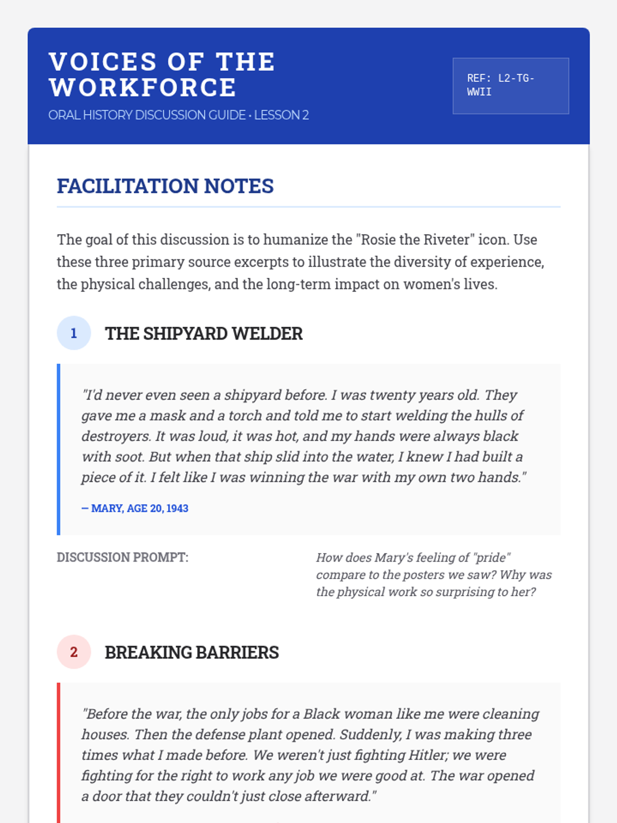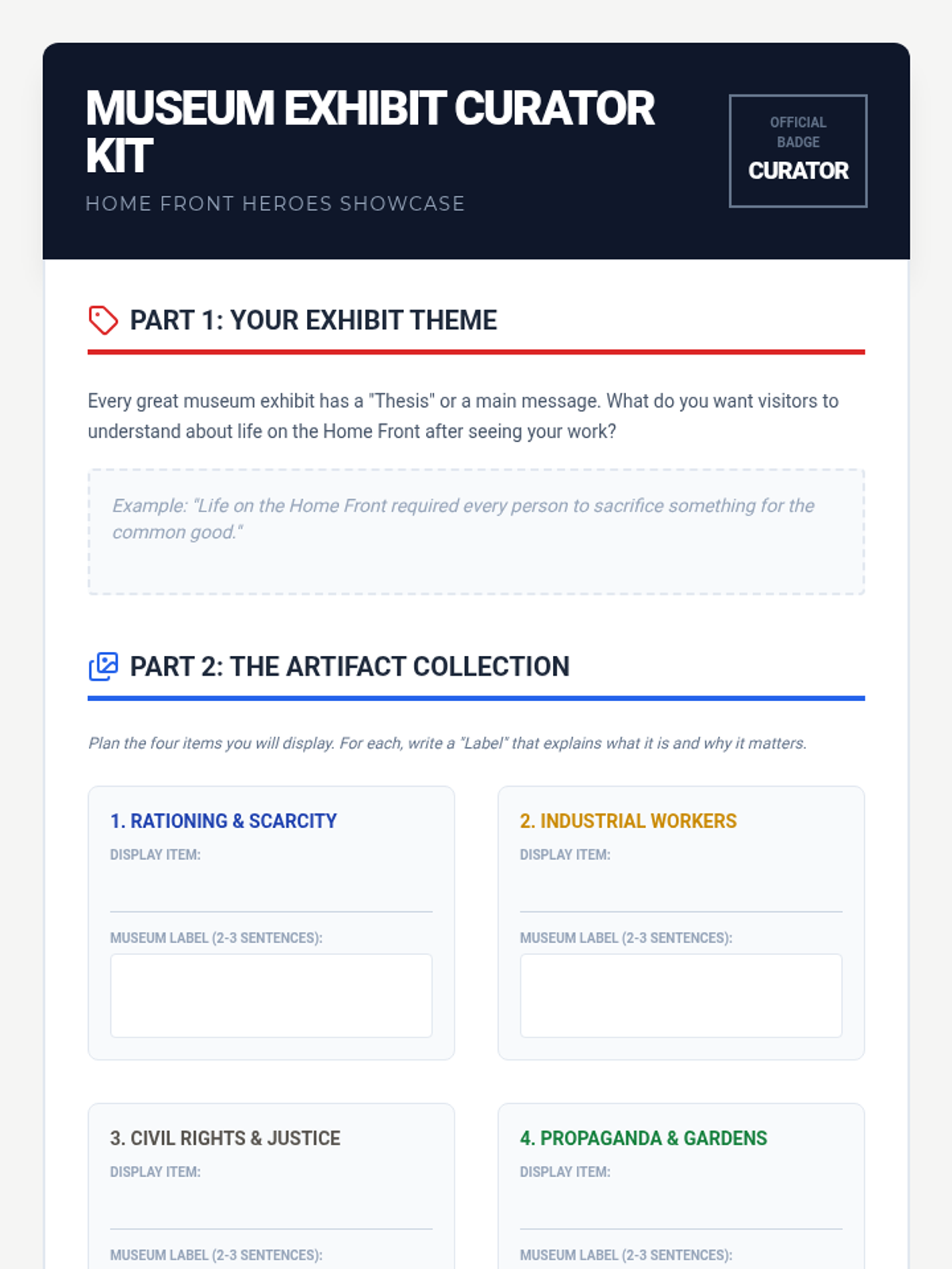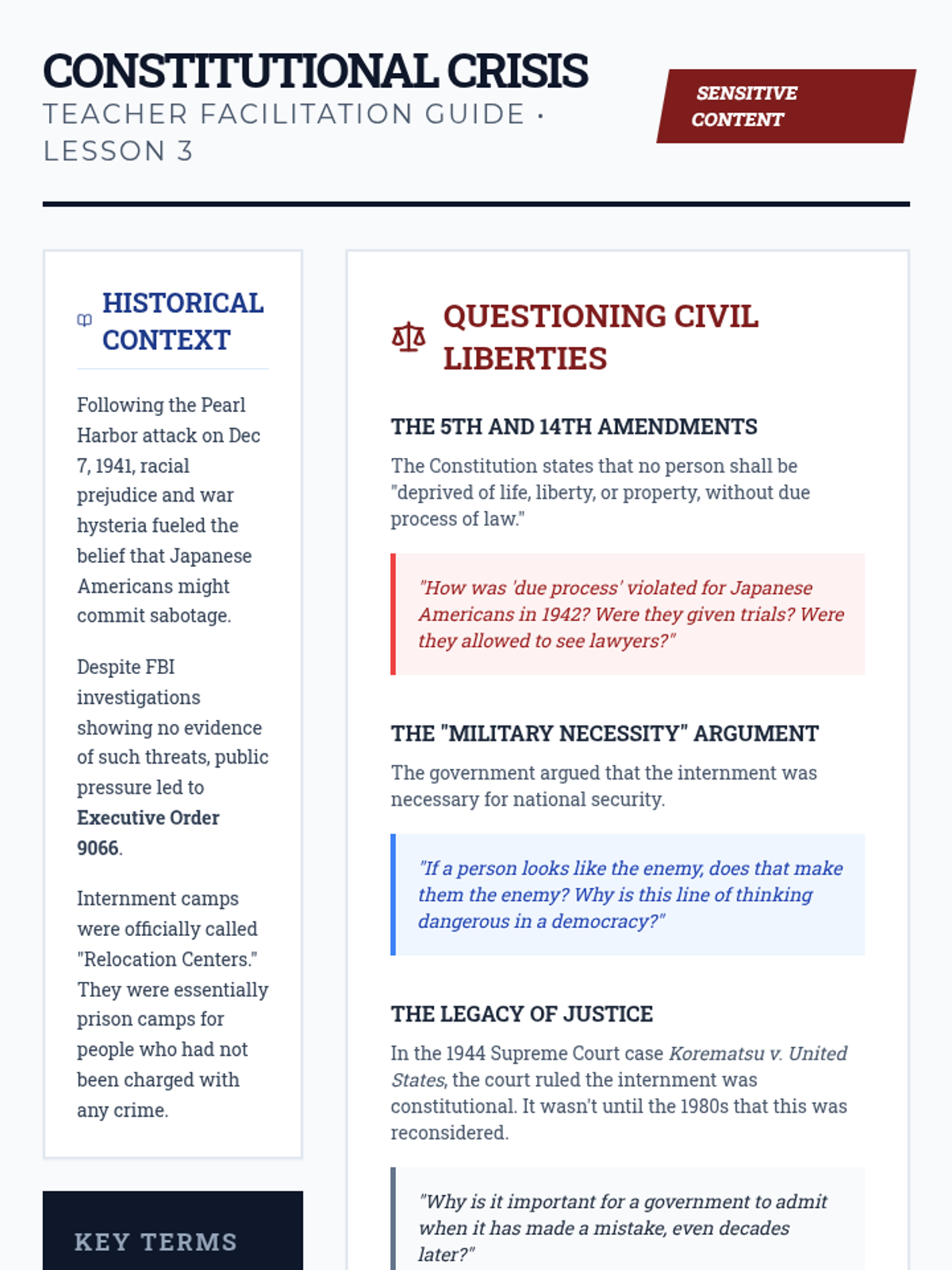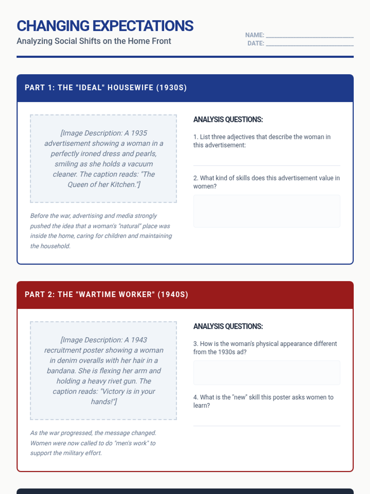 This sequence explores the impact of World War II on the American Home Front, focusing on rationing, industrial mobilization, women's roles, and Japanese American internment. Students participate in simulations and projects to understand the concept of 'Total War' and how global conflict transforms daily life and civil liberties.