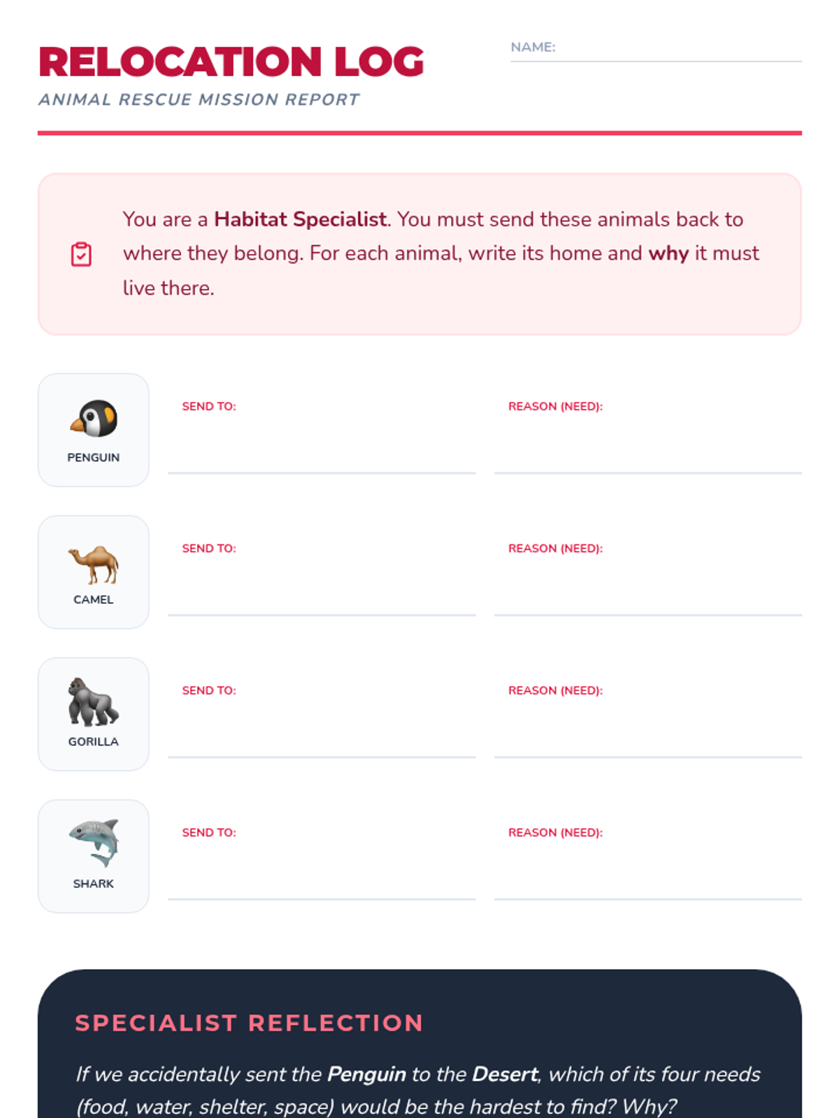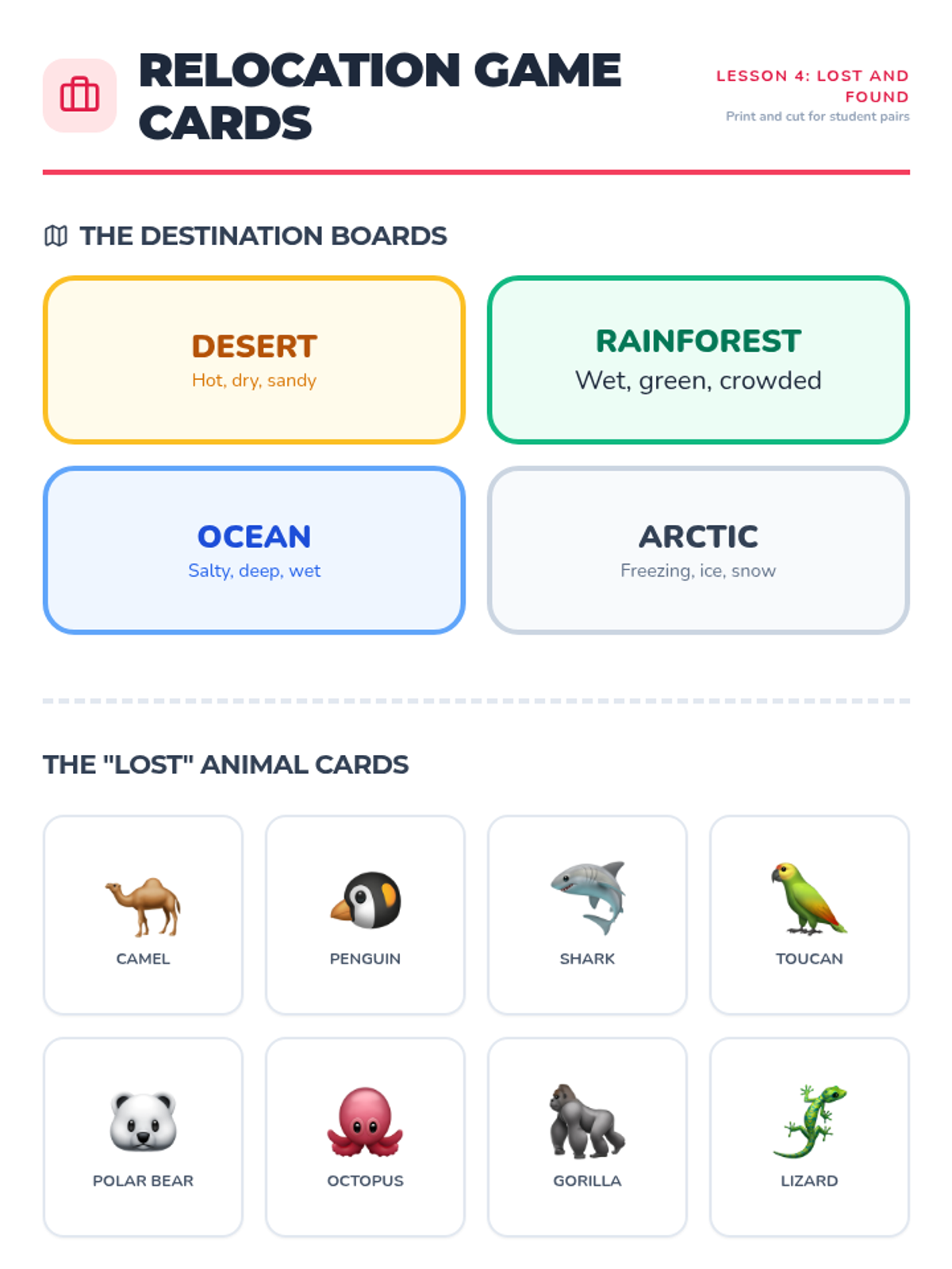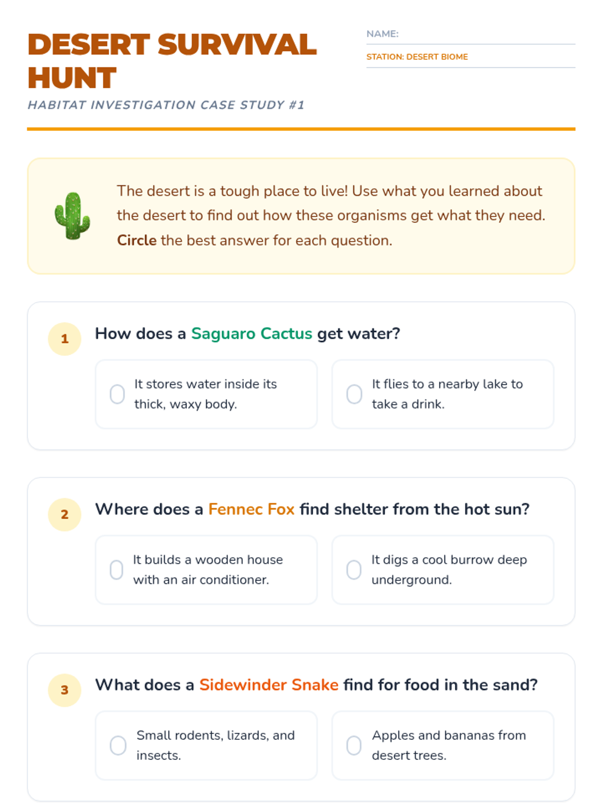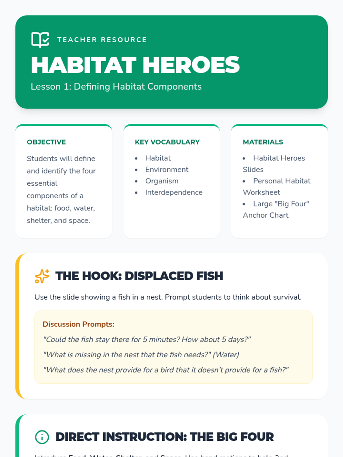 A 2nd-grade life science sequence exploring how living things depend on their environments for survival. Students learn the four components of a habitat, explore desert and rainforest biomes, and practice matching organisms to their correct homes.