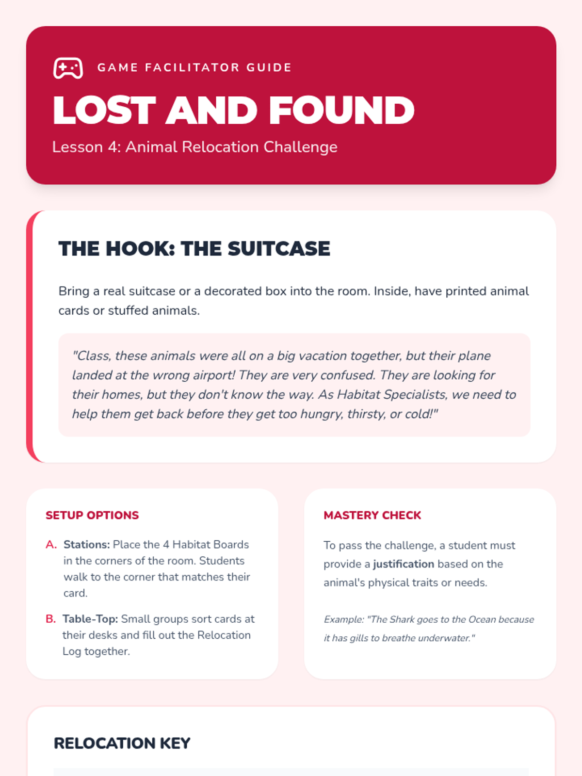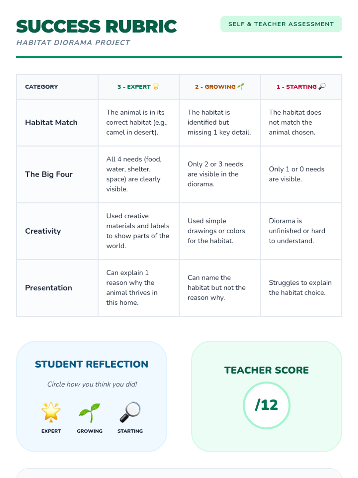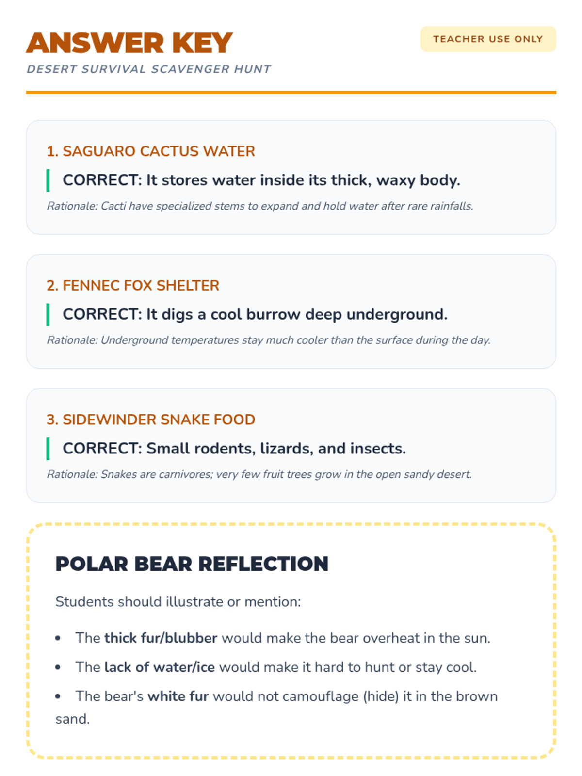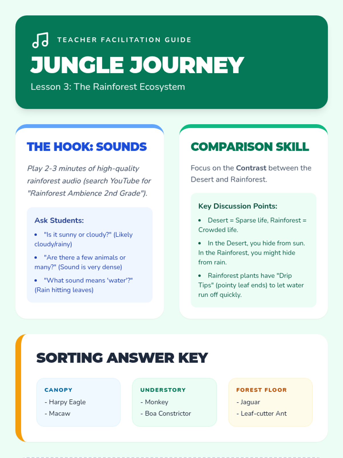 A 2nd-grade life science sequence exploring how living things depend on their environments for survival. Students learn the four components of a habitat, explore desert and rainforest biomes, and practice matching organisms to their correct homes.