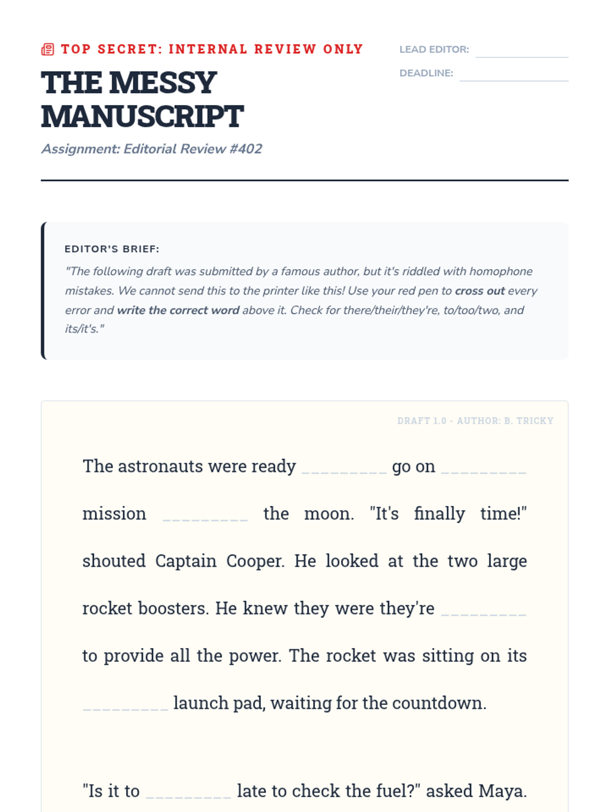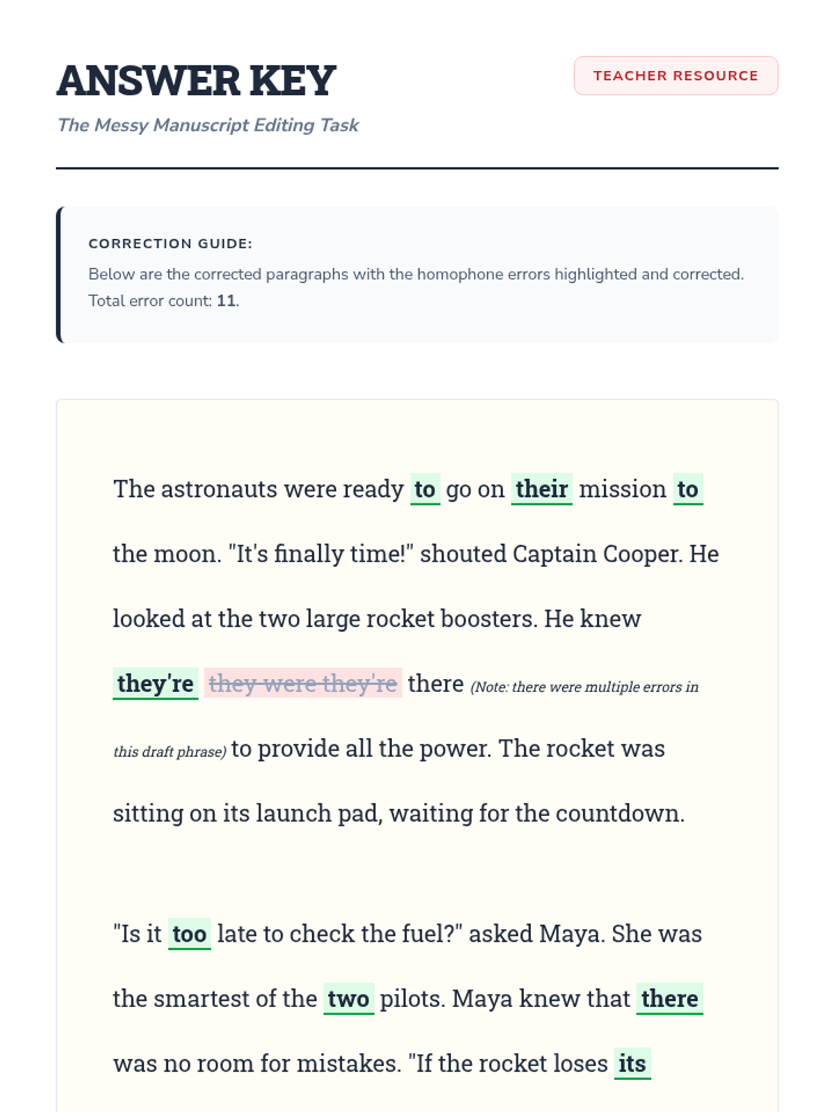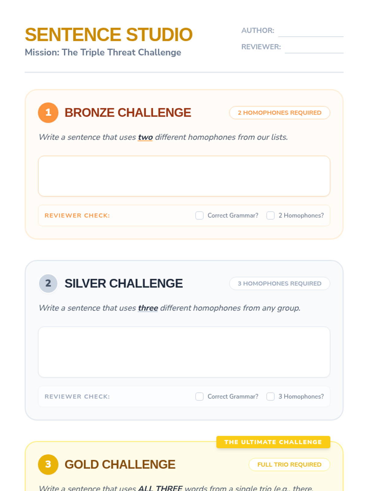 A comprehensive 3rd-grade sequence focused on mastering the most common homophones (there/their/they're, to/too/two, and its/it's) through a workshop and case-study approach. Students move from rule acquisition to professional-level editing and original sentence construction.