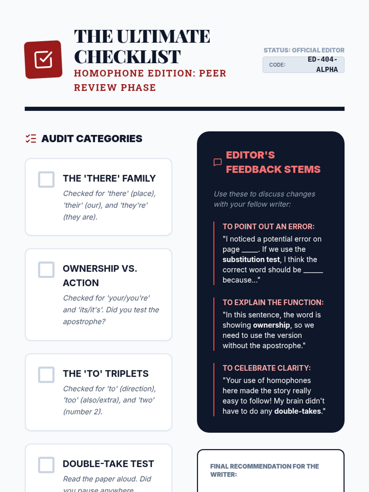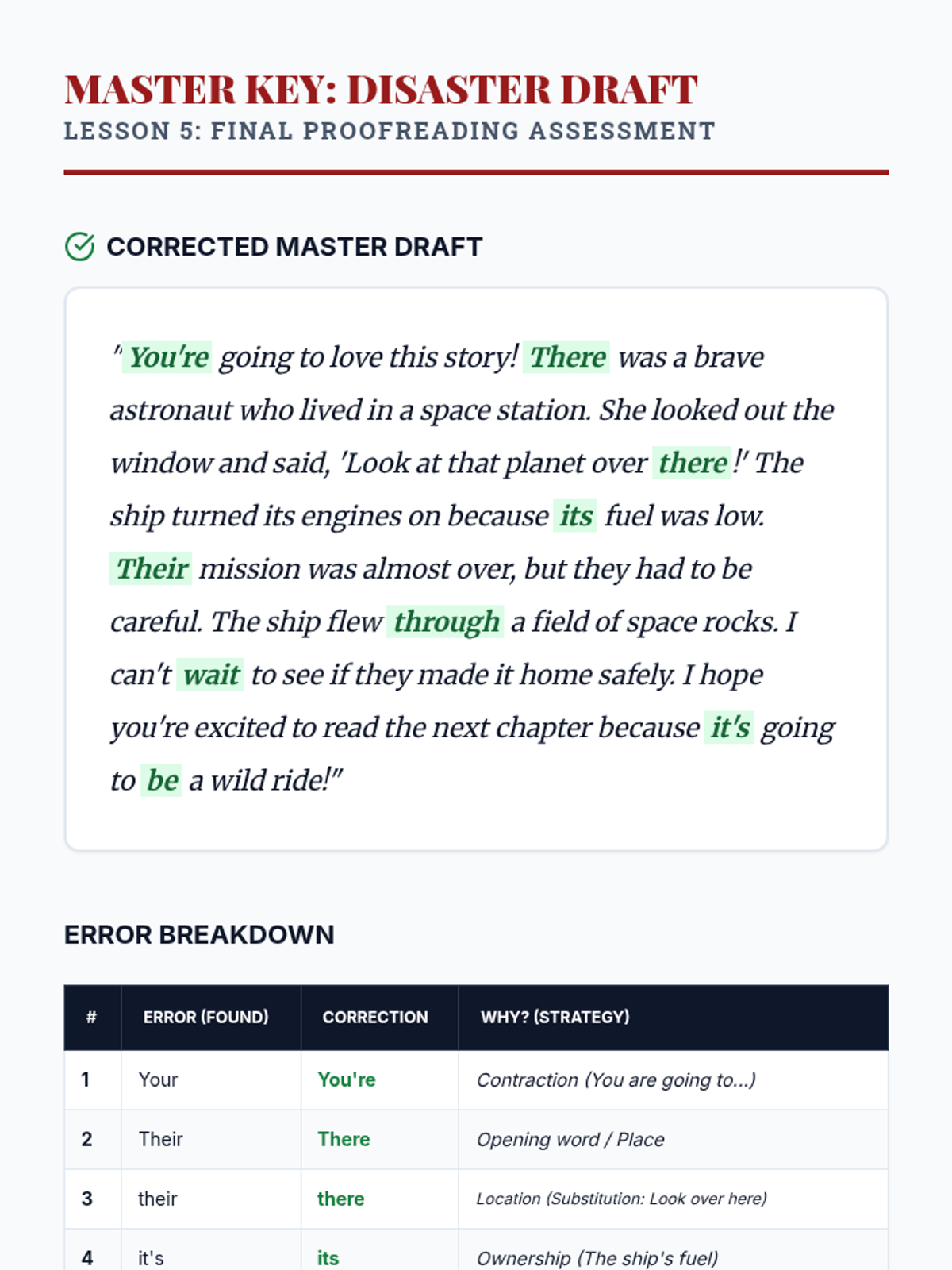 A writing workshop sequence focused on the practical application of homophones in composition. Students move from error identification in anonymous samples to mastering high-frequency homophones and performing peer edits, culminating in a comprehensive proofreading assessment.