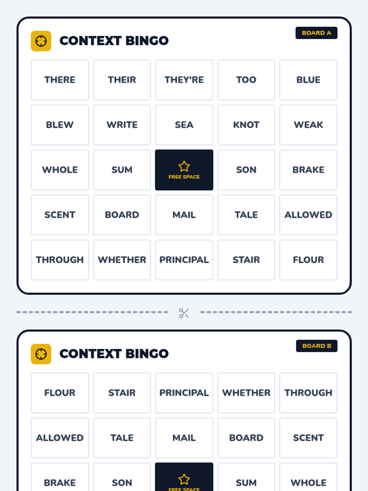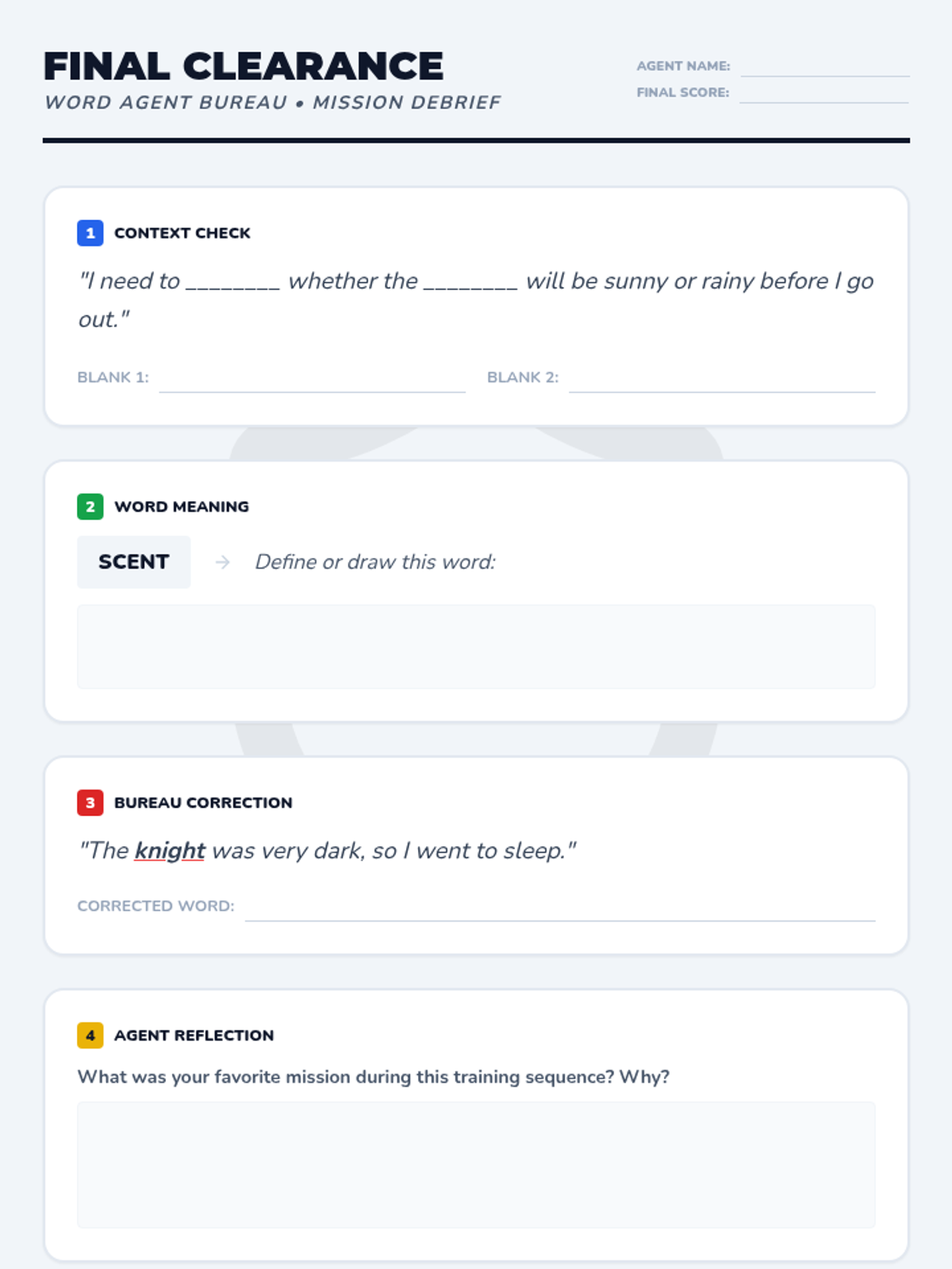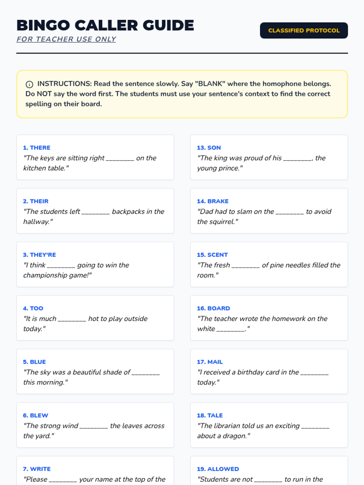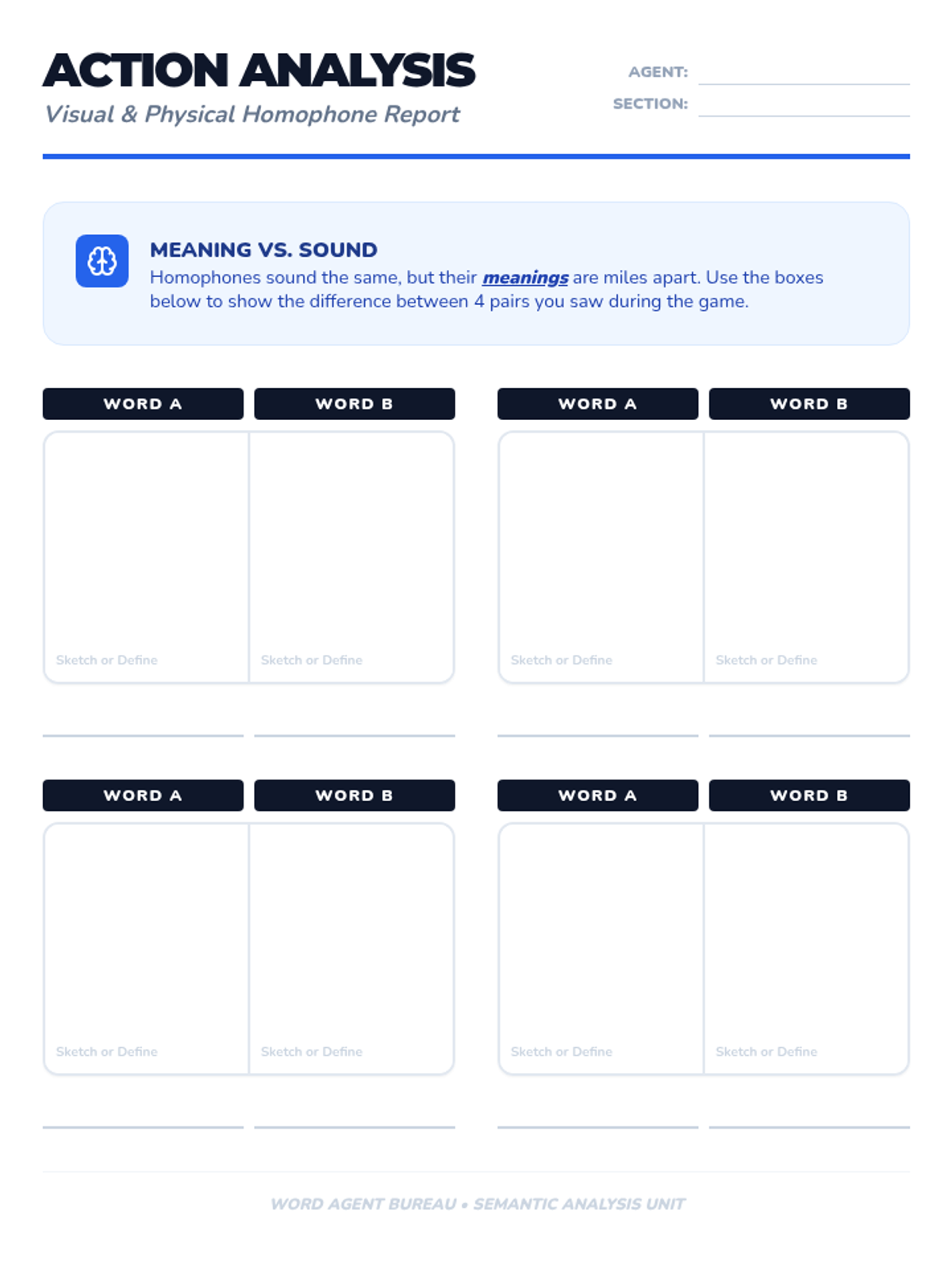 A game-based sequence focused on the rapid identification and correct usage of homophones through competitive and collaborative activities. Students act as 'Word Agents' to solve mysteries, play games, and compete in a final tournament to master spelling and context clues.