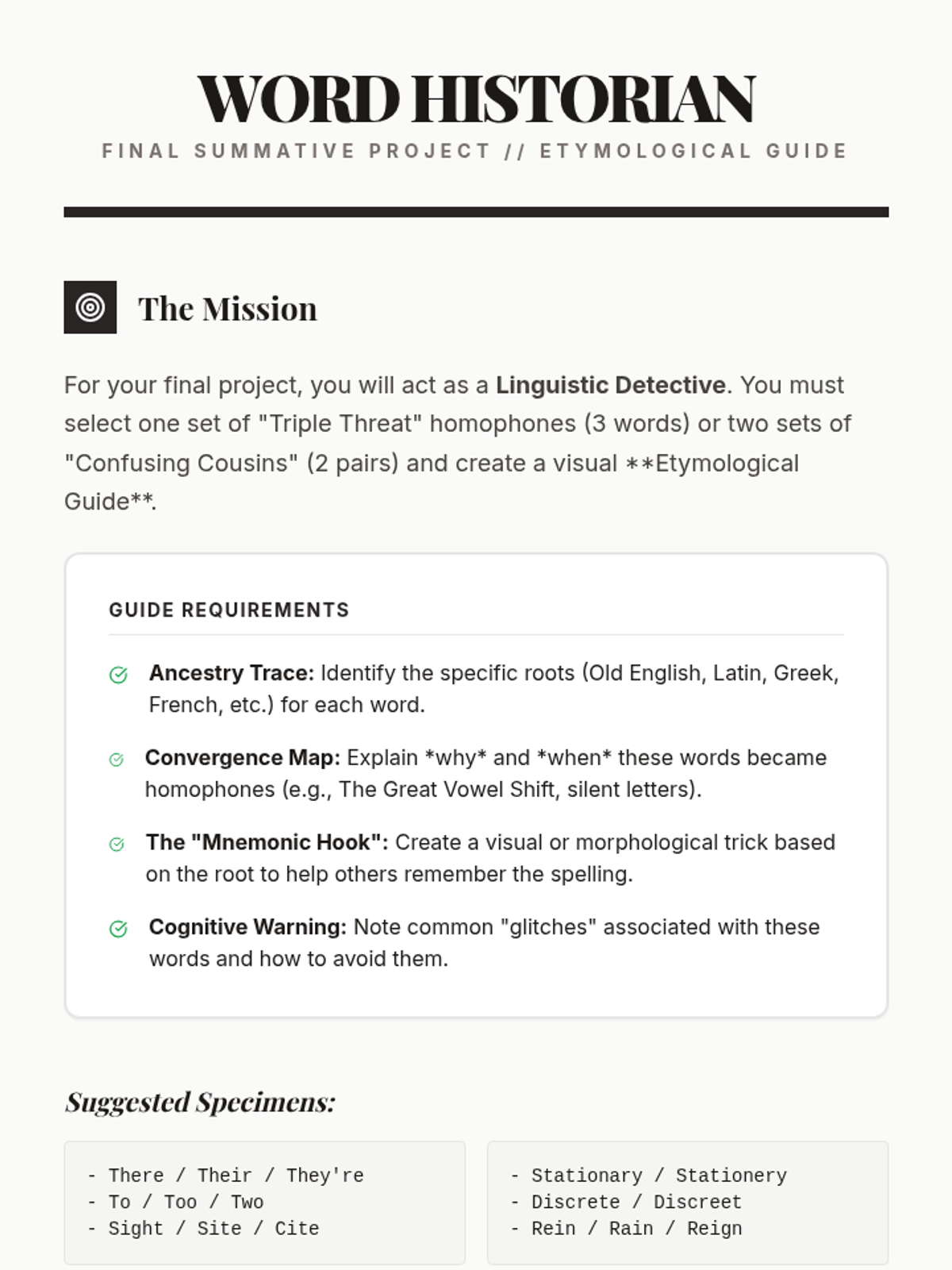 A 10th-grade ELA sequence exploring the linguistic and etymological origins of homophones. Students investigate the historical evolution of the English language, the Great Vowel Shift, and cognitive processing errors to master spelling through understanding.
