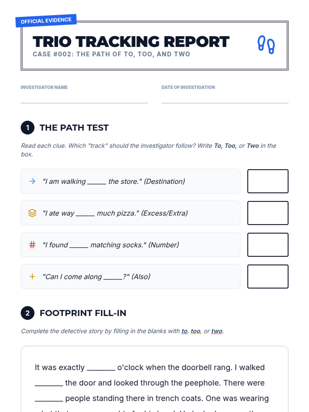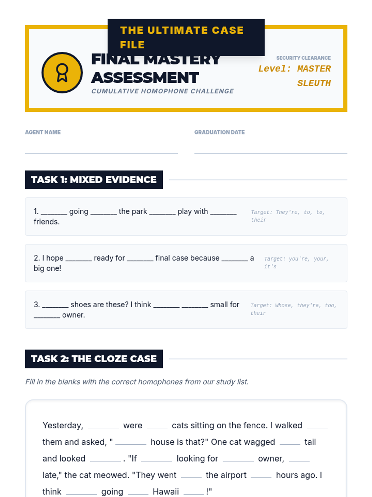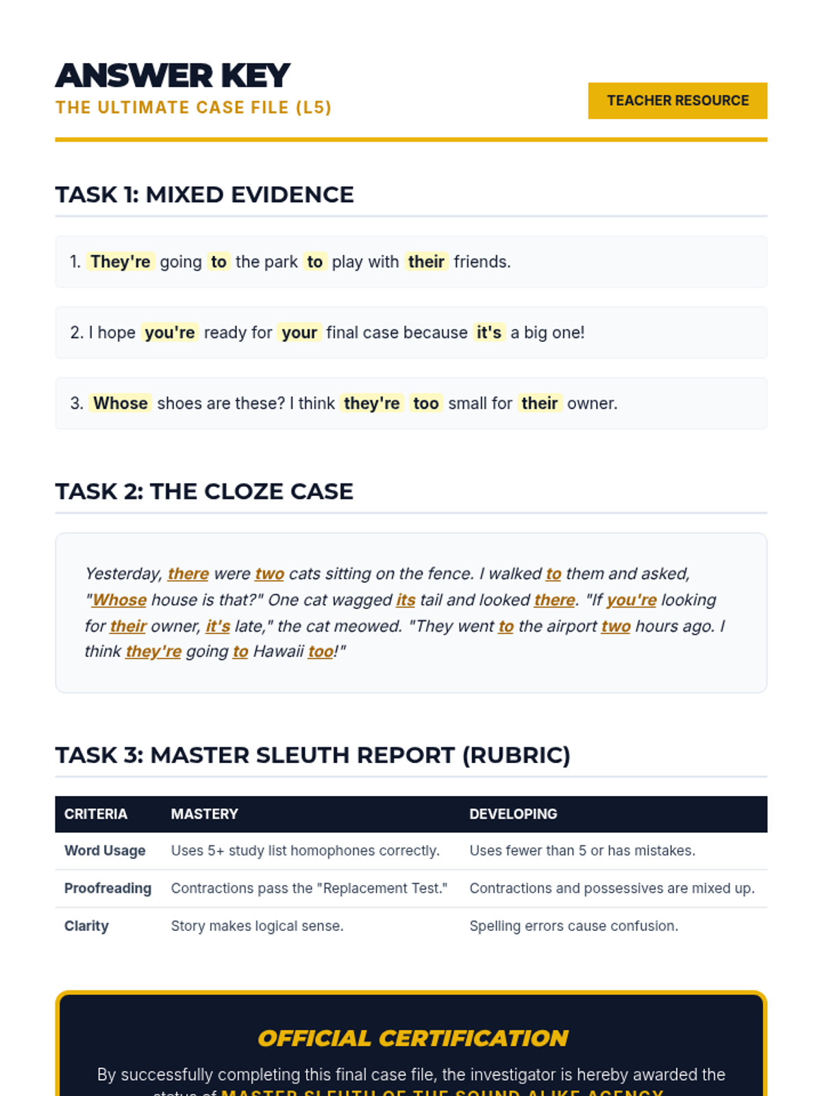 A comprehensive sequence for 4th graders to master high-frequency homophones including there/their/they're, to/too/two, your/you're, its/it's, and whose/who's through a detective-themed exploration of grammar cues.