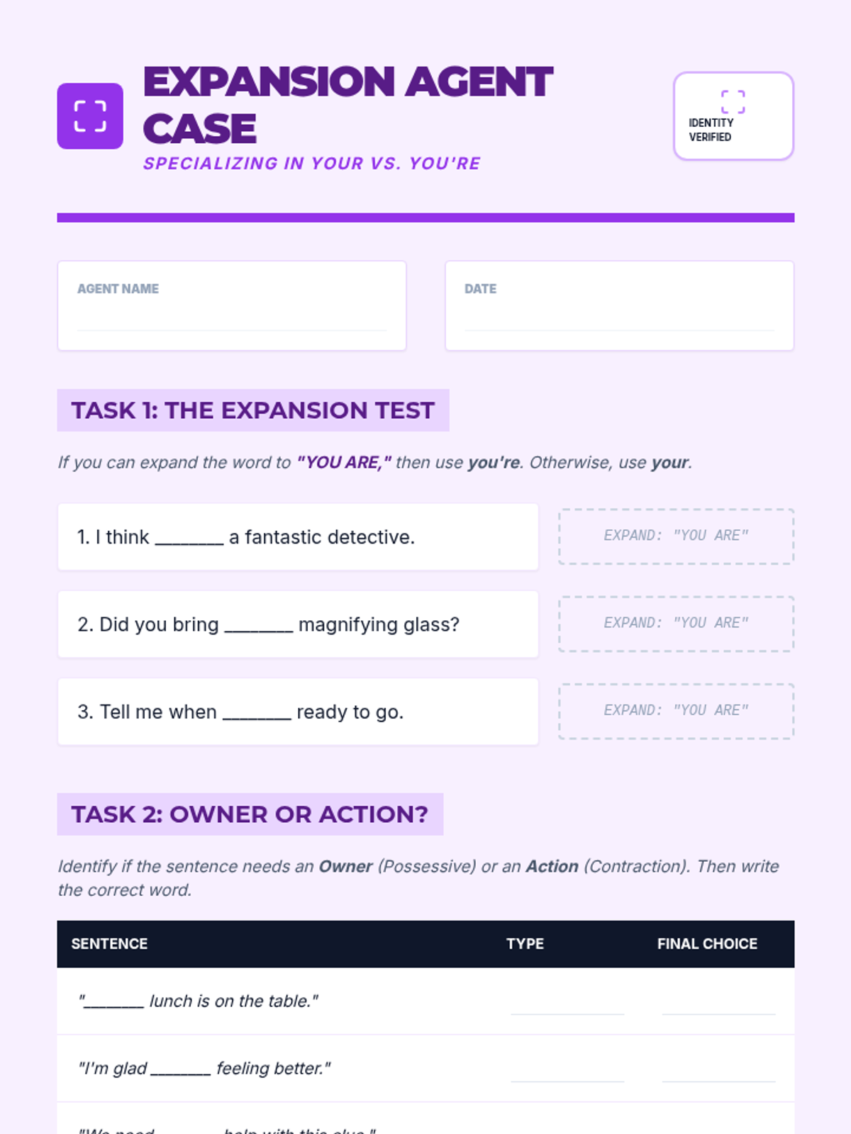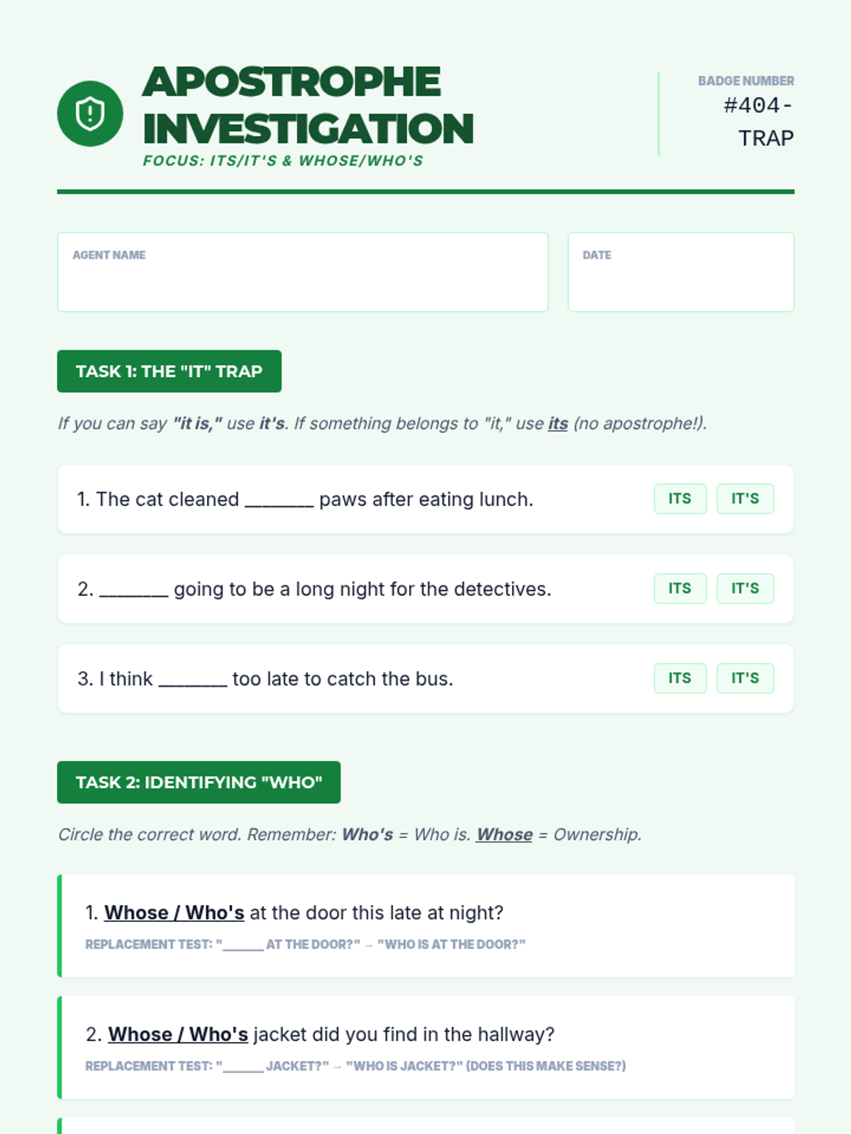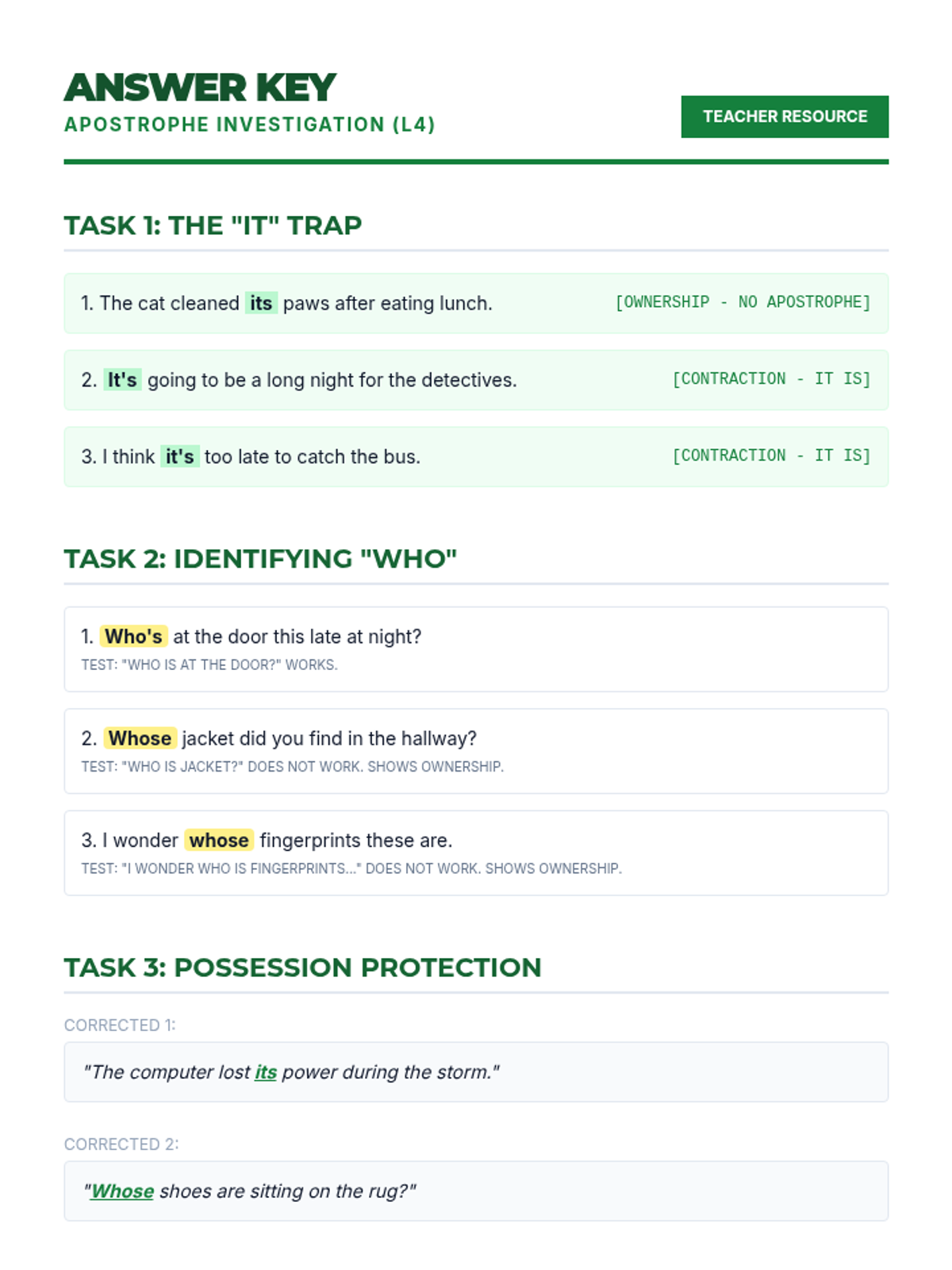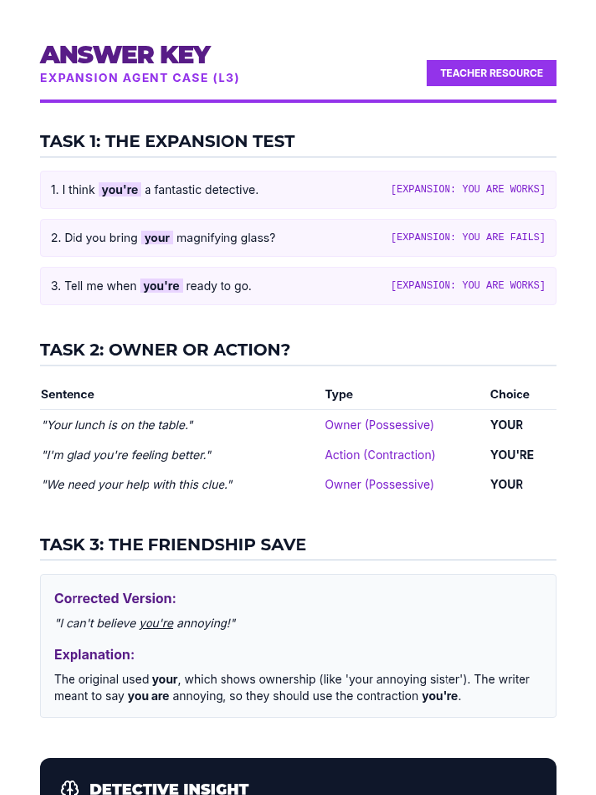 A comprehensive sequence for 4th graders to master high-frequency homophones including there/their/they're, to/too/two, your/you're, its/it's, and whose/who's through a detective-themed exploration of grammar cues.