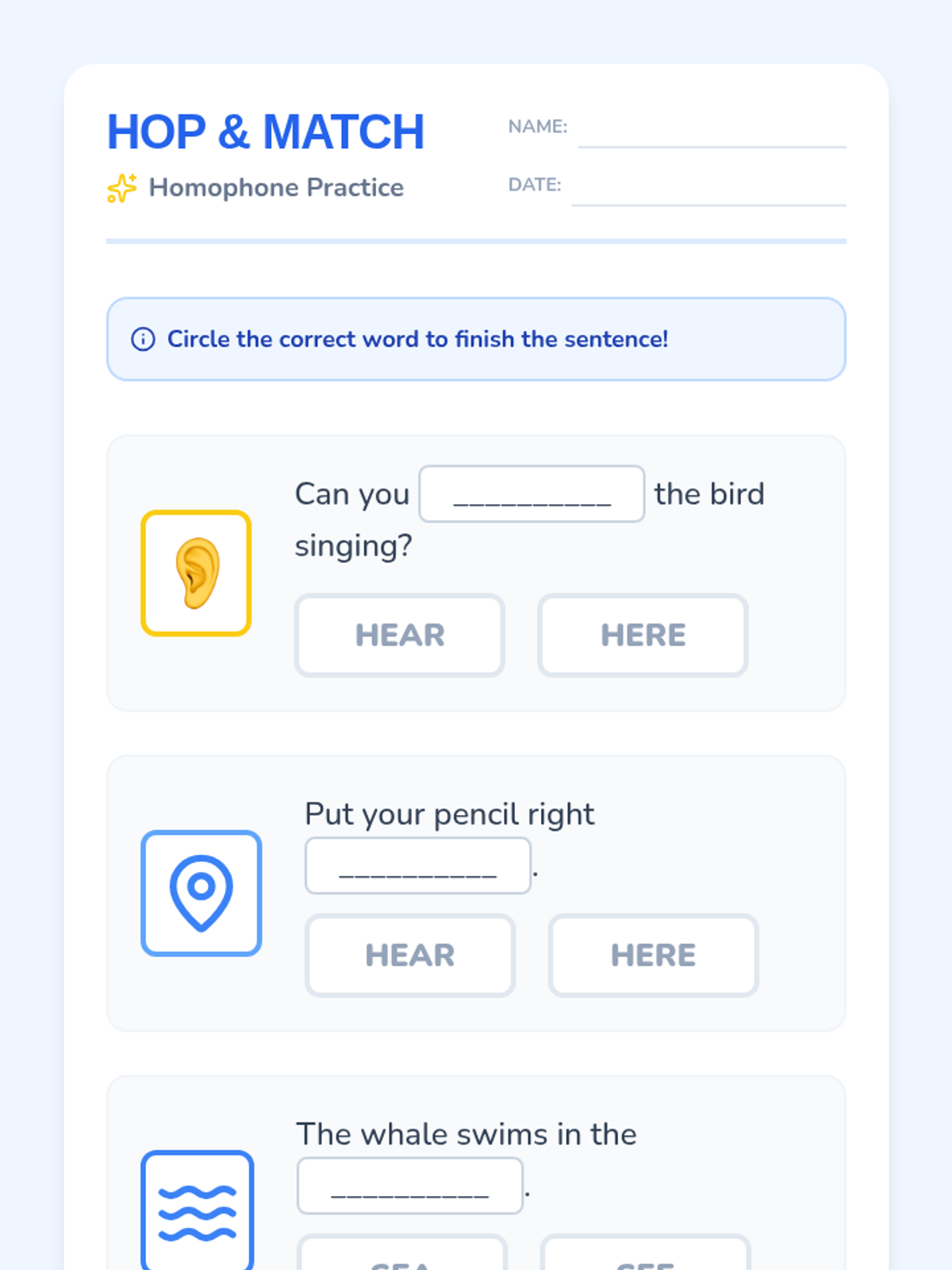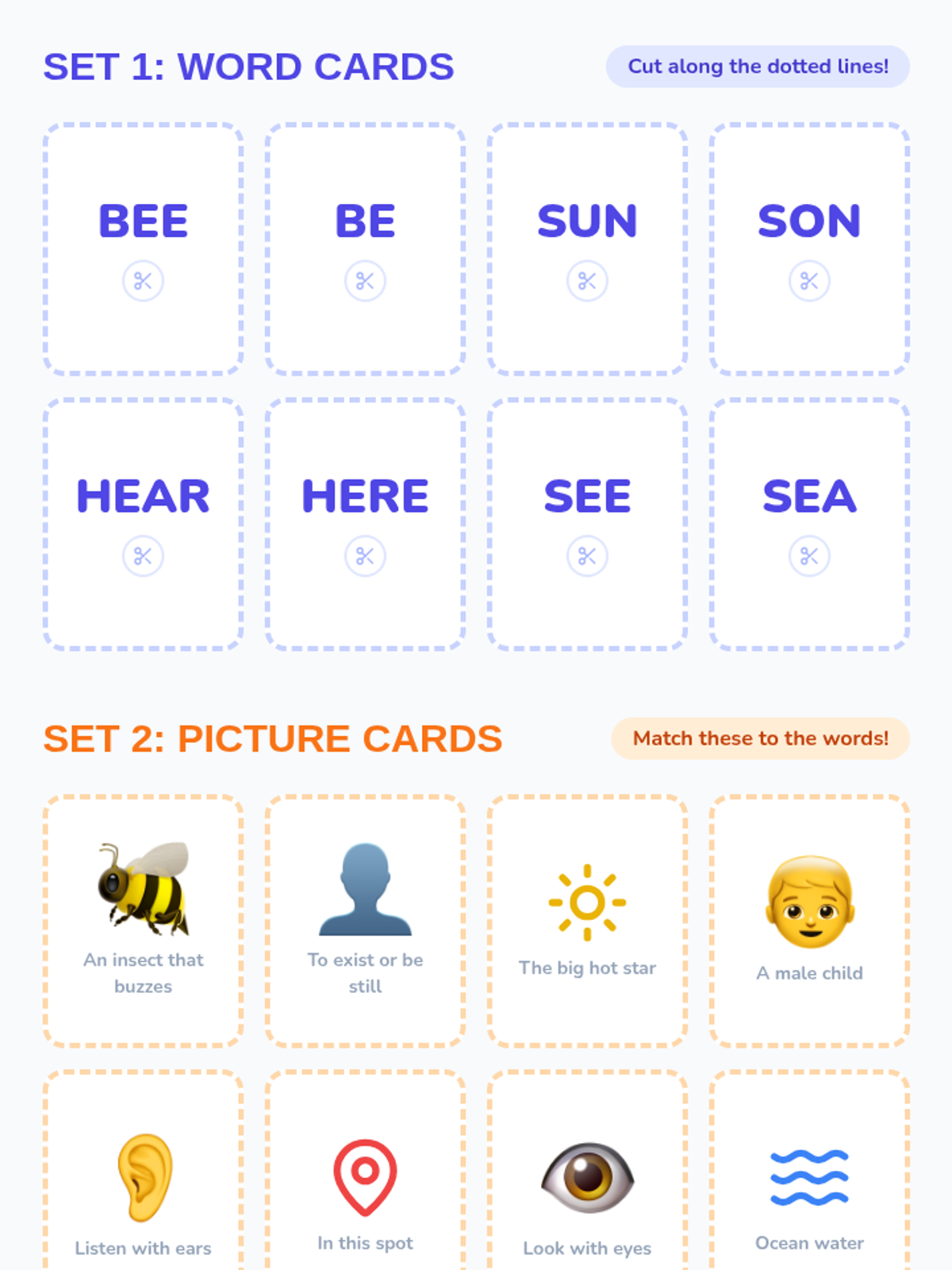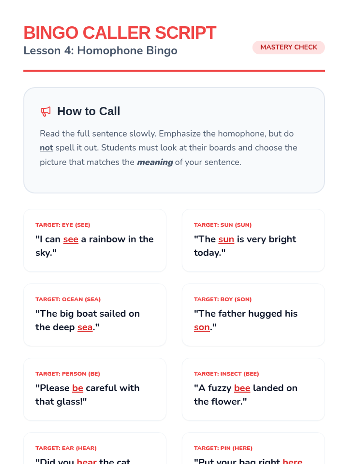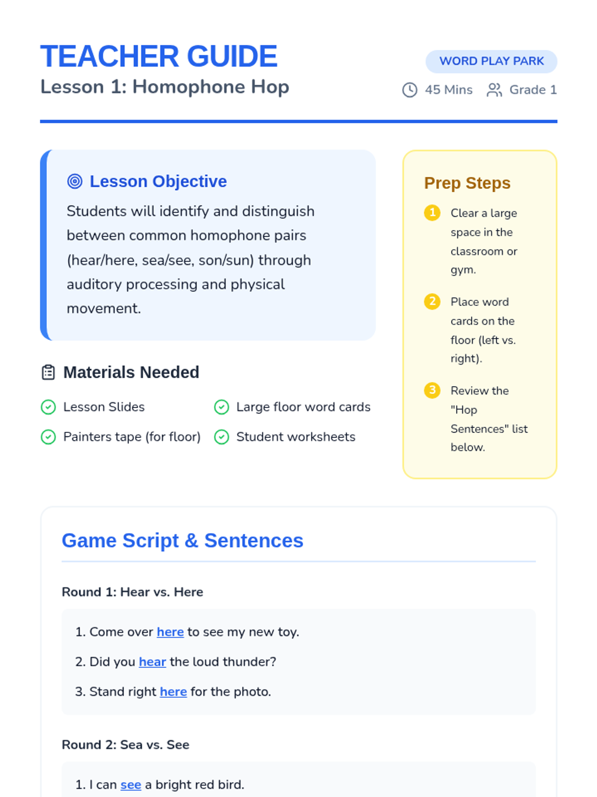 A game-based sequence for 1st graders to master homophones through physical movement, card games, and auditory challenges. Students will learn to distinguish between common pairs like hear/here, be/bee, and sun/son.