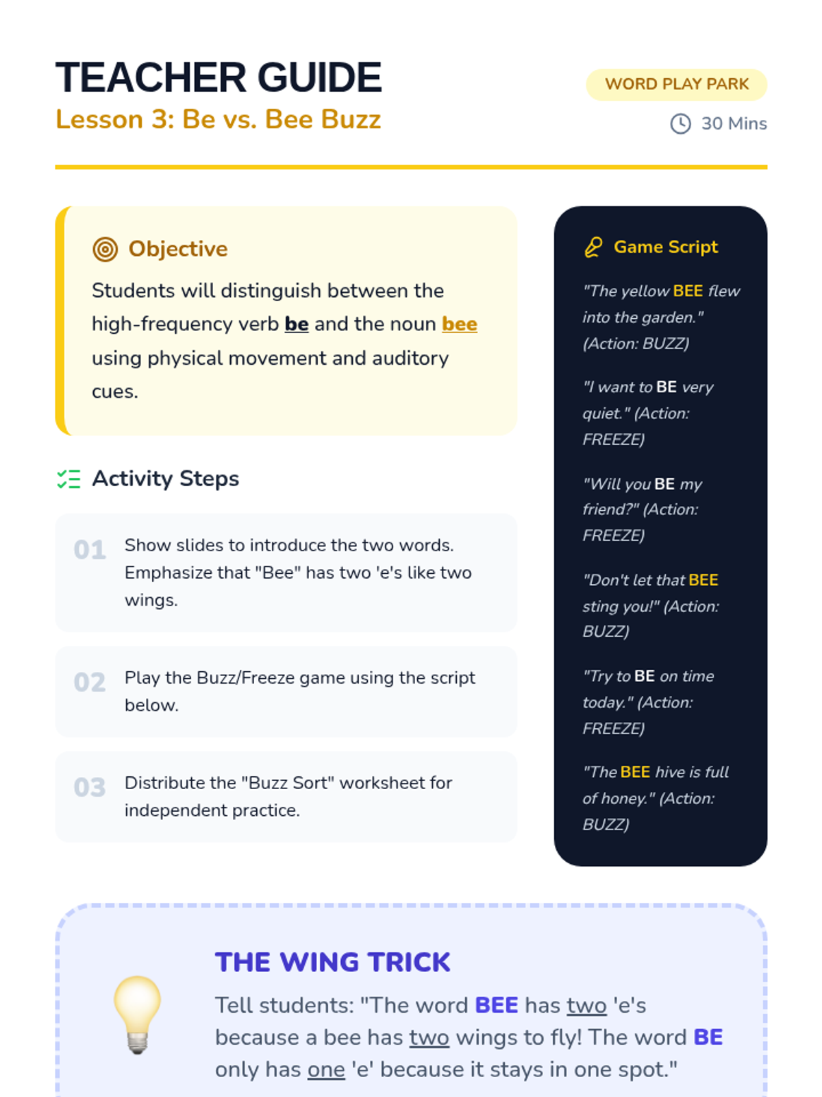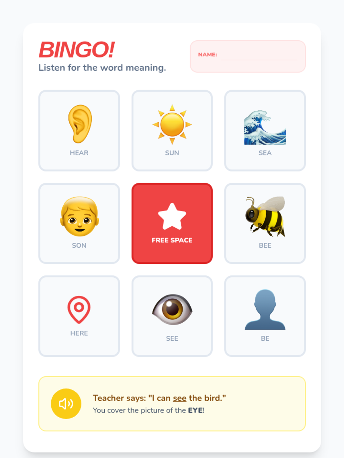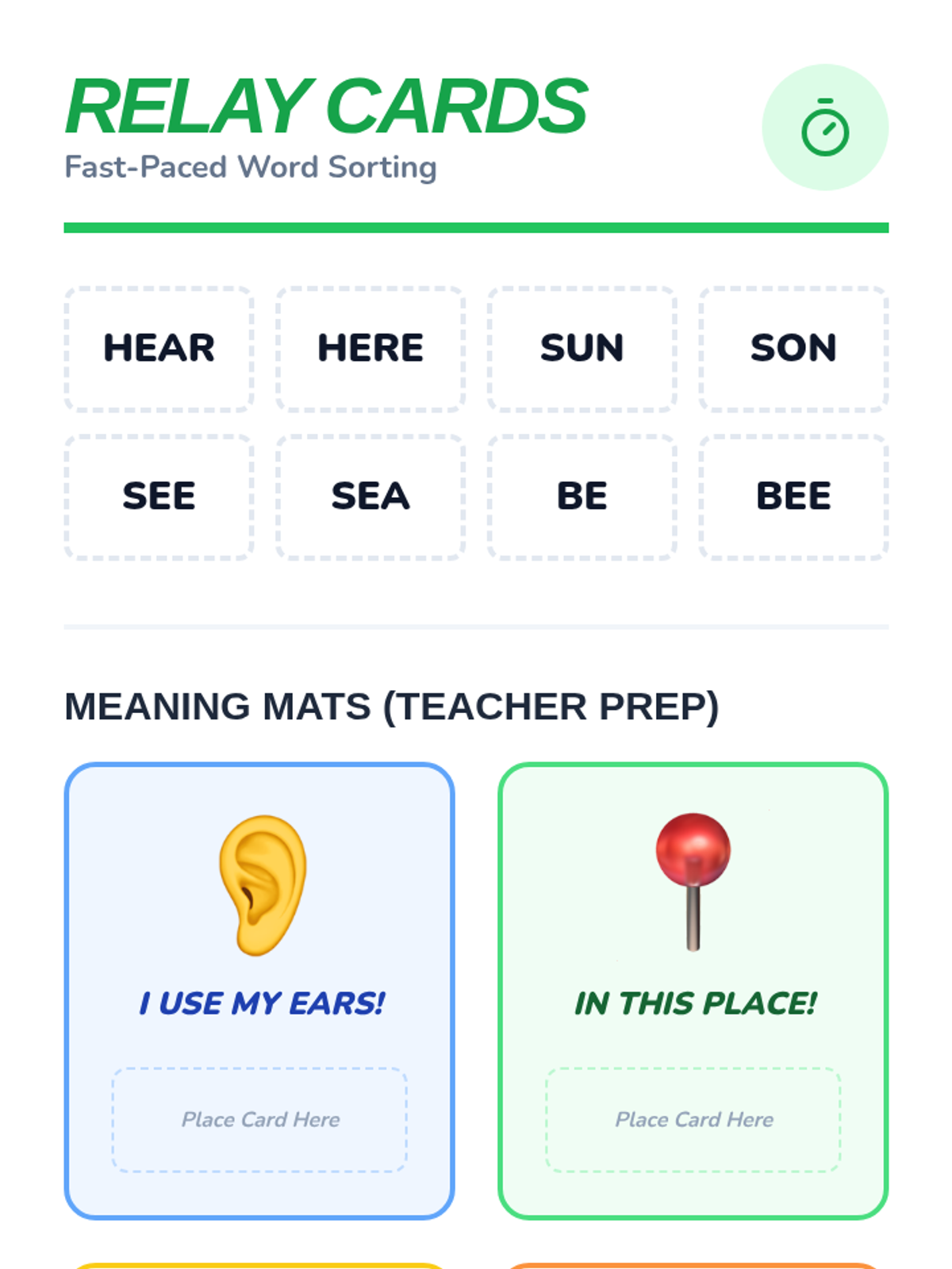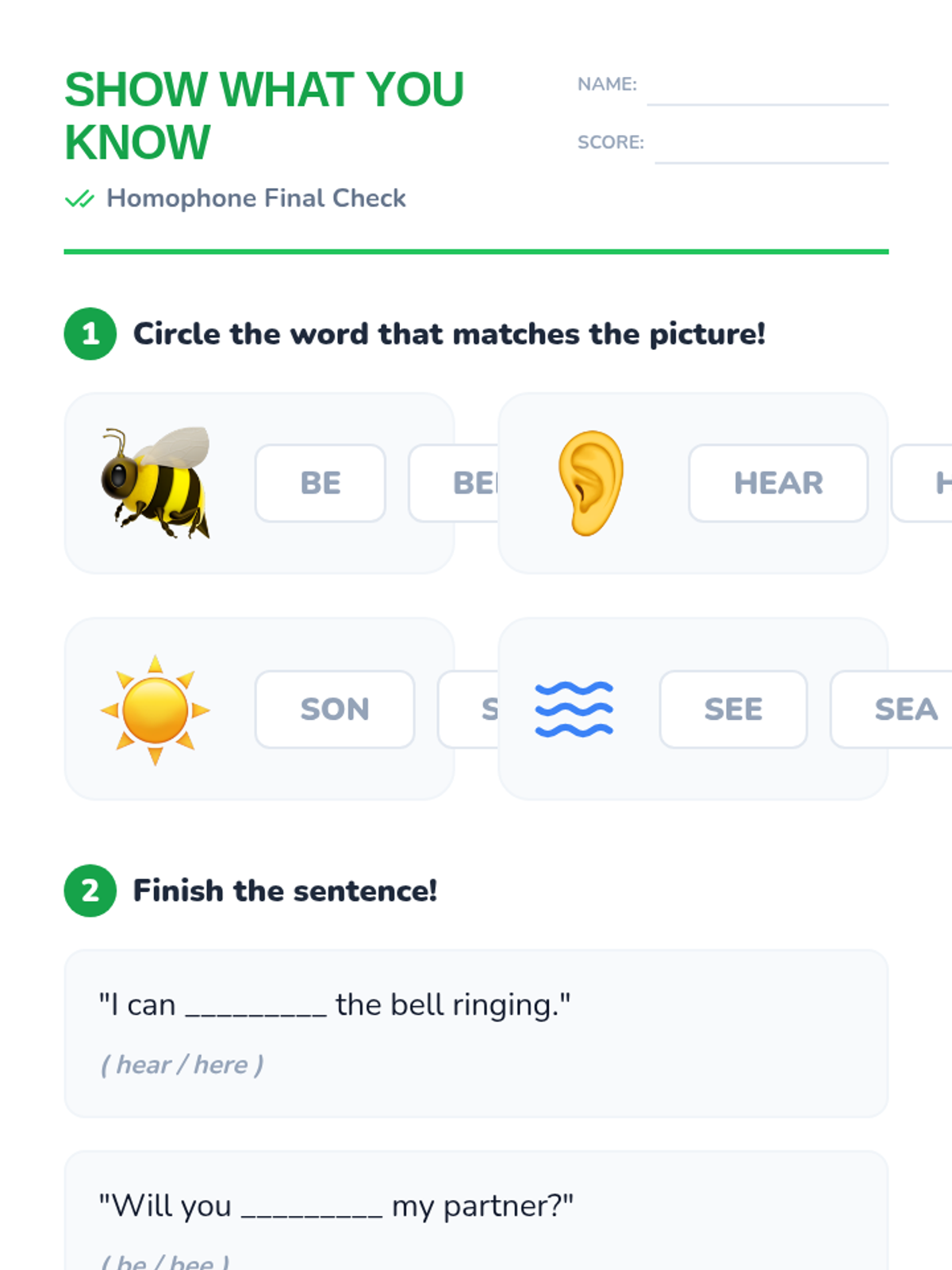 A game-based sequence for 1st graders to master homophones through physical movement, card games, and auditory challenges. Students will learn to distinguish between common pairs like hear/here, be/bee, and sun/son.