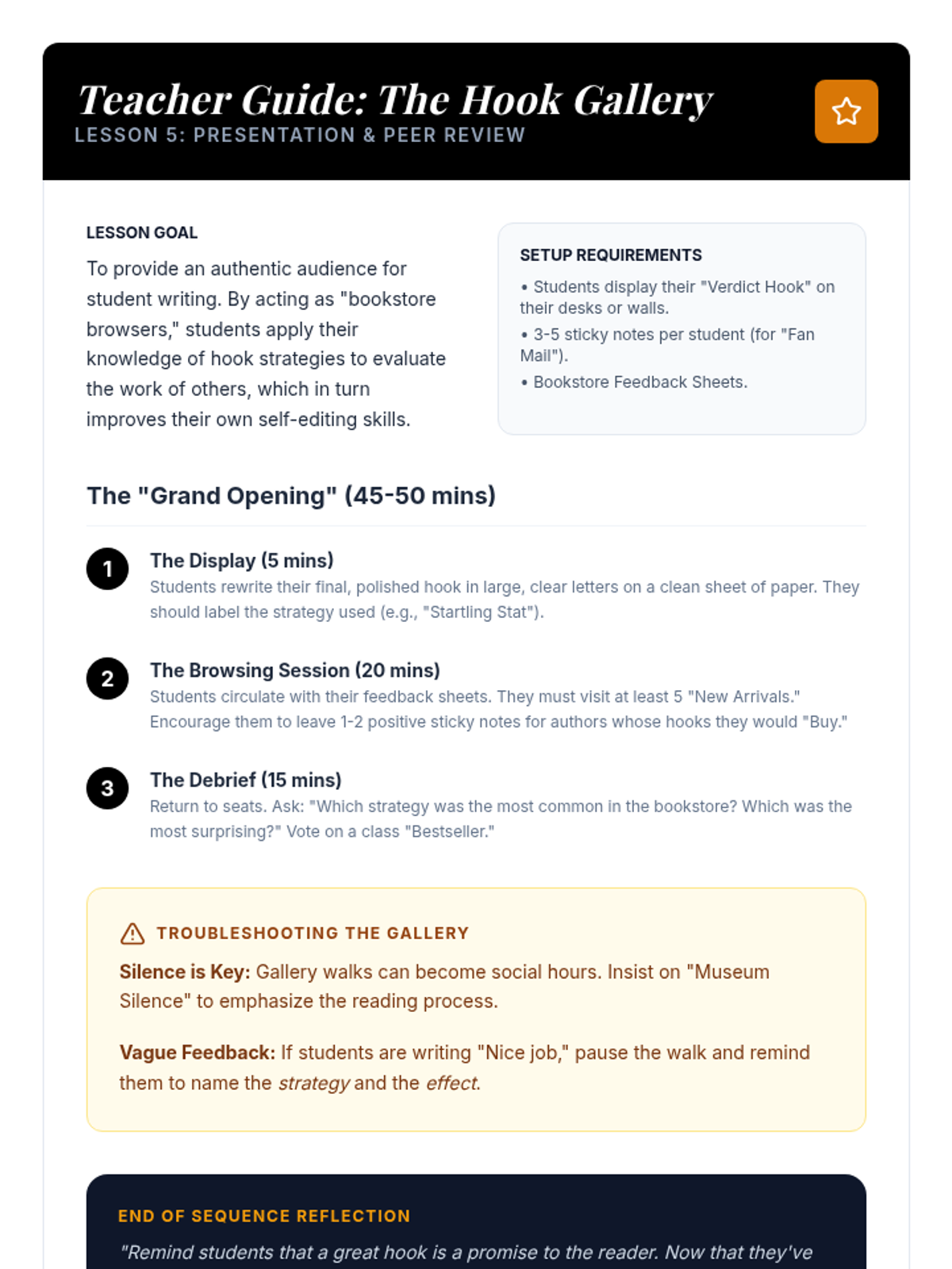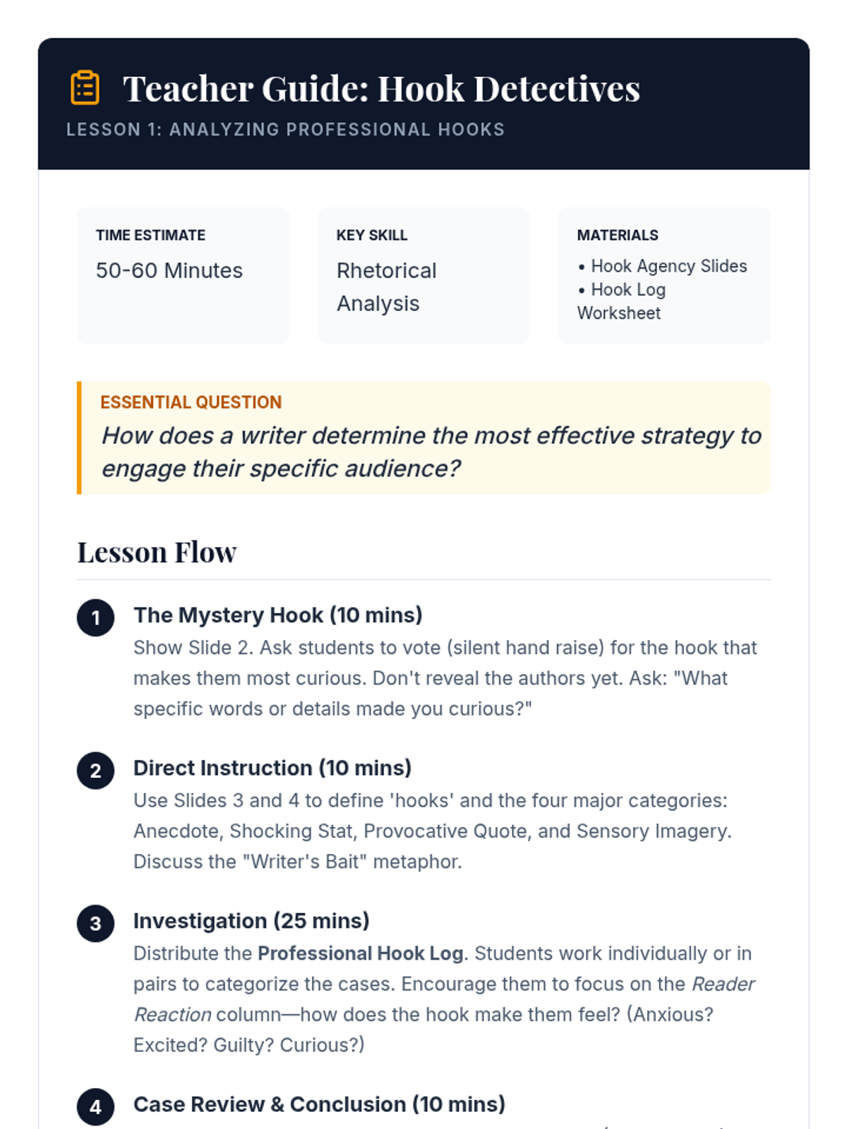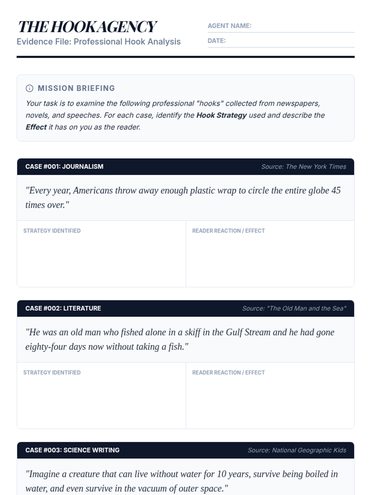 This inquiry-based writing sequence helps 7th-grade students master the art of the 'hook' by analyzing professional examples, experimenting with diverse strategies like anecdotes and statistics, and matching their writing tone to their intended audience.
