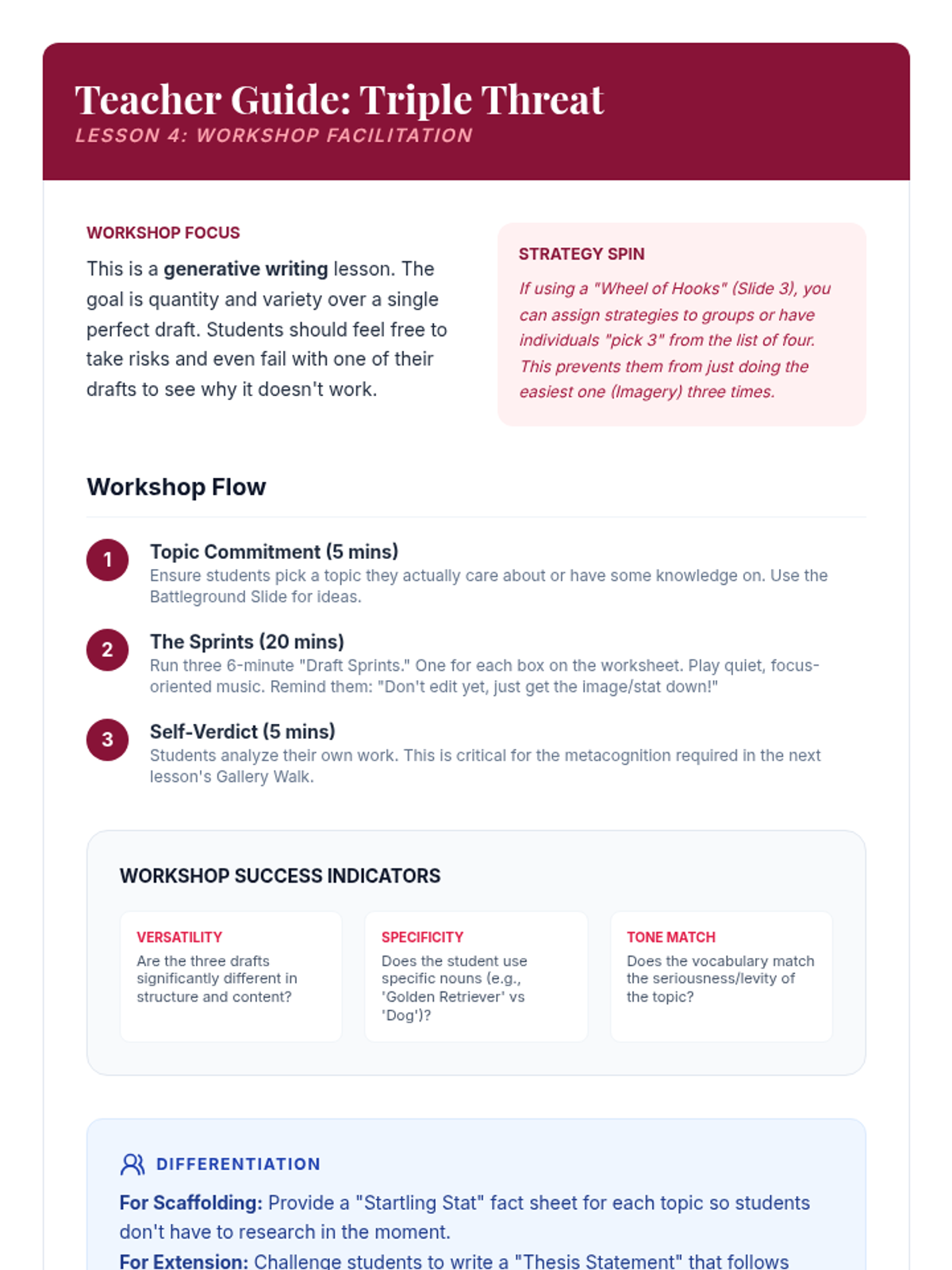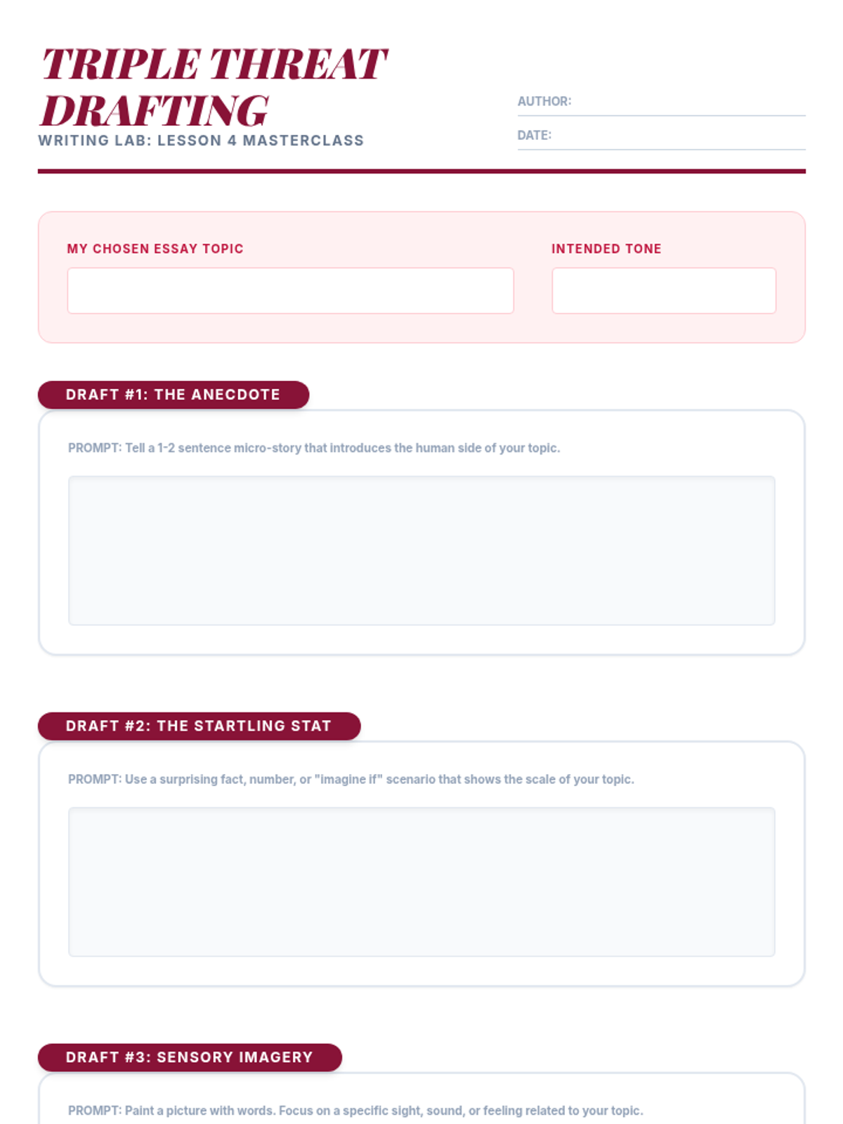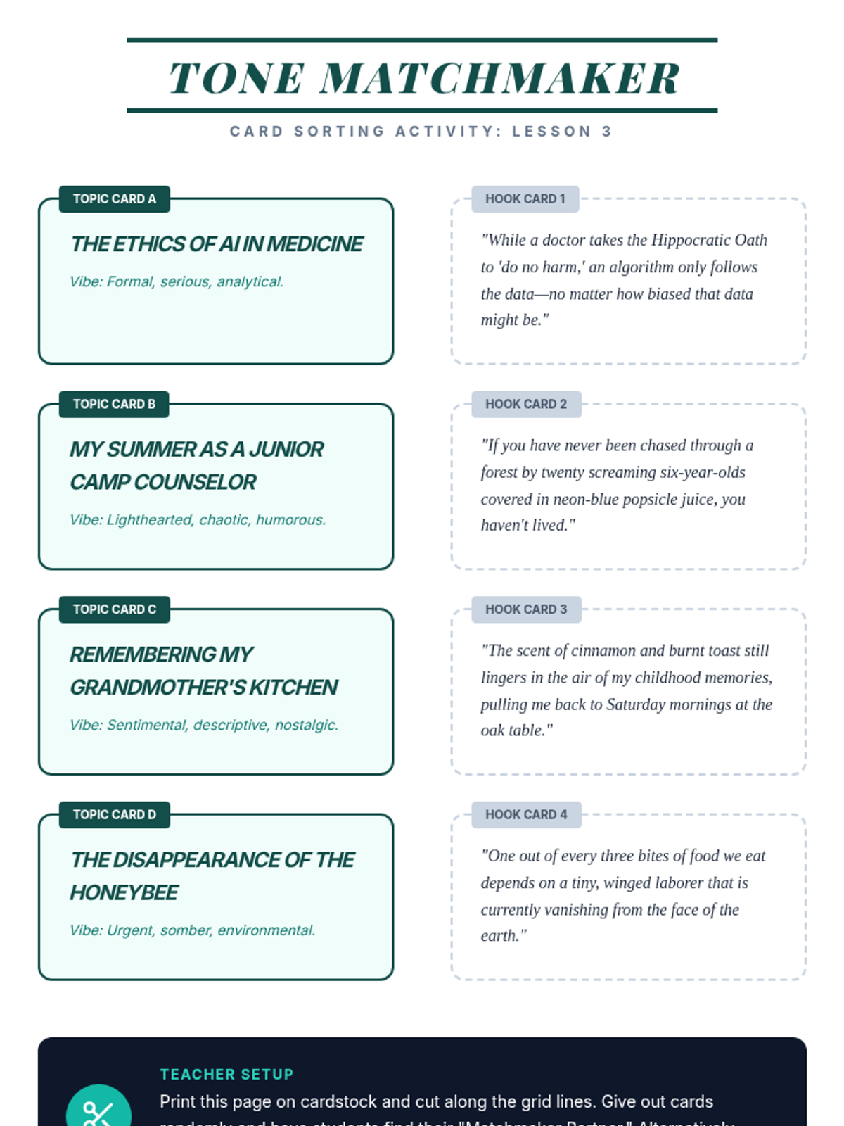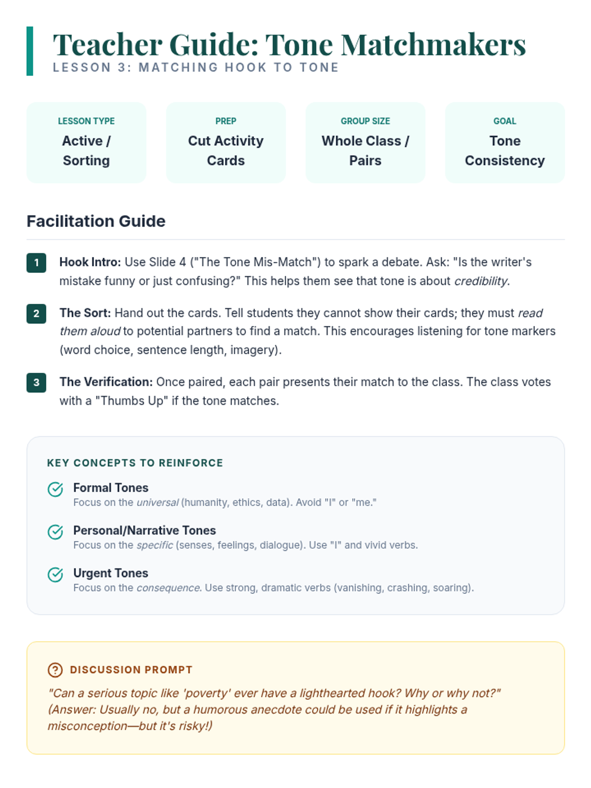 This inquiry-based writing sequence helps 7th-grade students master the art of the 'hook' by analyzing professional examples, experimenting with diverse strategies like anecdotes and statistics, and matching their writing tone to their intended audience.