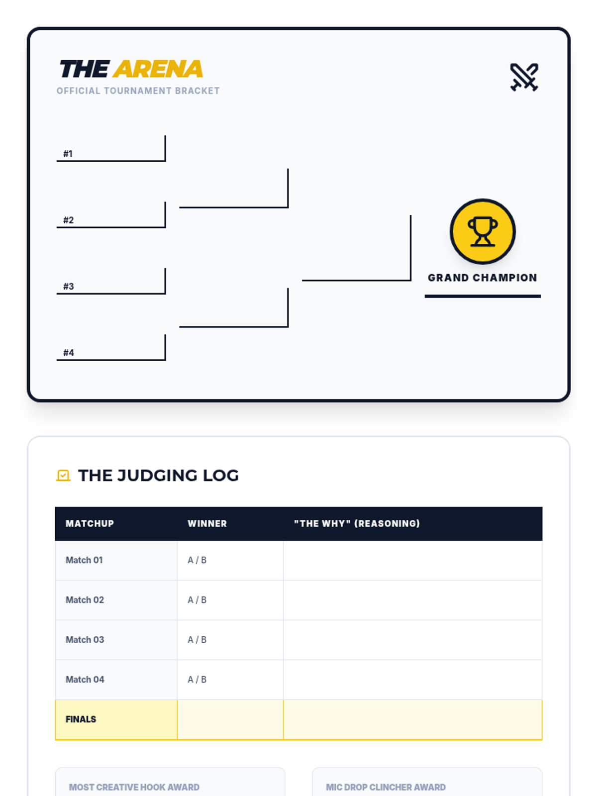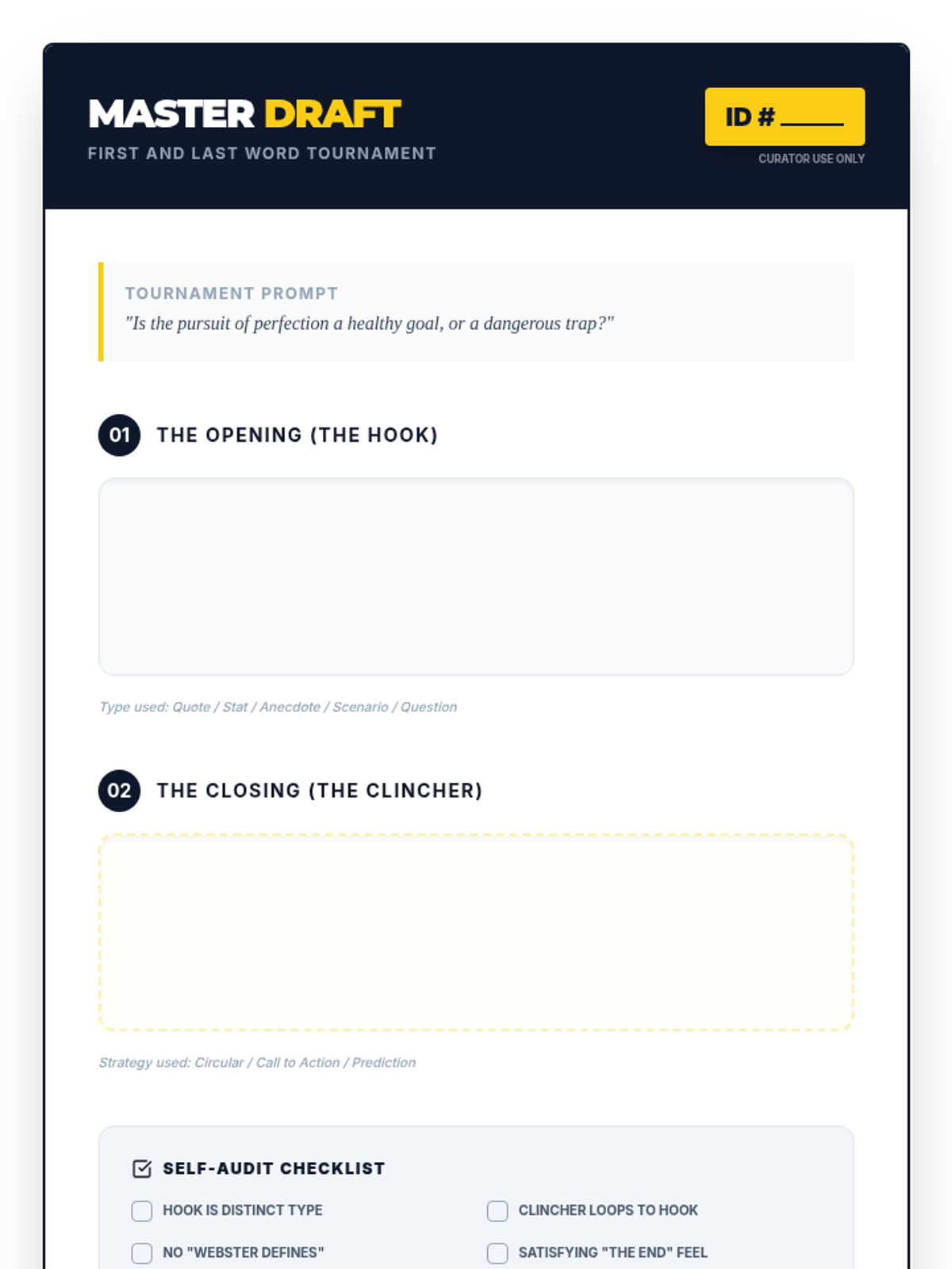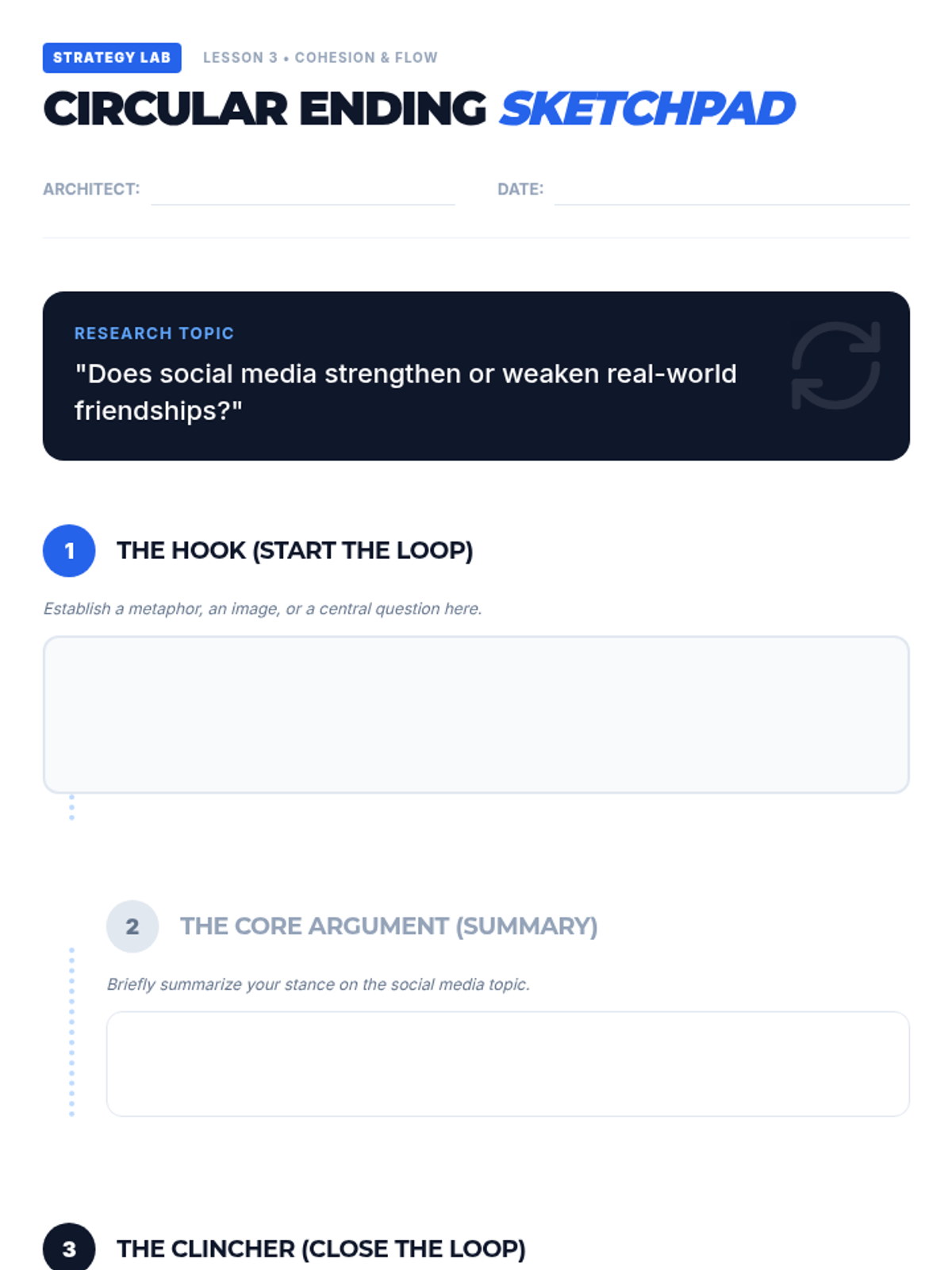 A game-based sequence designed to eliminate boring introductions and flat conclusions. Students experiment with different 'flavors' of hooks and clinchers through rapid-fire writing challenges, eventually competing in a tournament to crown the most compelling essay 'bookends'.