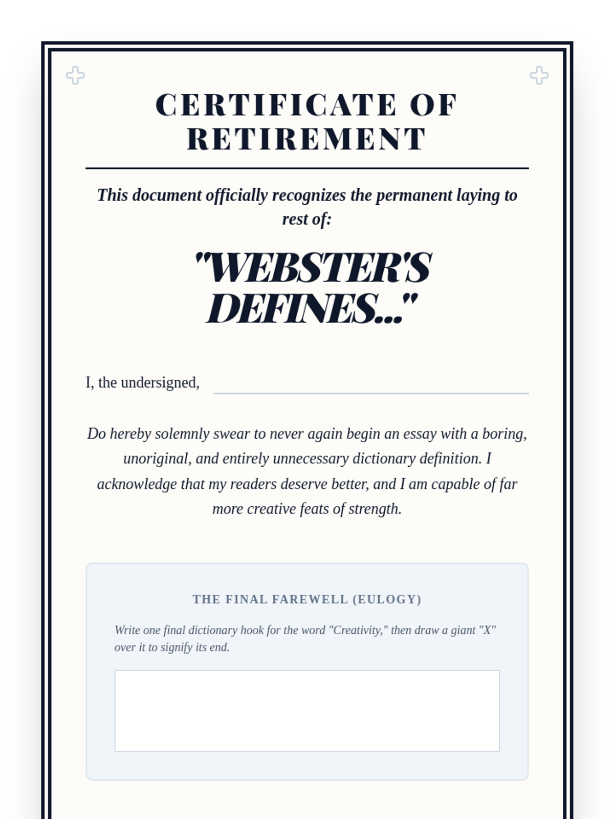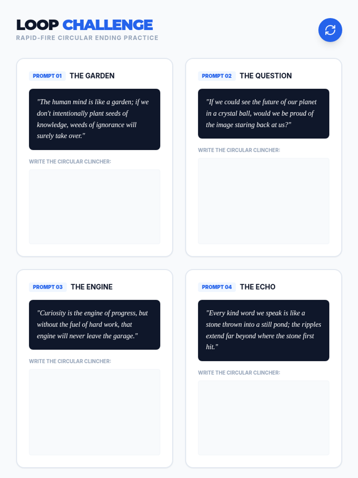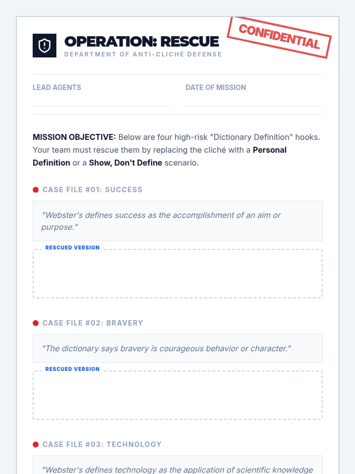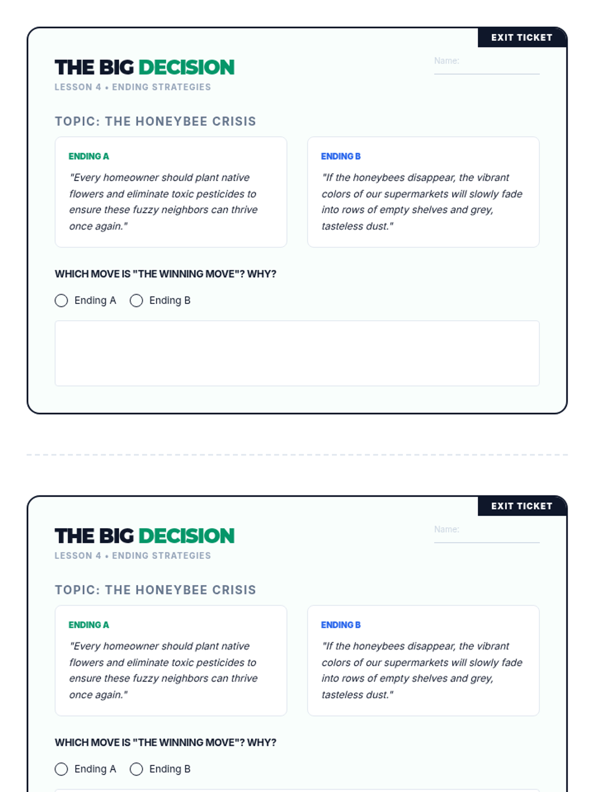 A game-based sequence designed to eliminate boring introductions and flat conclusions. Students experiment with different 'flavors' of hooks and clinchers through rapid-fire writing challenges, eventually competing in a tournament to crown the most compelling essay 'bookends'.