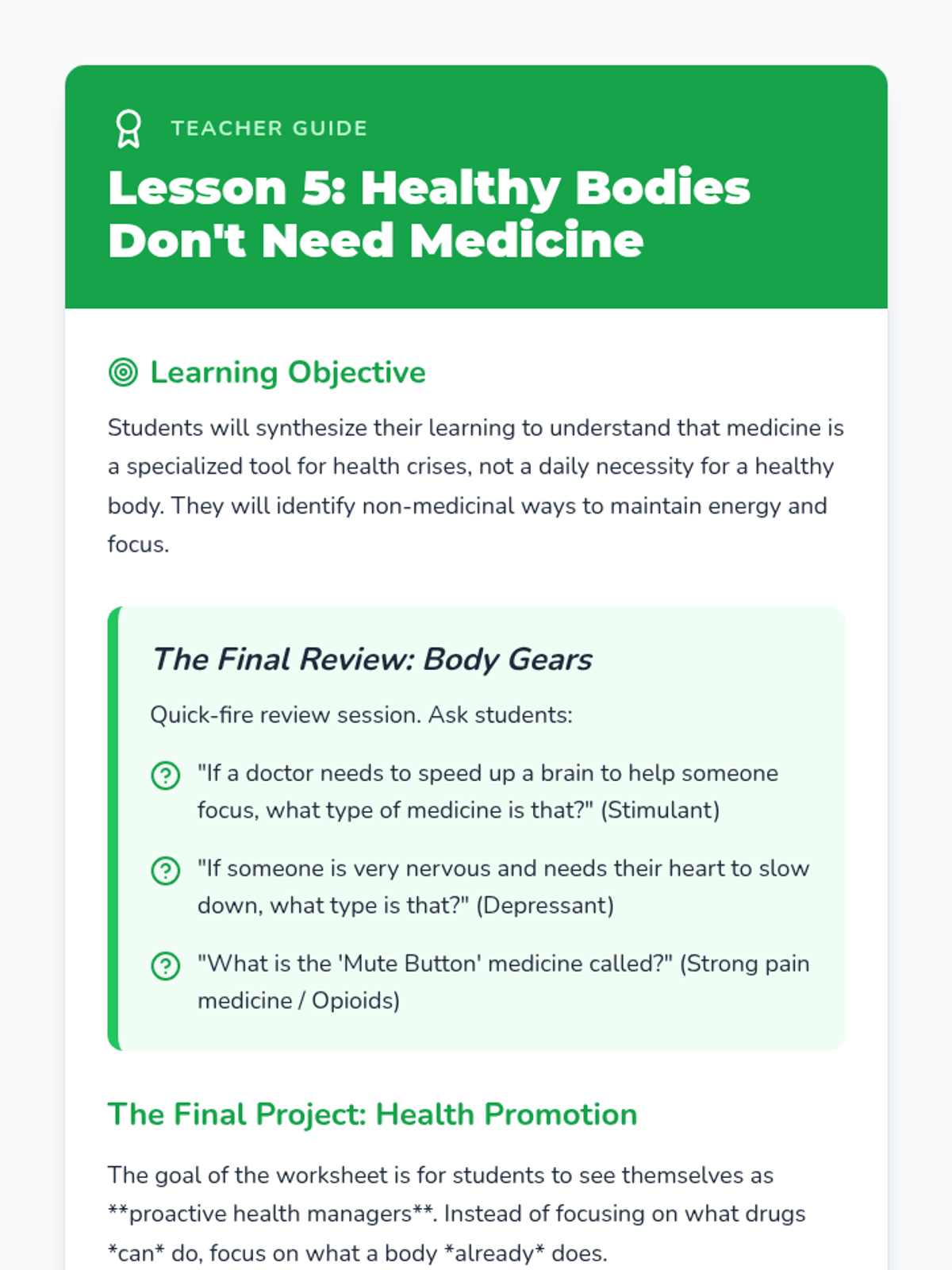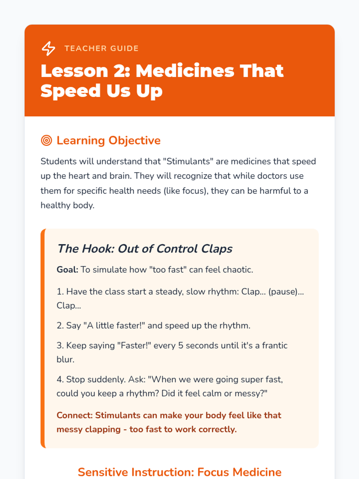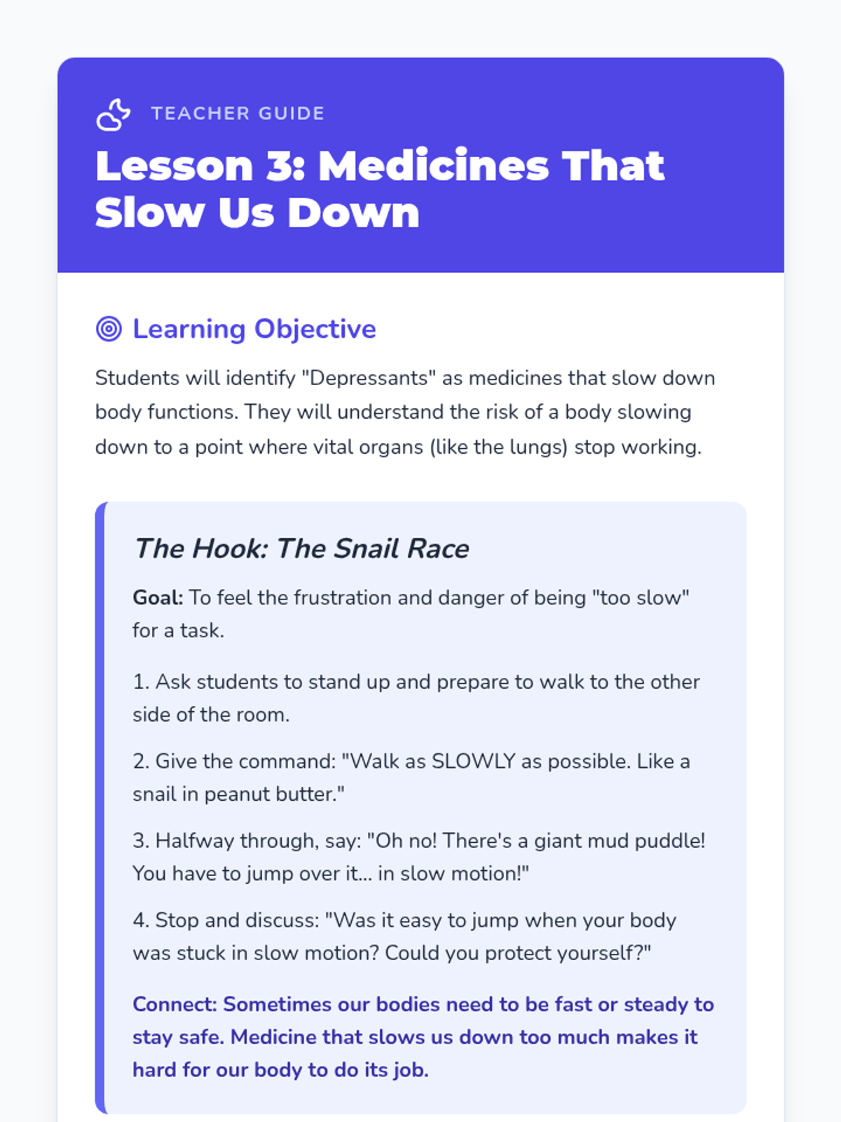 A 2nd-grade sequence exploring how different types of medicines (stimulants, depressants, and opioids) affect body systems, establishing a respect for drug potency and personal health.