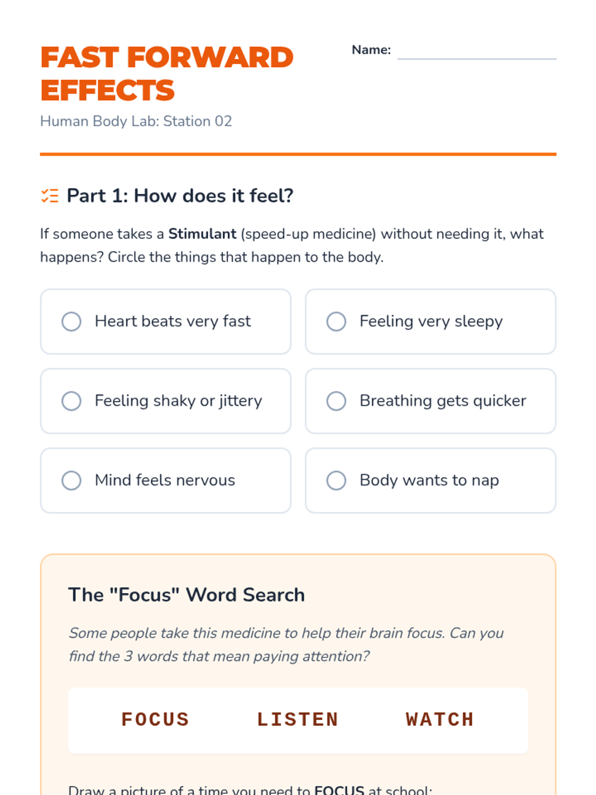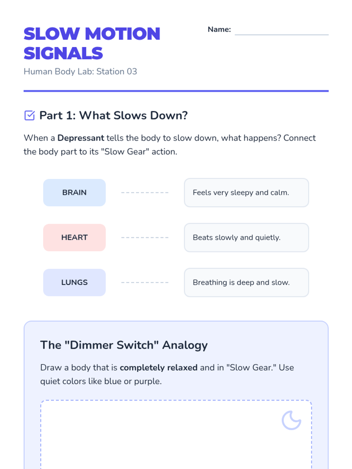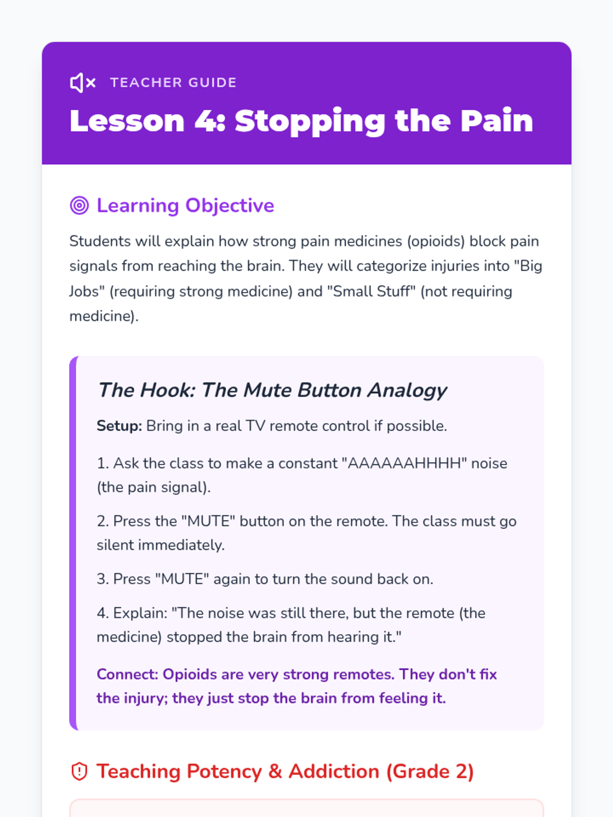 A 2nd-grade sequence exploring how different types of medicines (stimulants, depressants, and opioids) affect body systems, establishing a respect for drug potency and personal health.