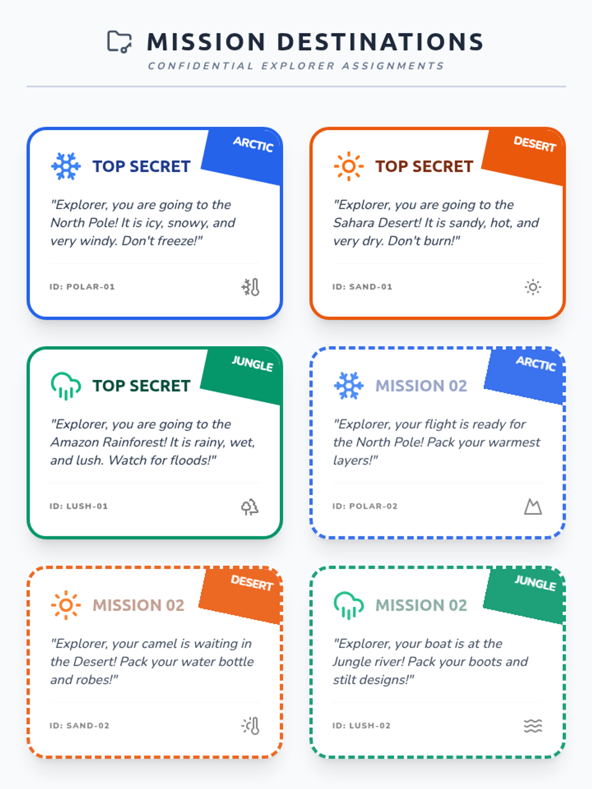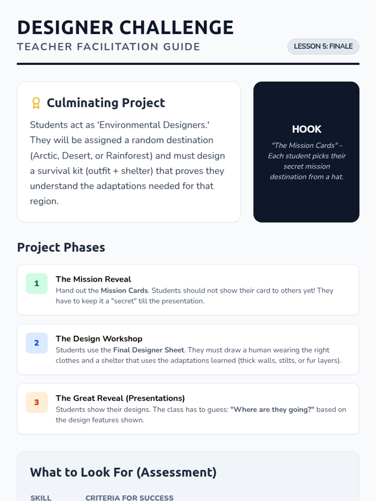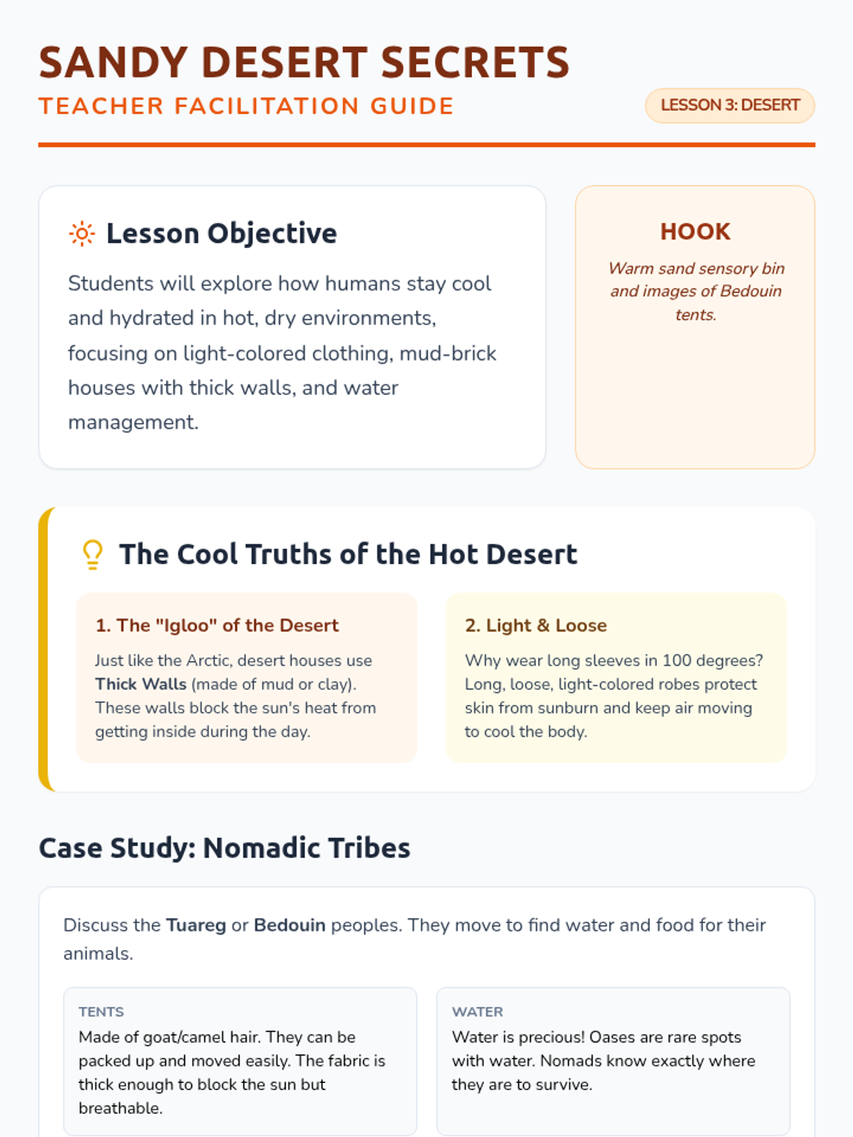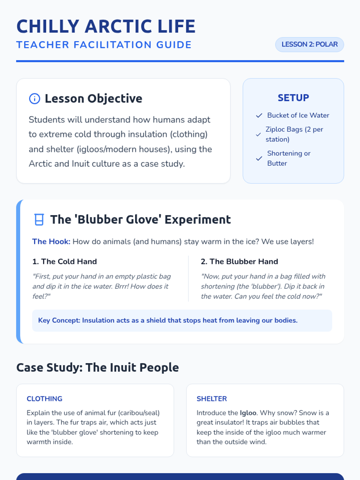 A 1st Grade geography sequence where students investigate how humans adapt to polar, desert, and rainforest environments through clothing, shelter, and resources.
