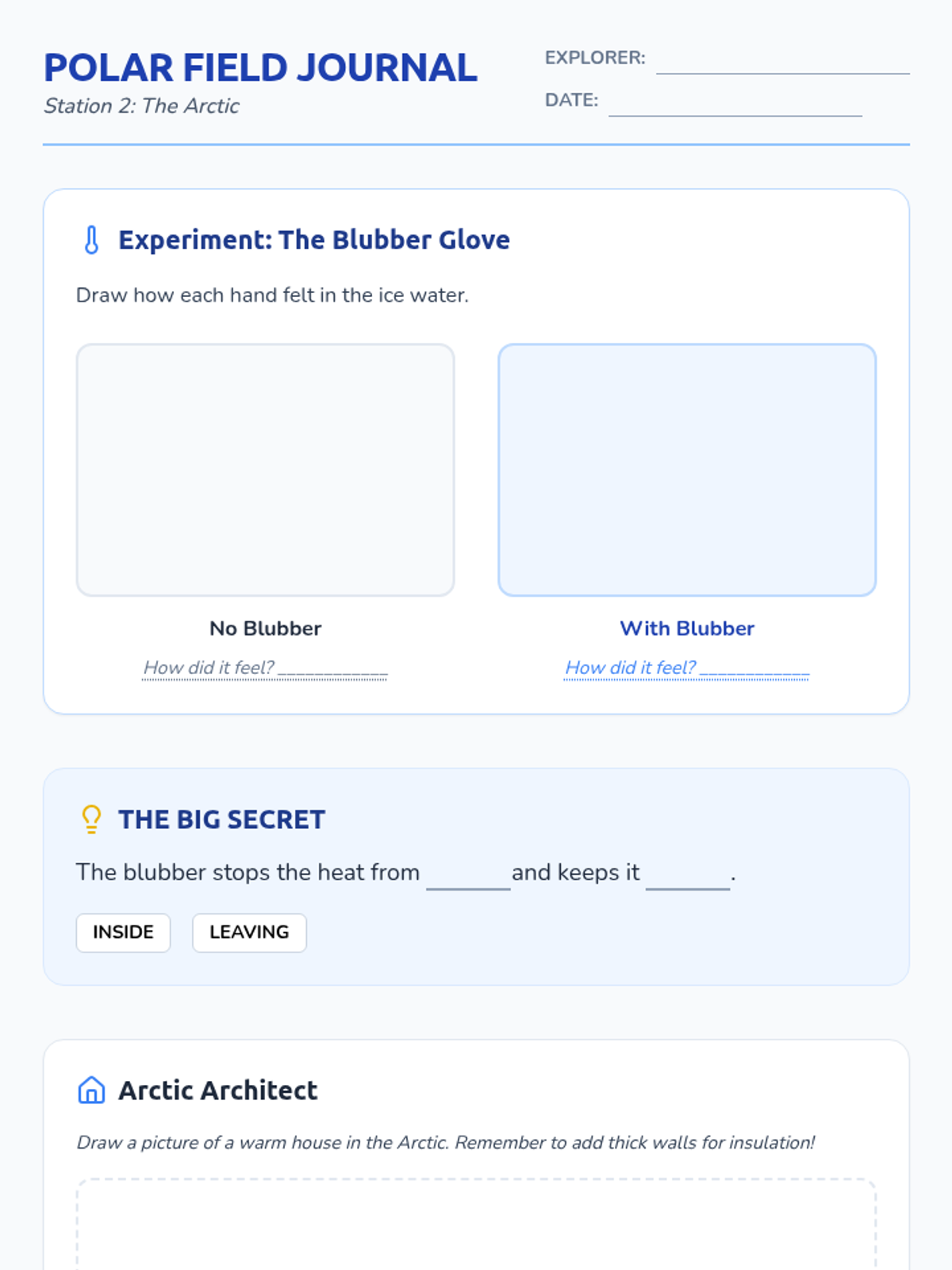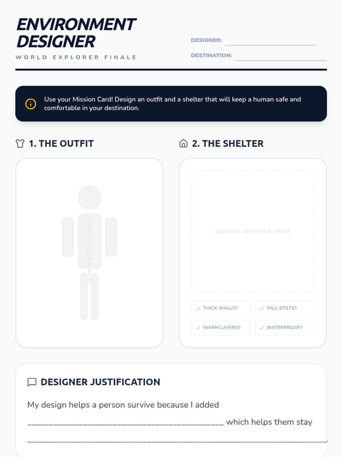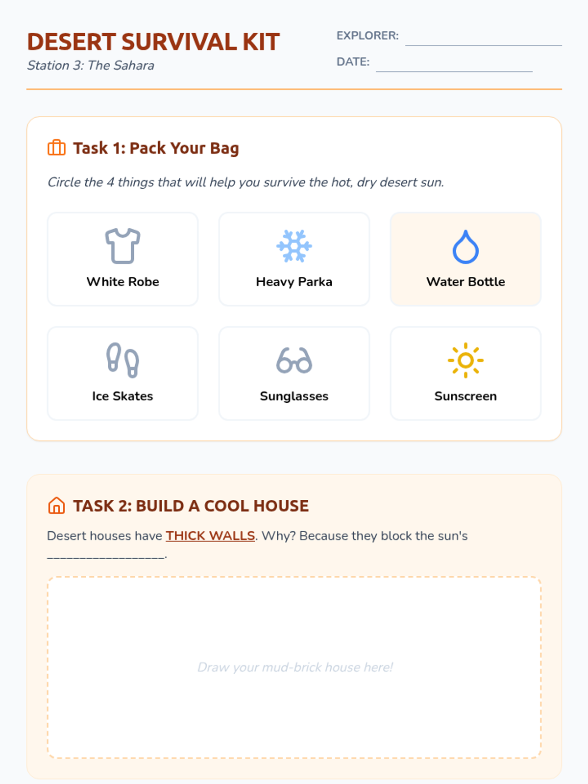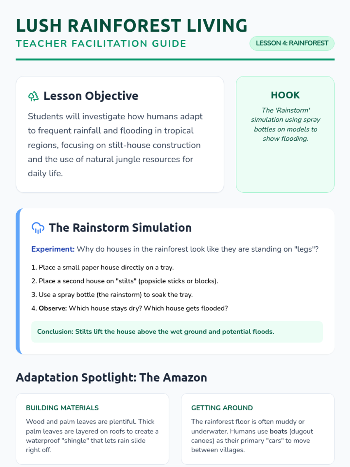 A 1st Grade geography sequence where students investigate how humans adapt to polar, desert, and rainforest environments through clothing, shelter, and resources.