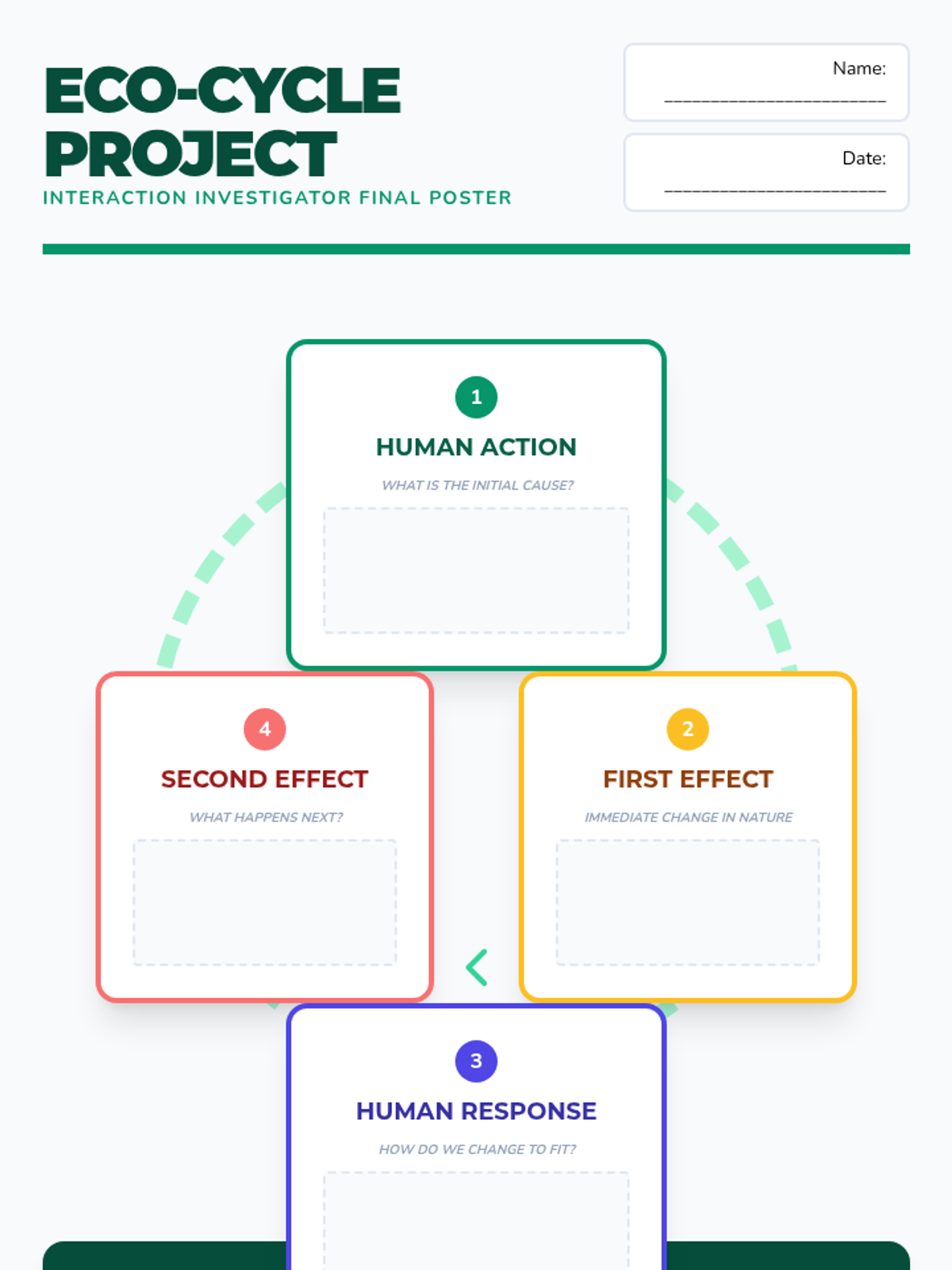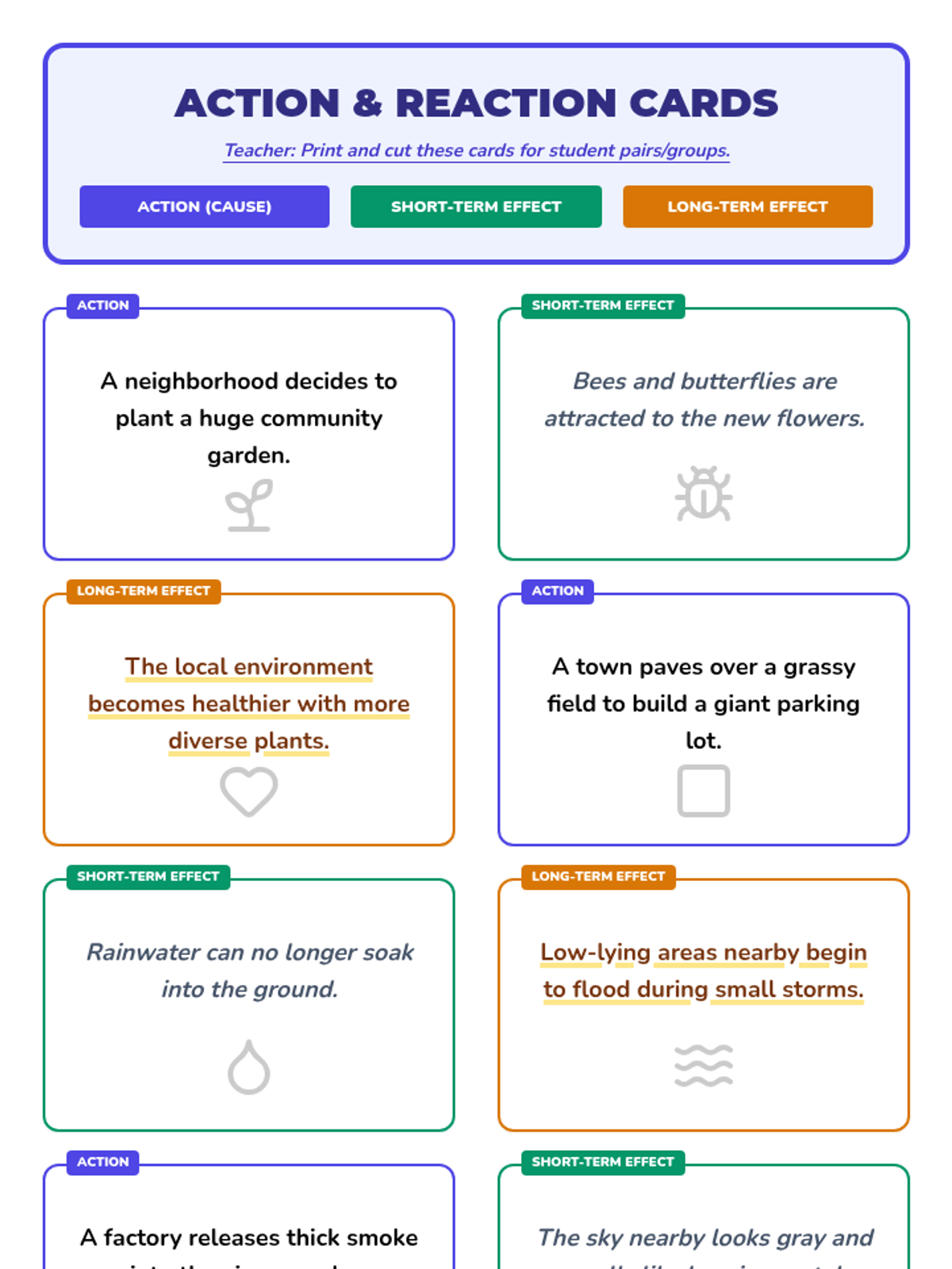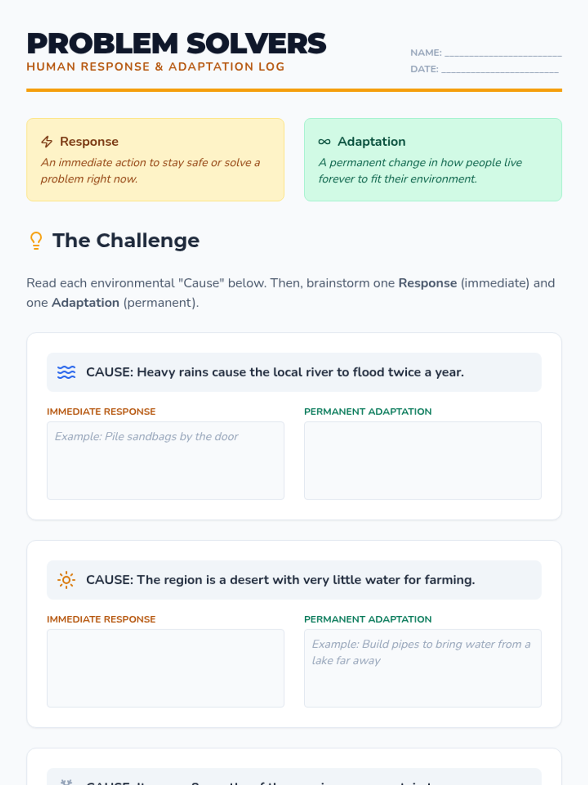 This 3rd-grade sequence explores the concepts of chronology and causation through the lens of human-environmental interactions. Students investigate how natural events trigger human responses and how human actions in turn impact the environment, culminating in an understanding of complex causal systems.