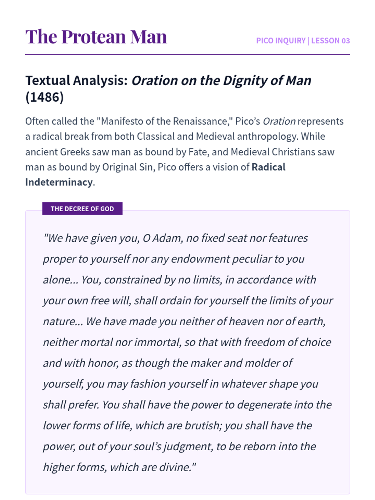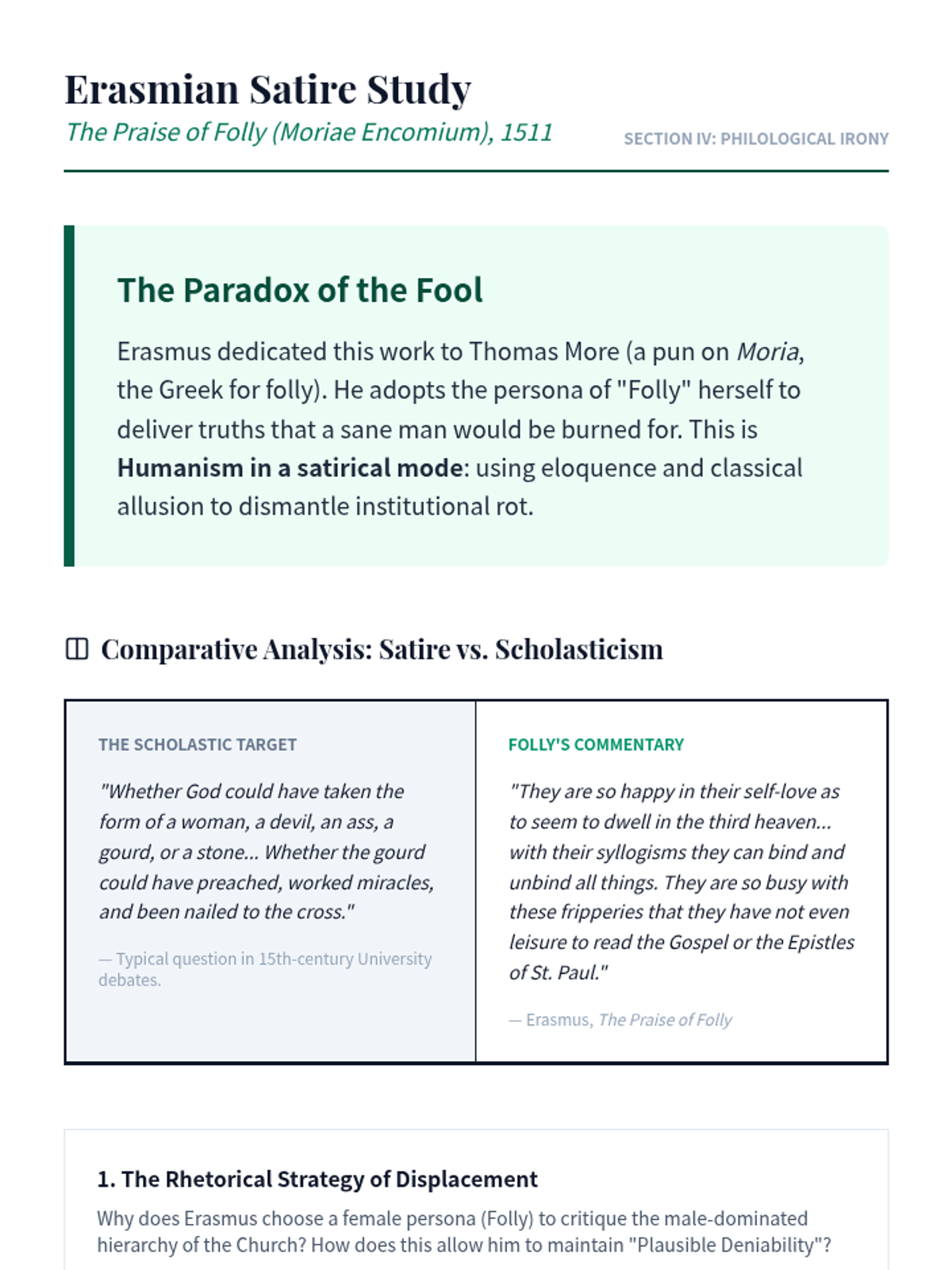 A graduate-level investigation into the intellectual foundations of the Renaissance, exploring the evolution of Humanism from Petrarch's philological 'ad fontes' movement to Machiavelli's political realism. Students analyze the tension between classical revival and Christian tradition, focusing on key figures like Bruni, Pico della Mirandola, and Erasmus.