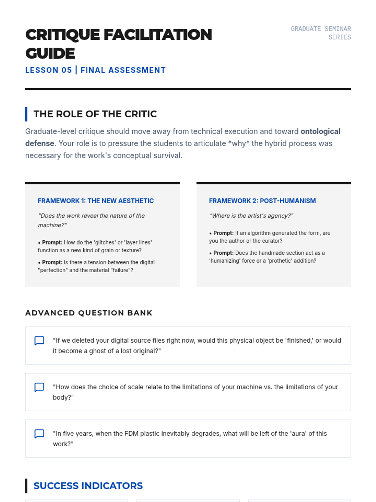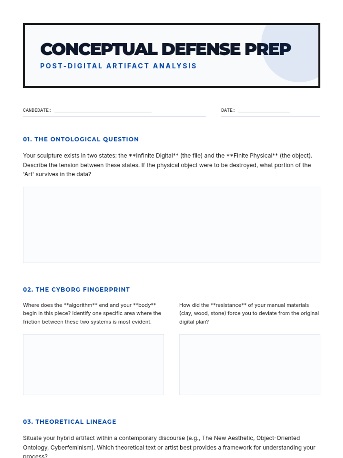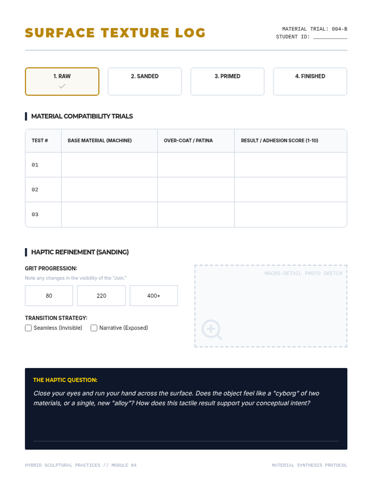A graduate-level exploration of the 'post-digital' landscape in sculpture, bridging digital fabrication (3D scanning, printing, CNC) with traditional material practices. Students interrogate the relationship between the algorithmic and the handmade through a hybrid sculptural project.