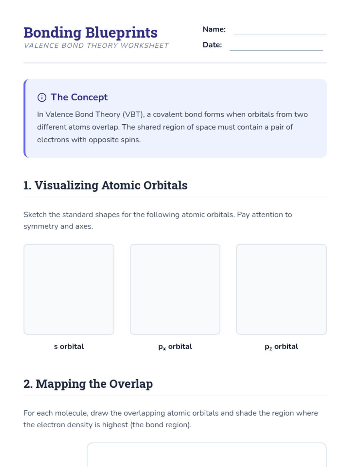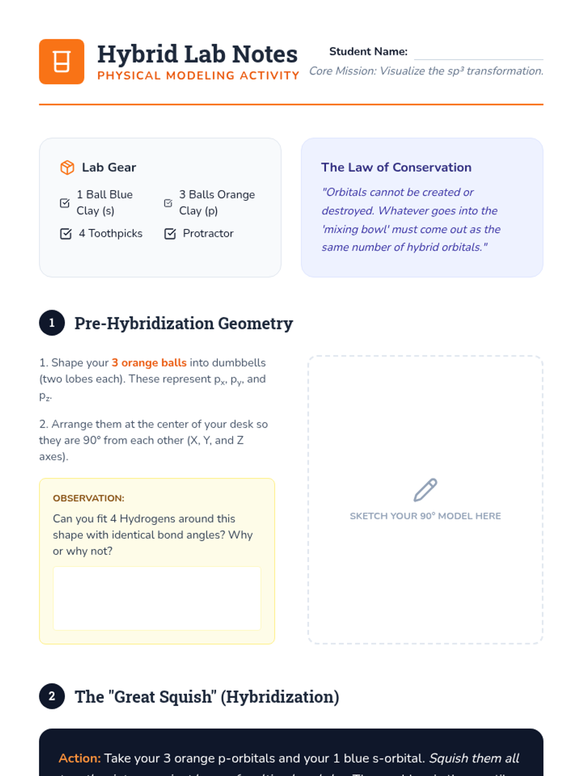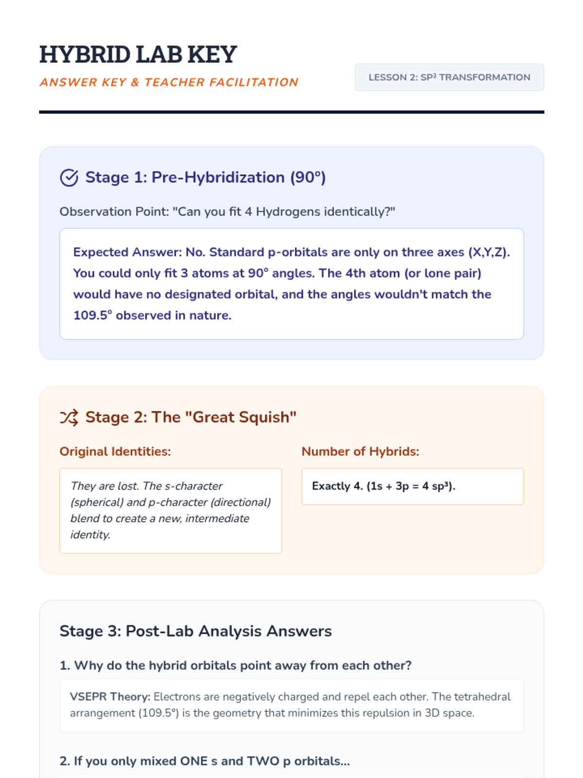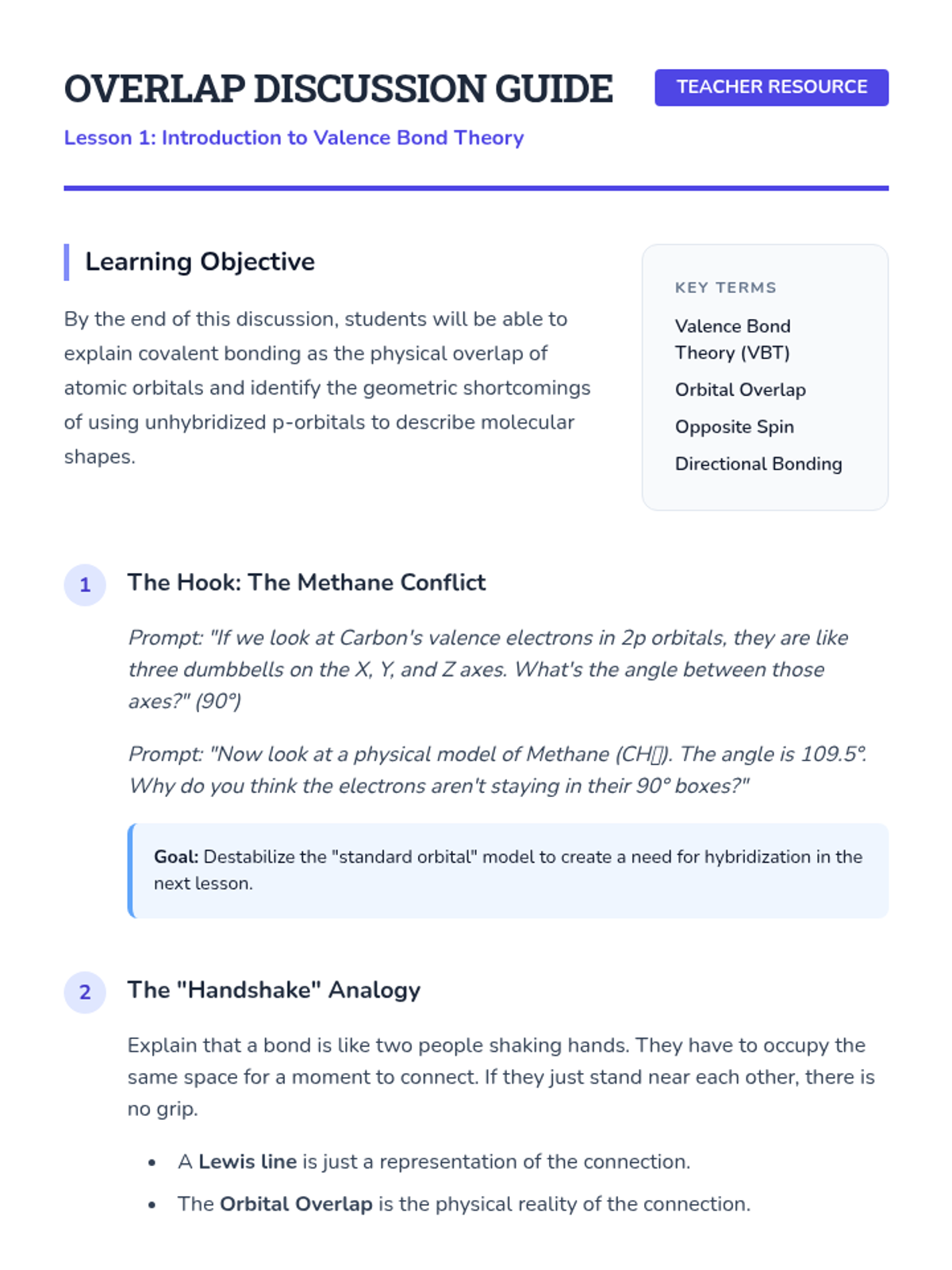 This sequence explores the quantum mechanical explanation of covalent bonding through Valence Bond Theory and hybridization. Students transition from simple Lewis structures to a 3D understanding of orbital overlap, hybrid orbital formation (sp, sp2, sp3), and the distinction between sigma and pi bonds, concluding with an introduction to electron delocalization.