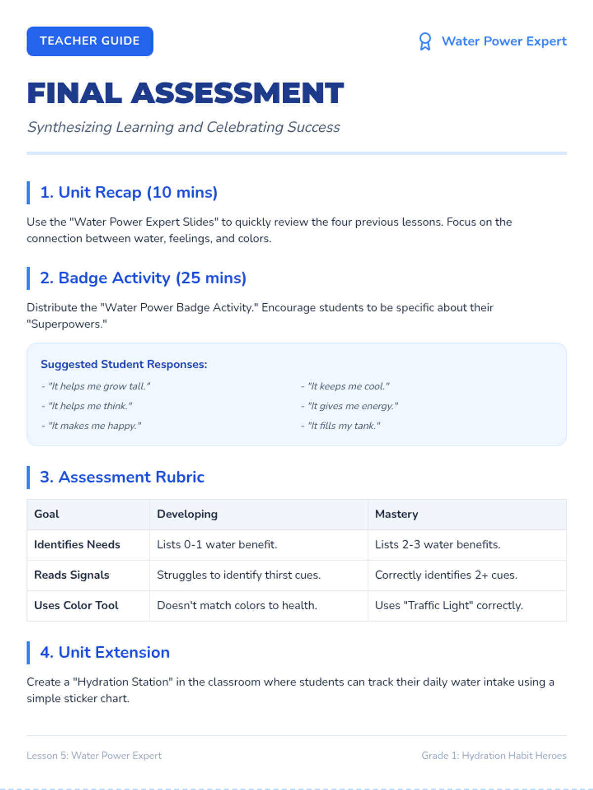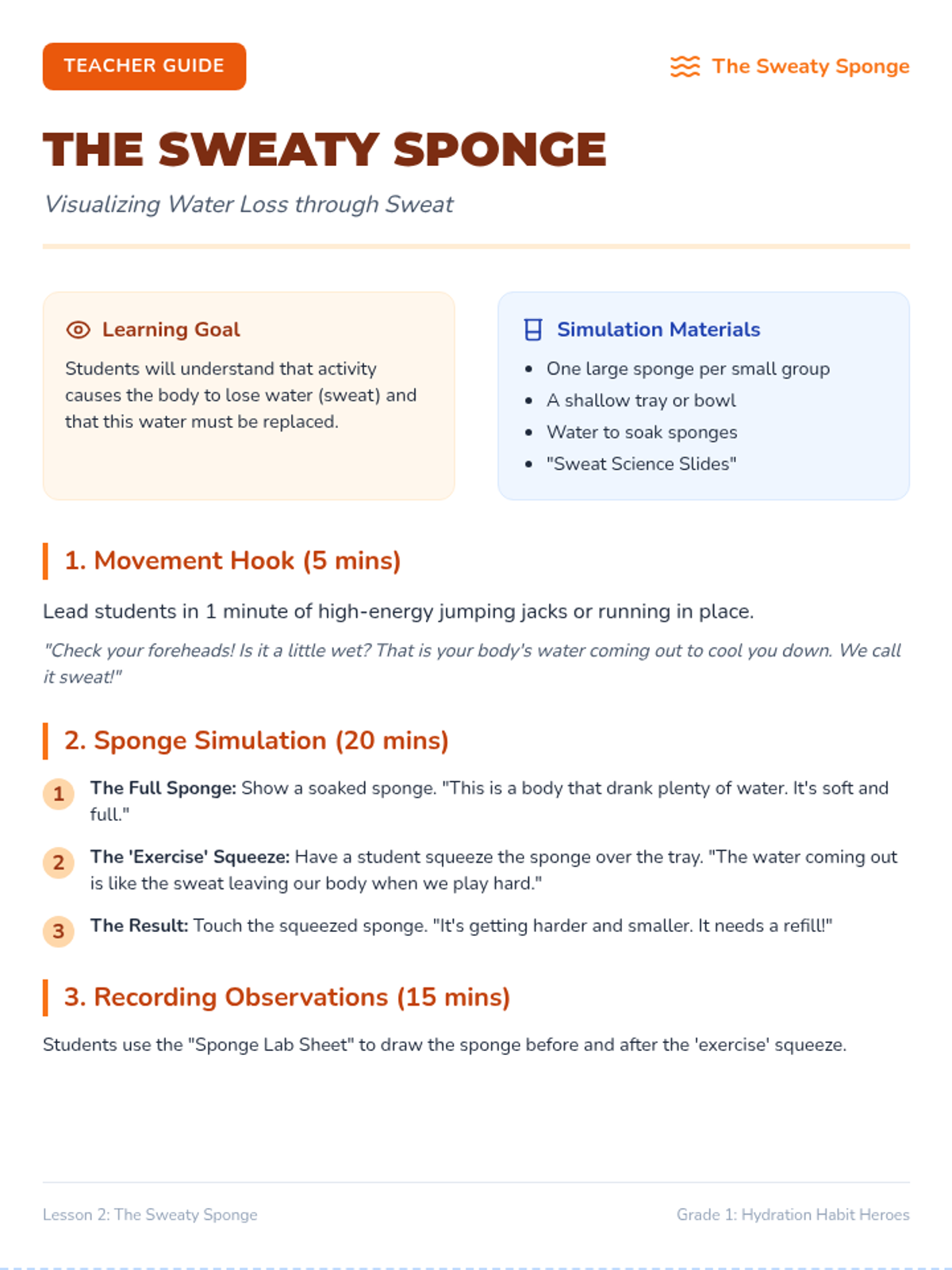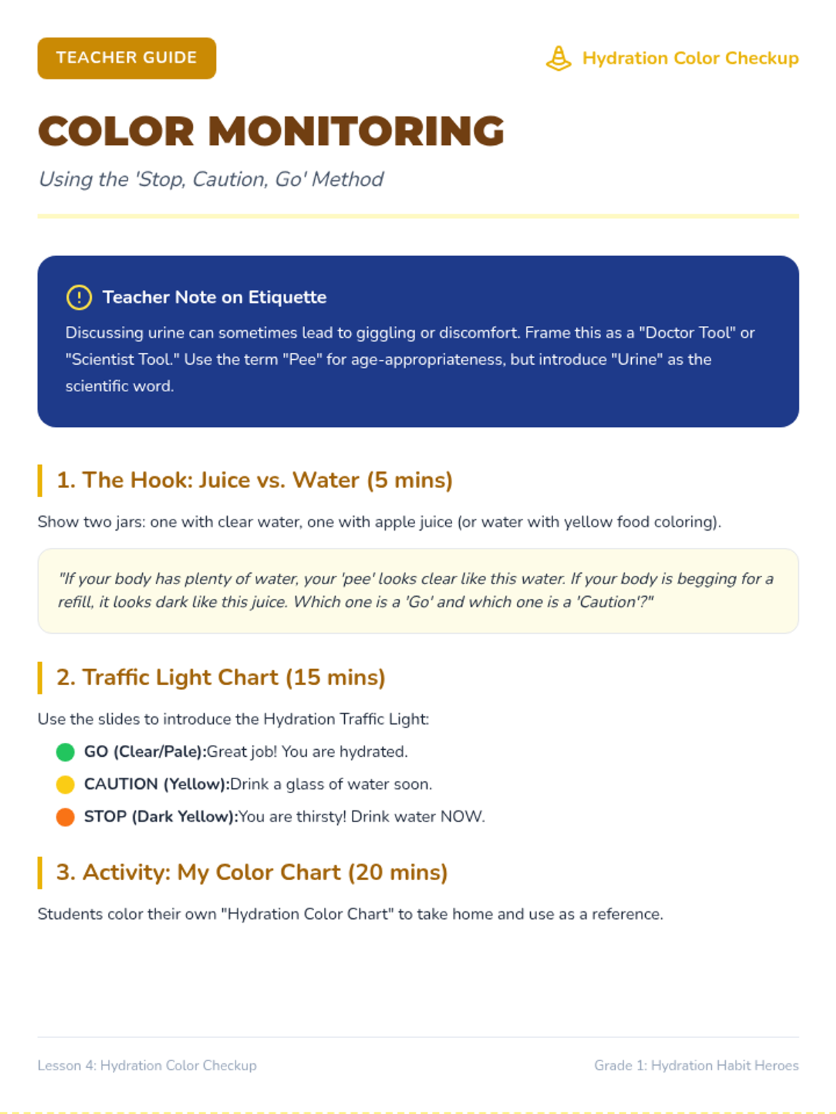 This inquiry-based sequence for first-grade students explores the biological necessity of water. Students learn to recognize physical signs of thirst, understand water loss through sweat, and monitor their hydration levels using urine color as a tool, ultimately connecting hydration to physical energy and mood.