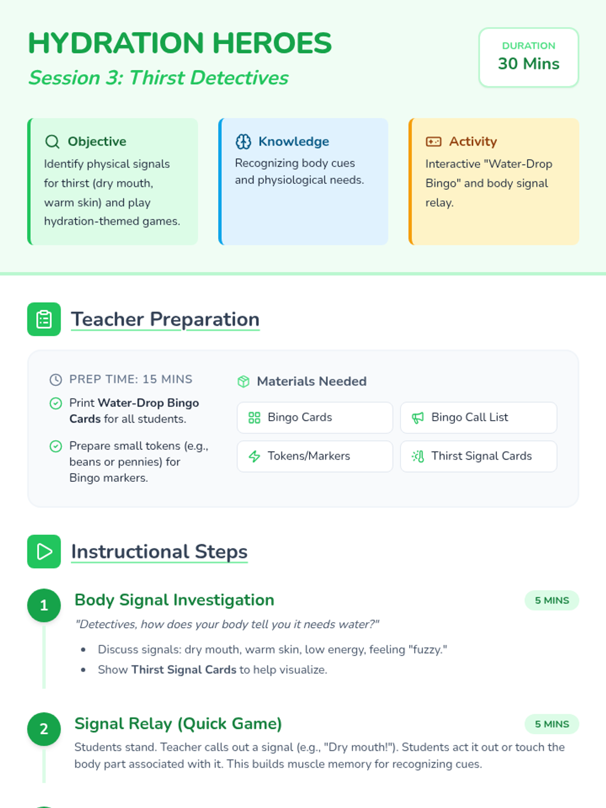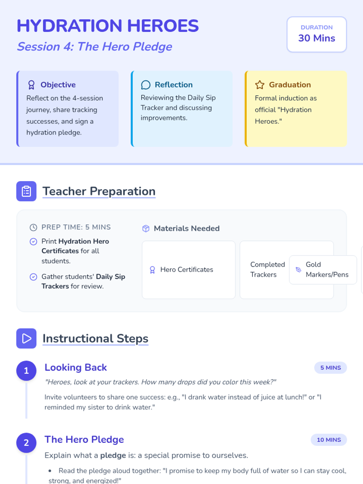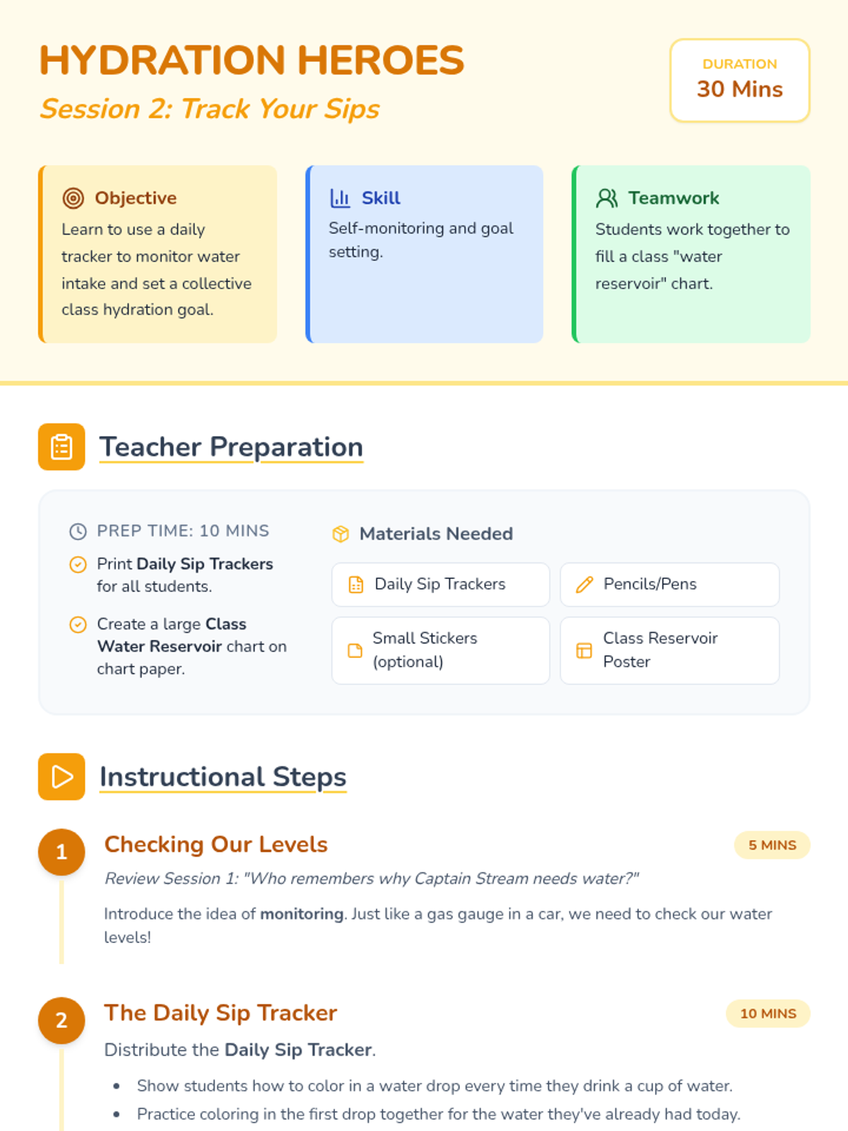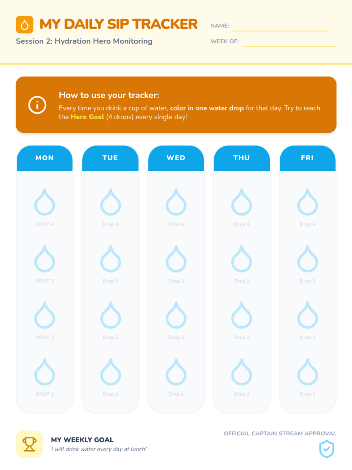 A 4-session K-3 curriculum that teaches students the importance of hydration through the character Captain Stream, interactive tracking, and games. Students develop healthy habits to stay cool and energized during hot weather.