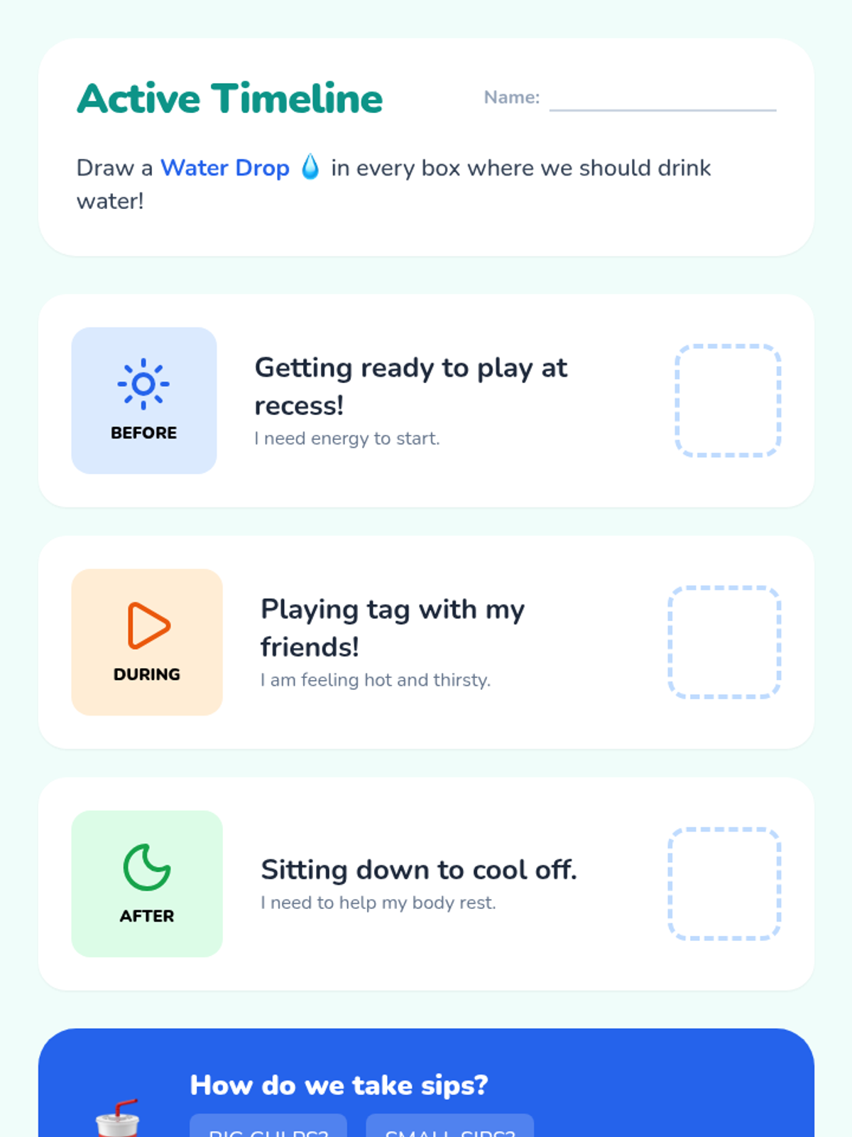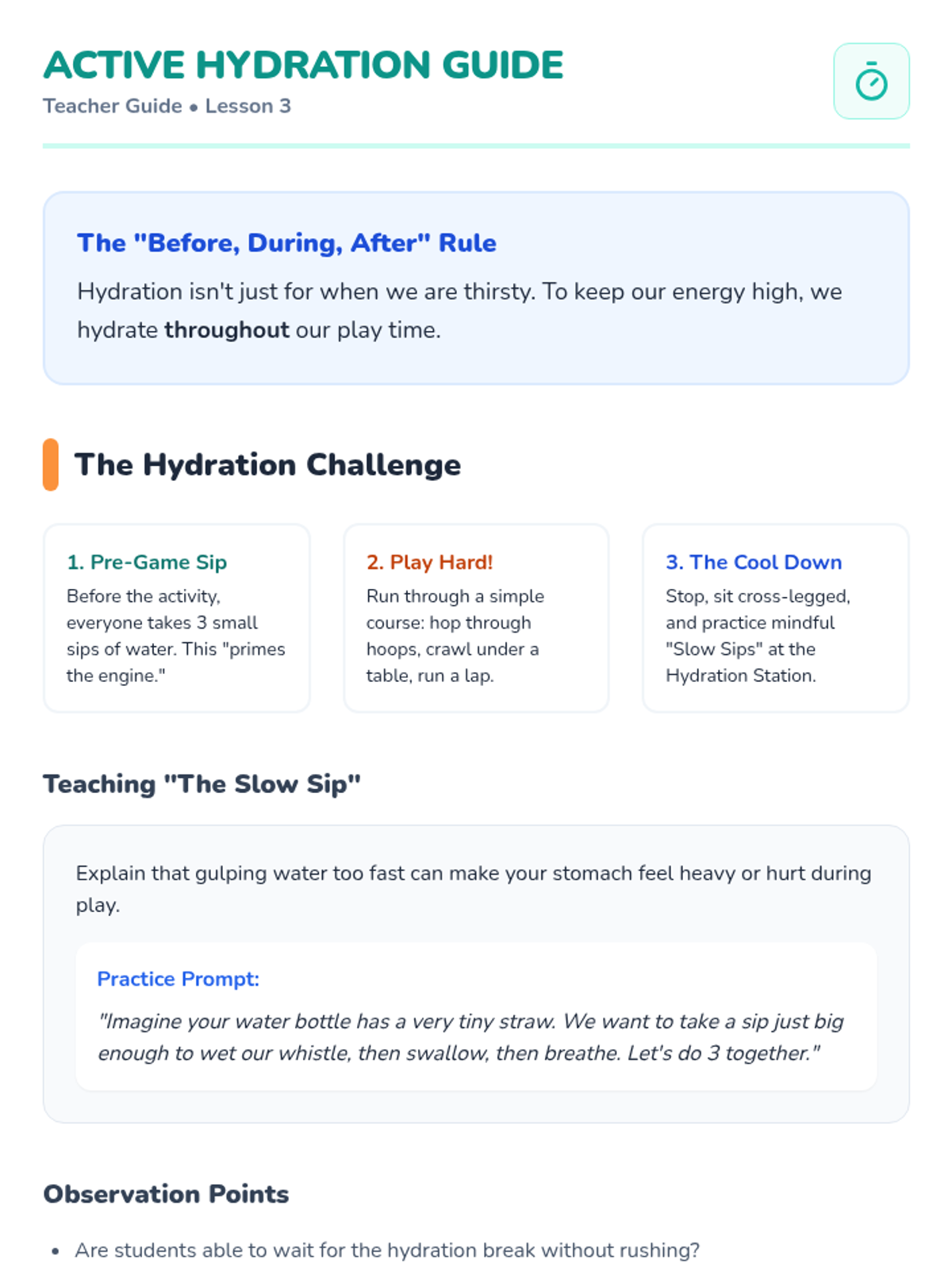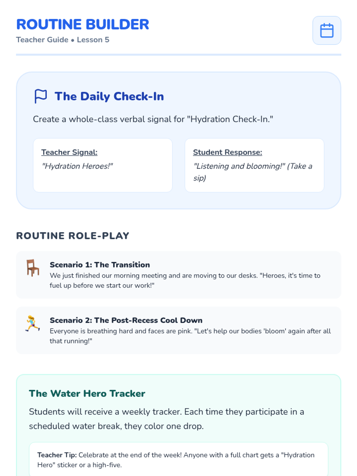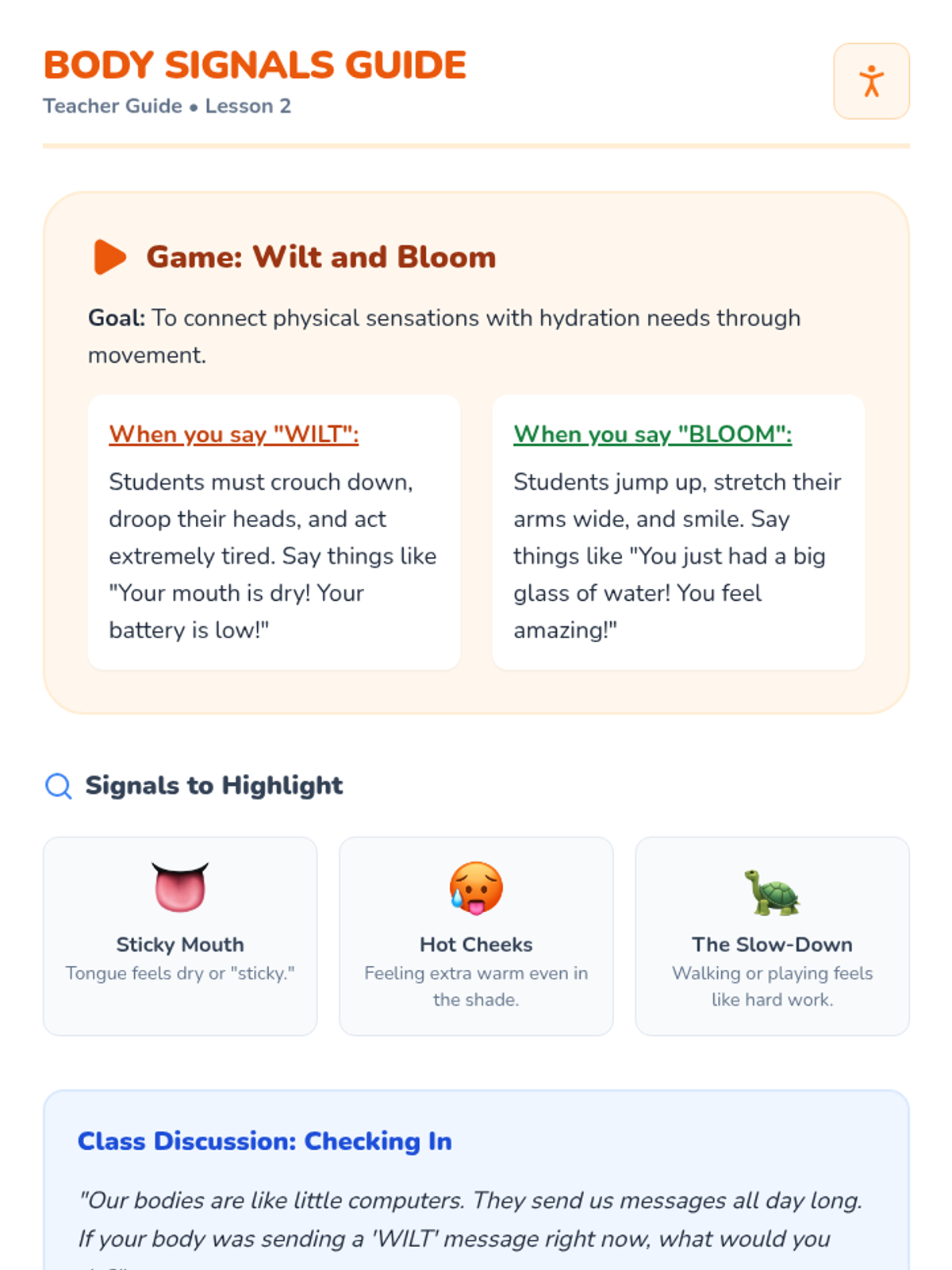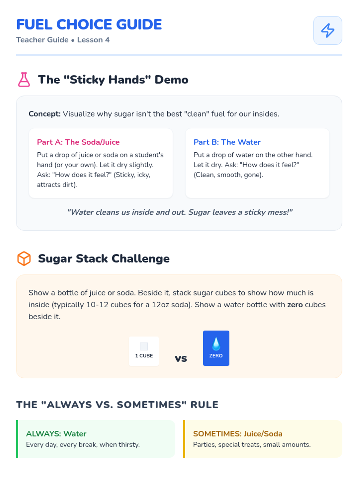A comprehensive Kindergarten health sequence focusing on recognizing thirst signals, understanding biological needs for water through plant comparisons, timing hydration with physical activity, and choosing water over sugary drinks.