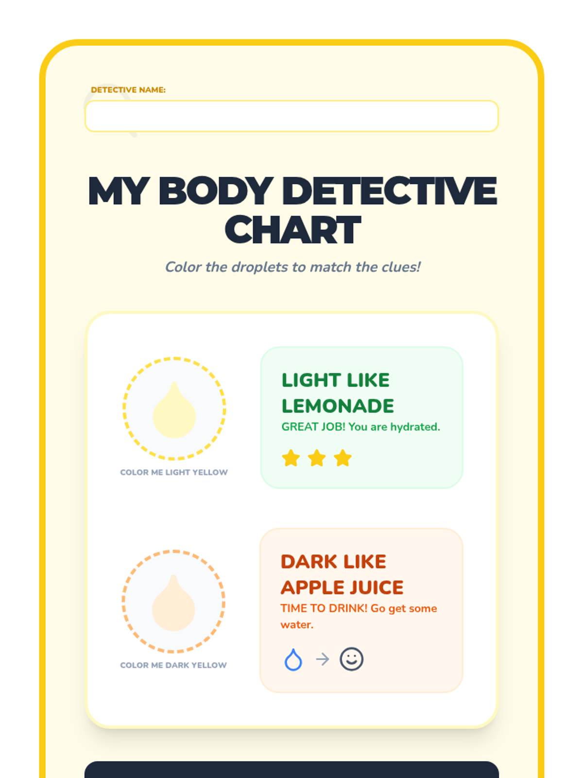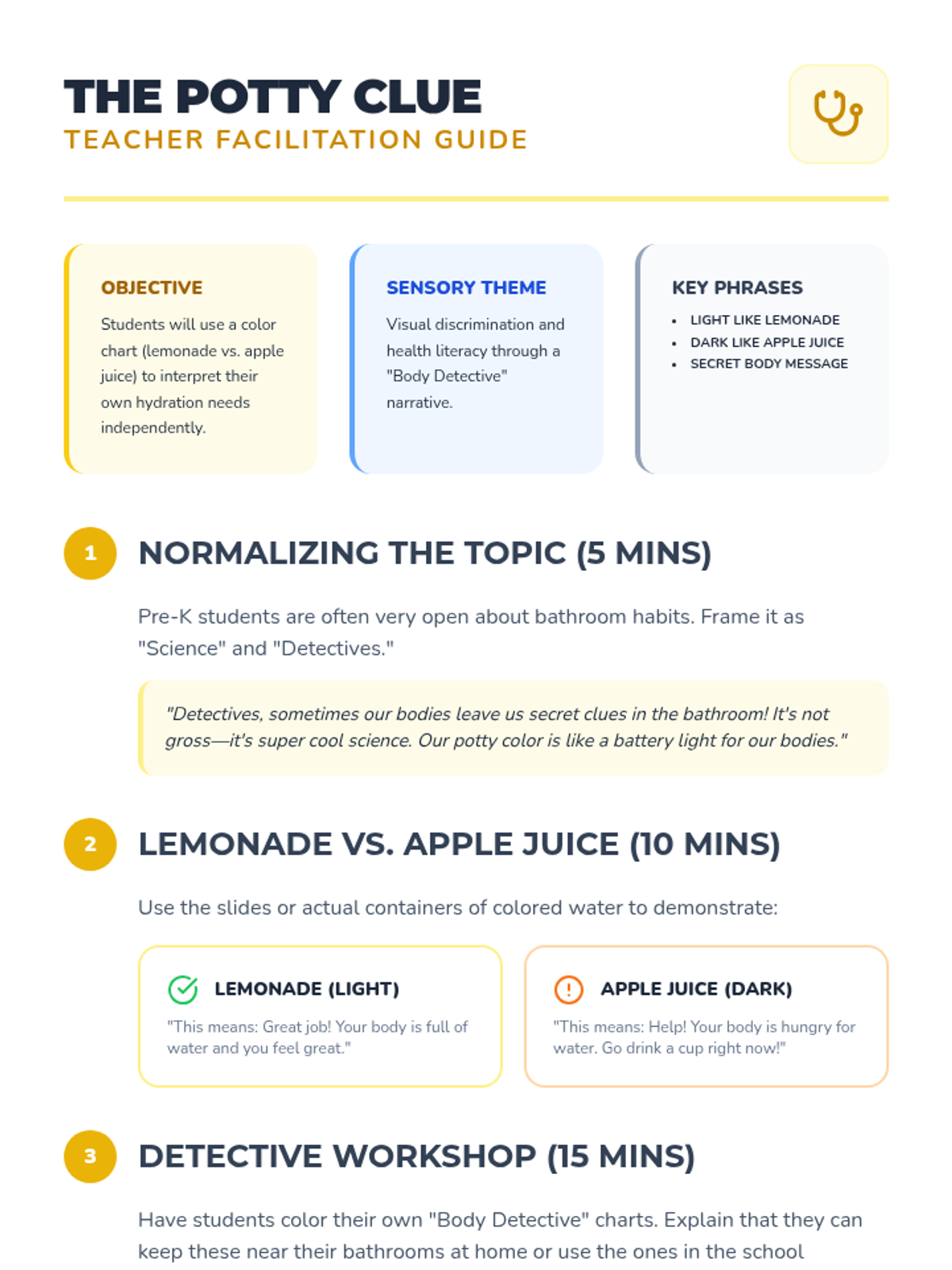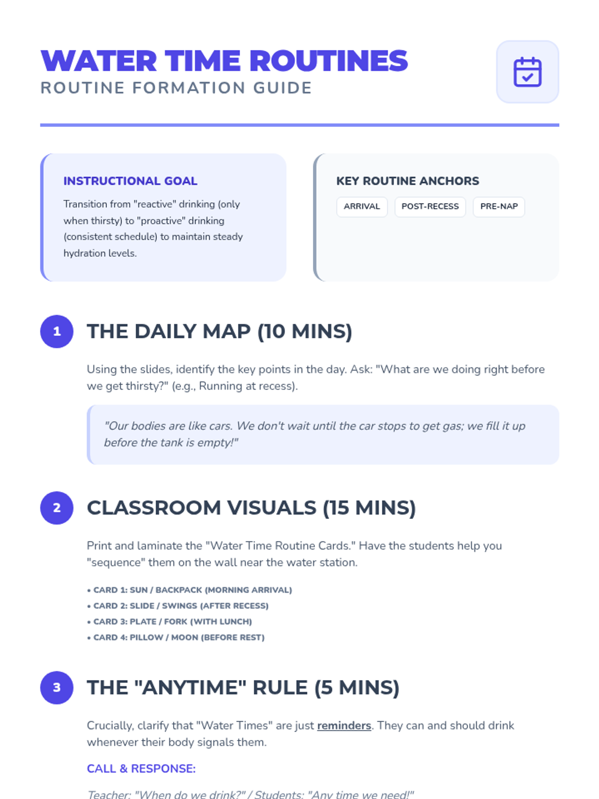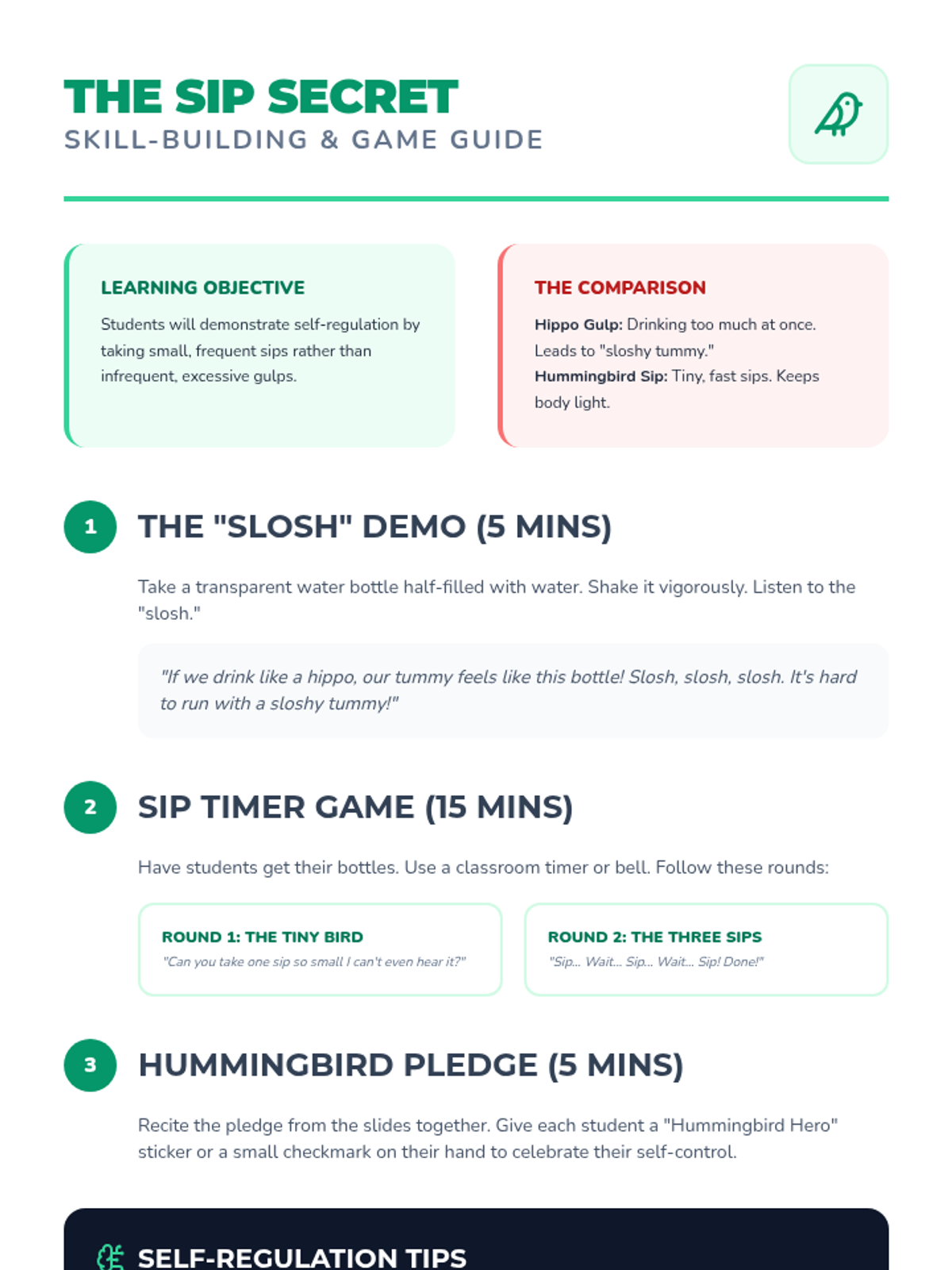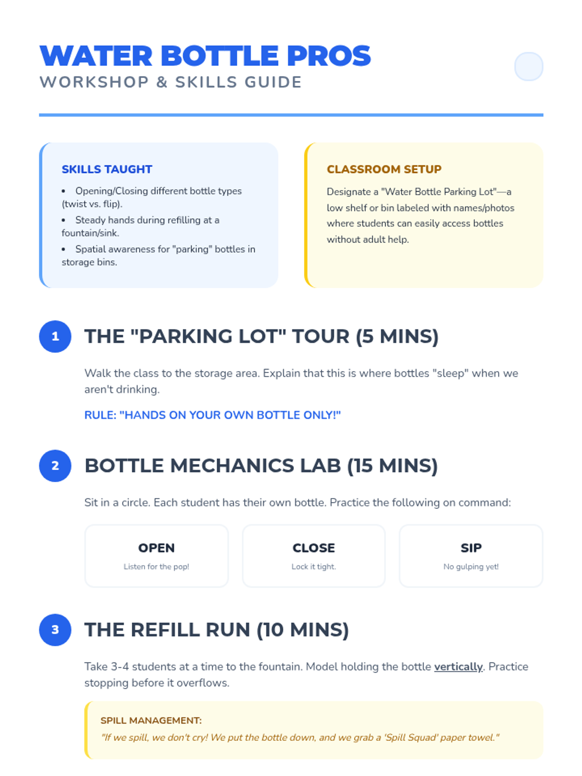 A comprehensive Pre-K sequence teaching students to recognize somatic thirst signals, interpret hydration indicators, and master practical water bottle hygiene and drinking routines.