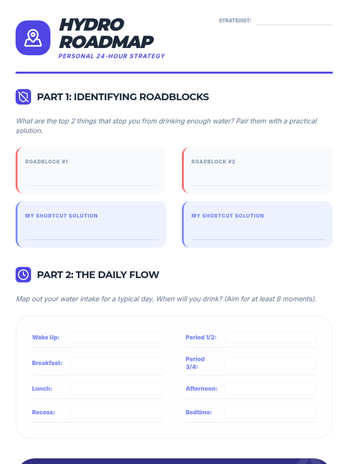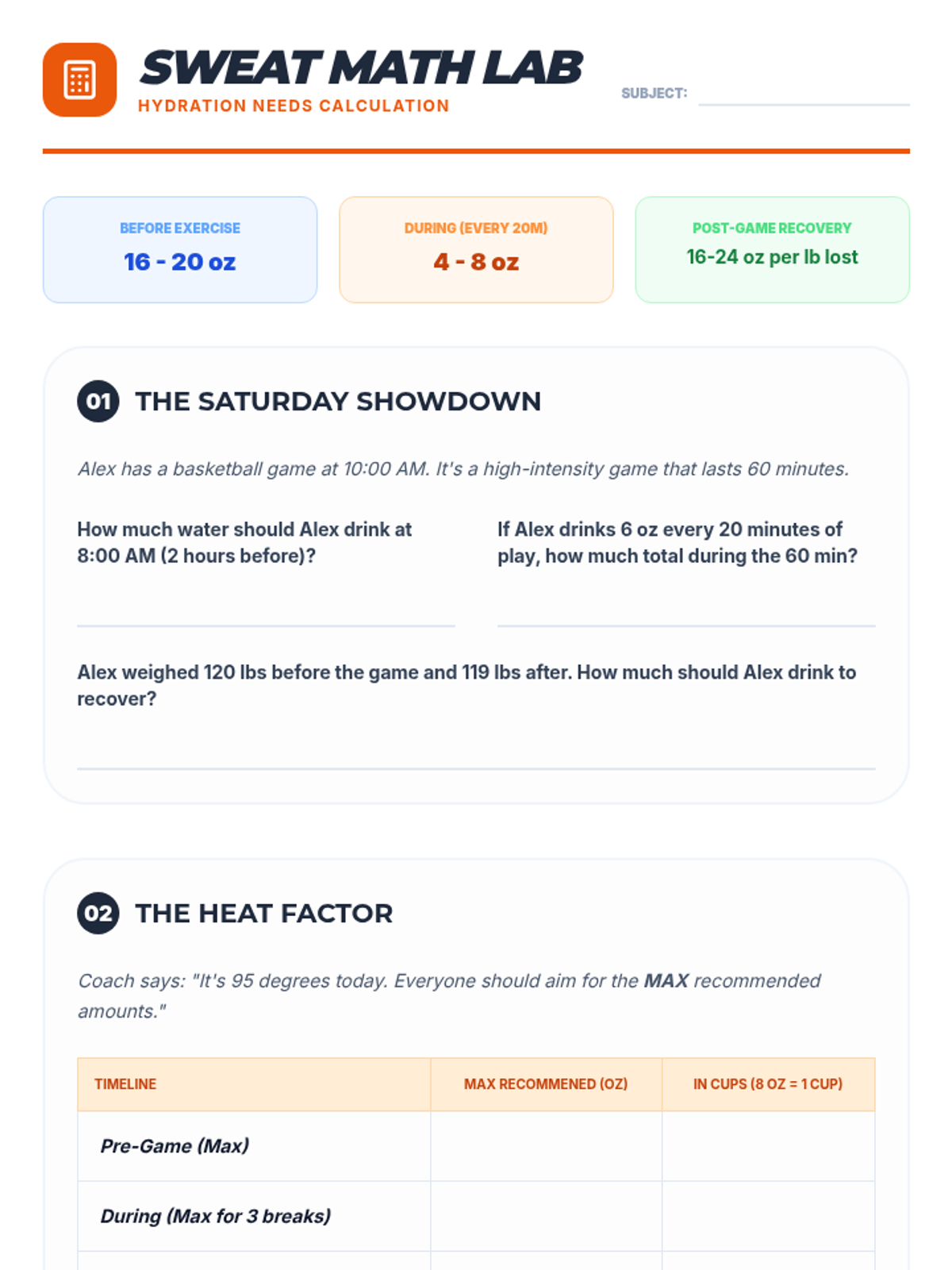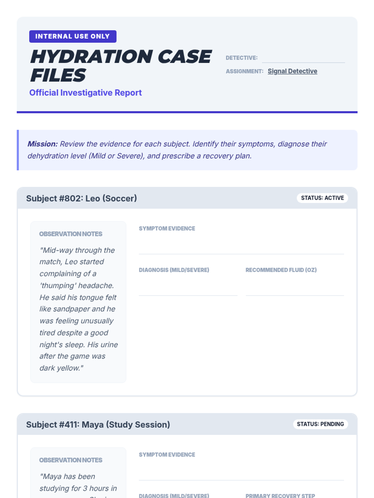 A comprehensive 6th-grade unit exploring the biological necessity of hydration, symptom recognition, beverage analysis, and personalized fluid intake planning. Students move from physiological understanding to practical daily strategies for maintaining optimal health and performance.
