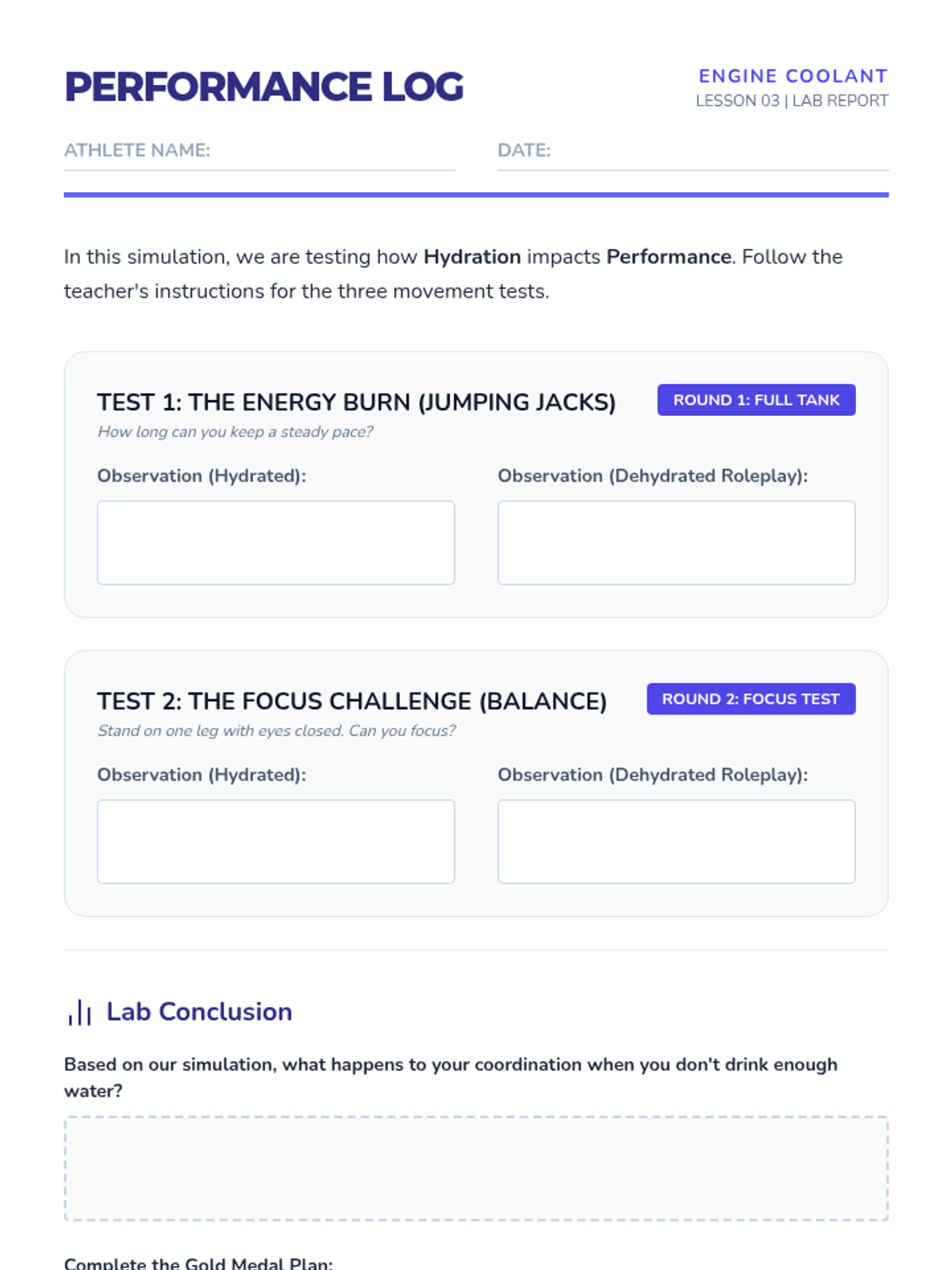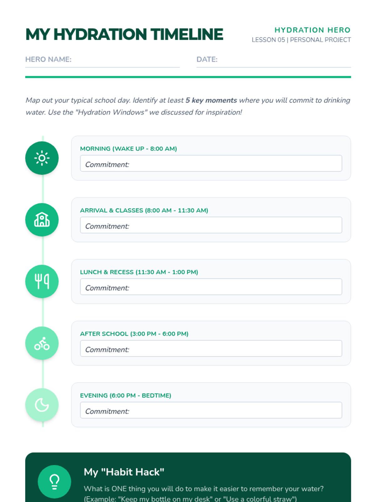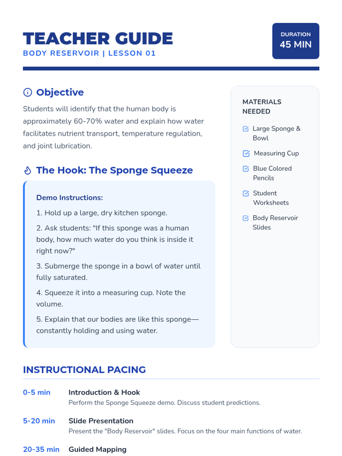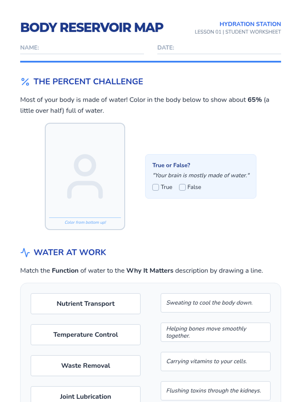 This sequence guides 4th-grade students through the biological necessity of water and the practical skills required to maintain hydration. Students will explore body composition, recognize dehydration signals, analyze physical performance, compare beverage choices, and design a personal hydration plan.