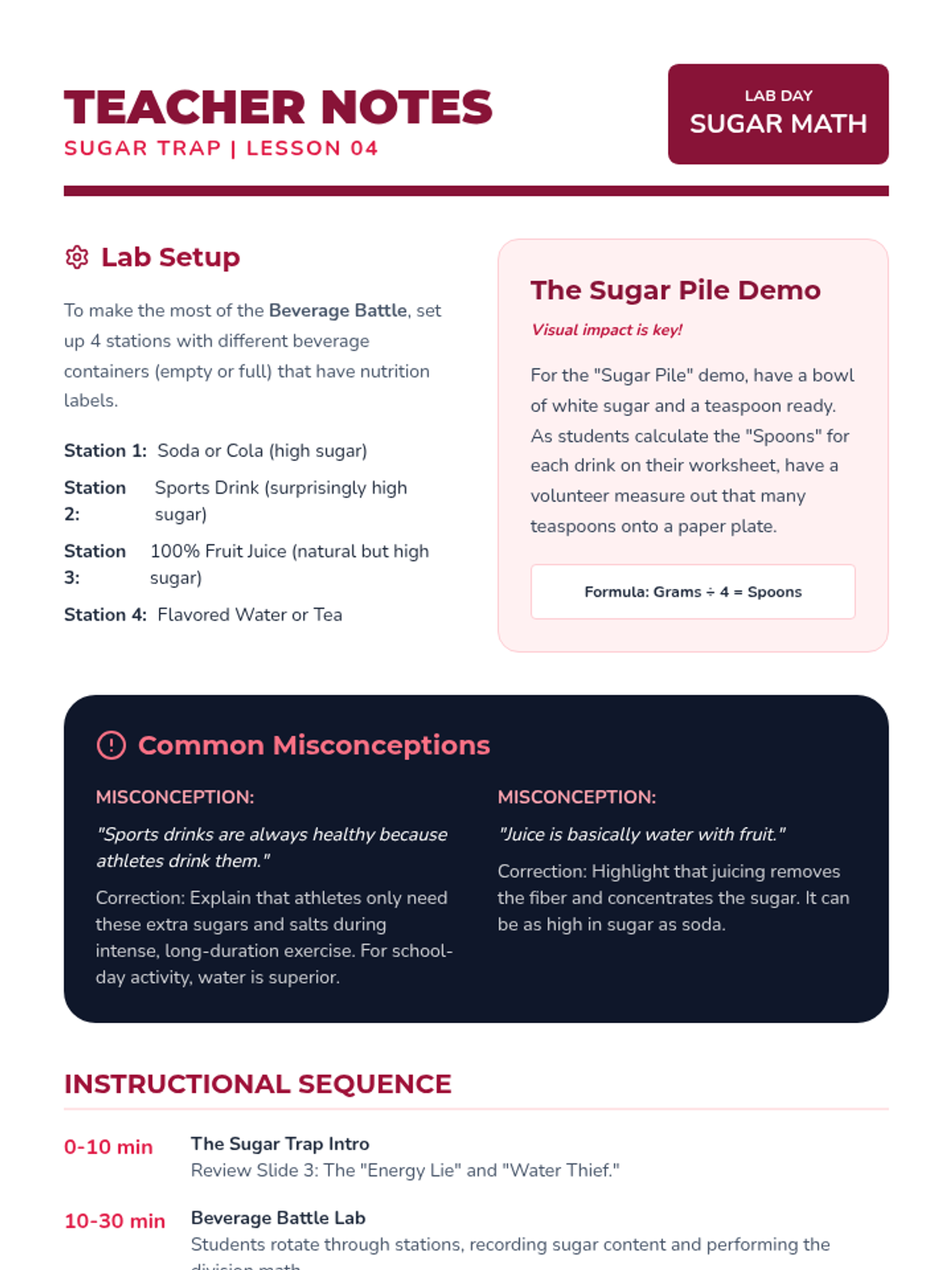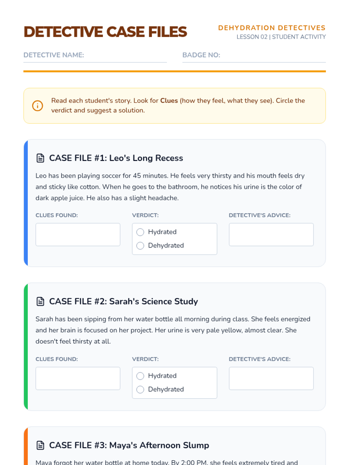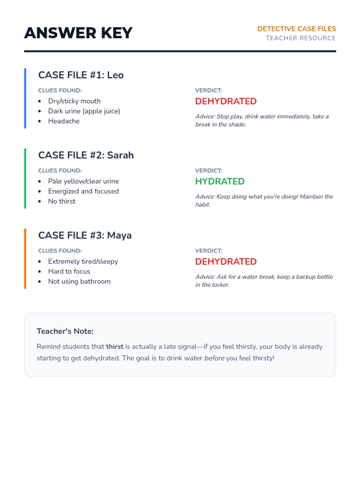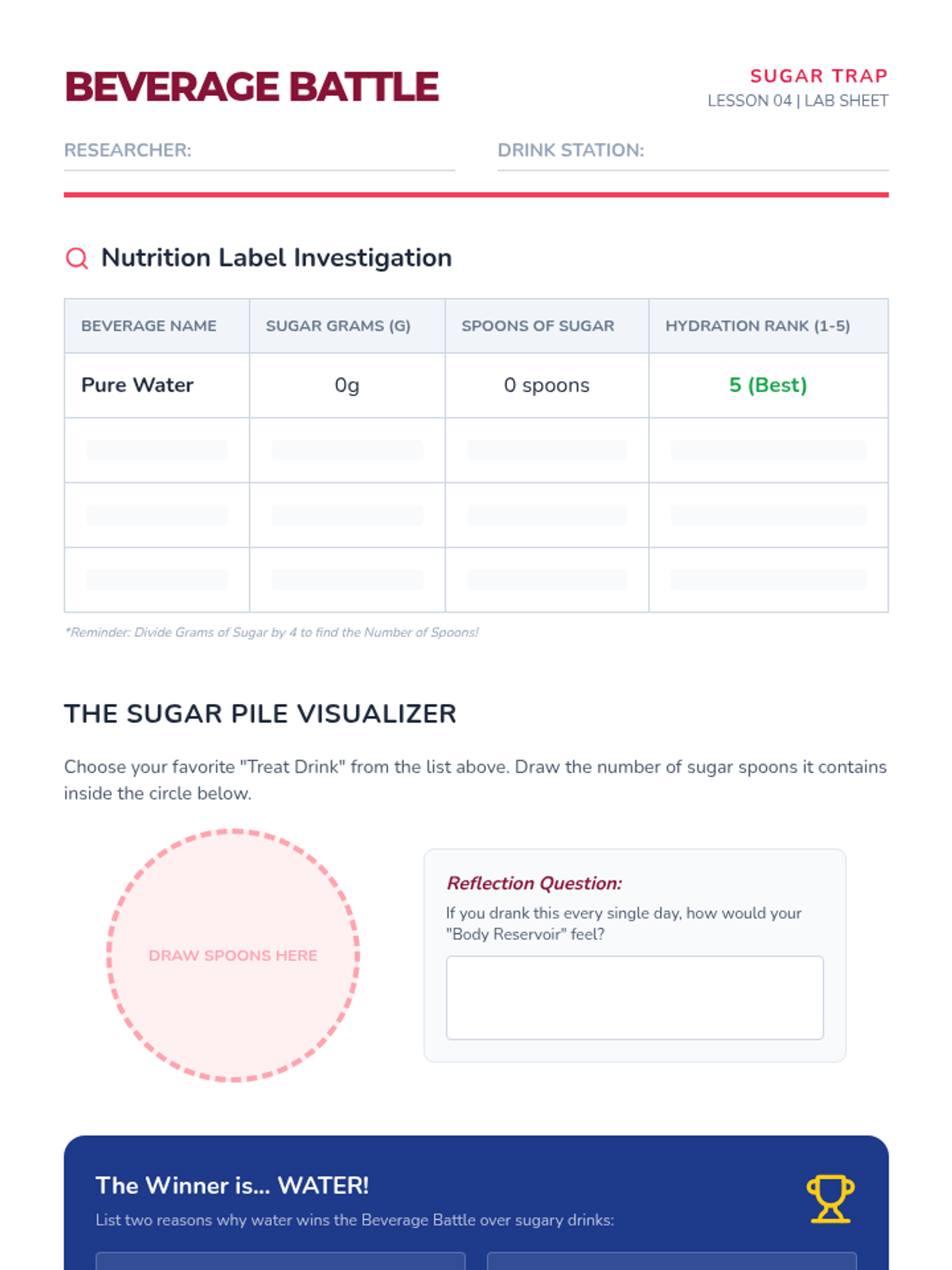 This sequence guides 4th-grade students through the biological necessity of water and the practical skills required to maintain hydration. Students will explore body composition, recognize dehydration signals, analyze physical performance, compare beverage choices, and design a personal hydration plan.