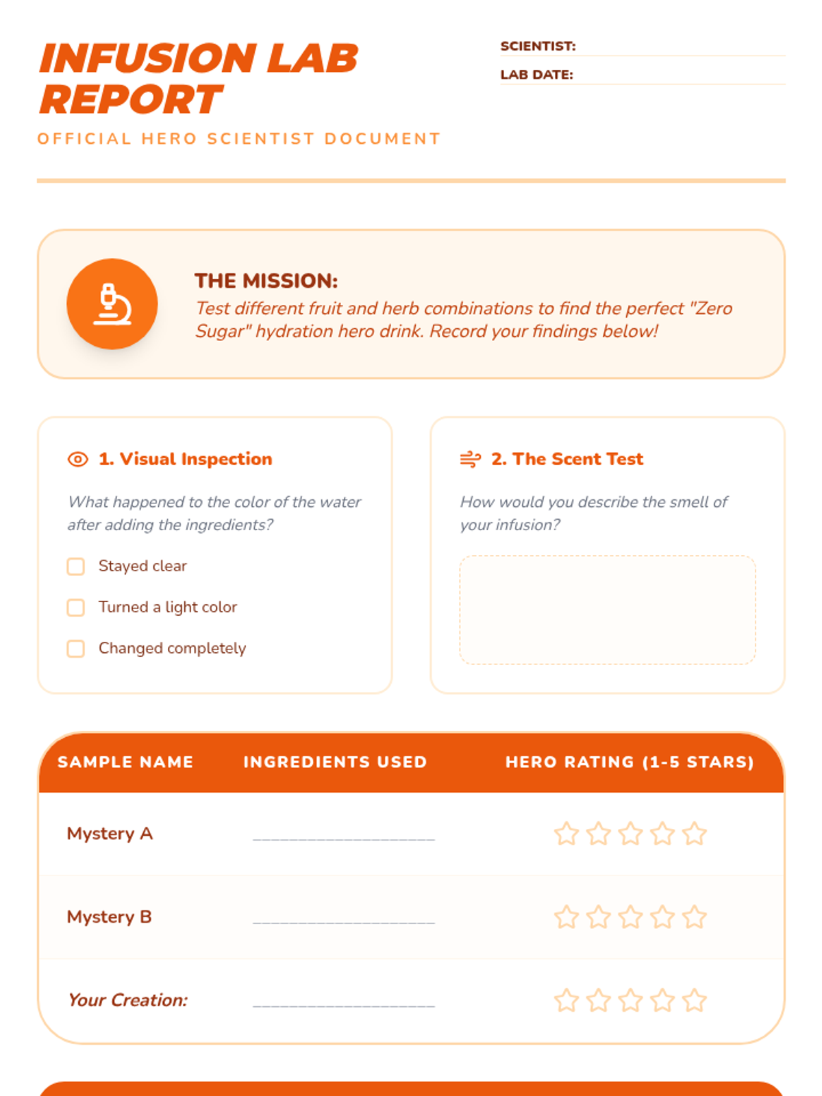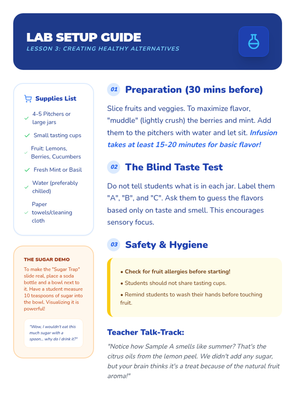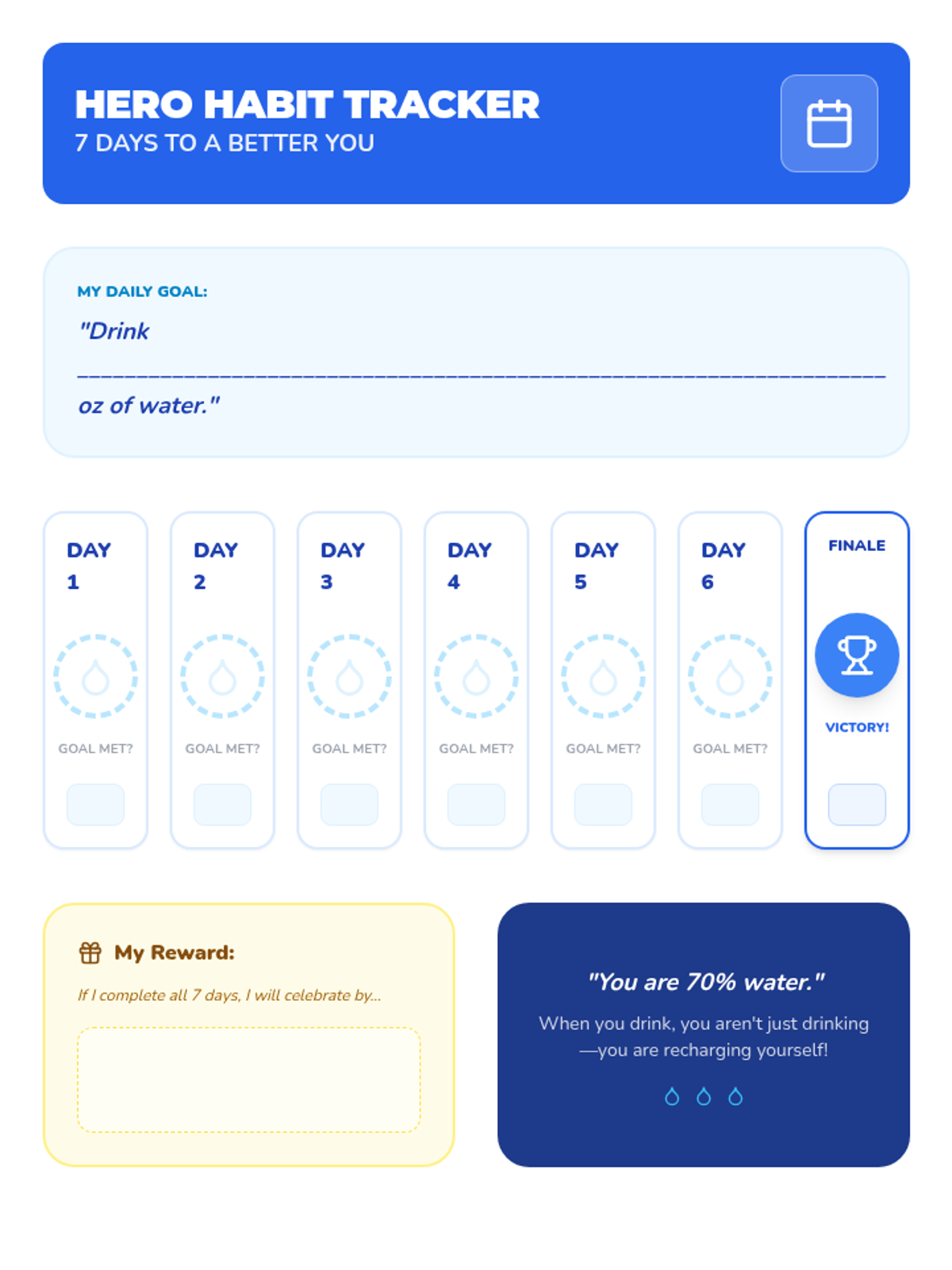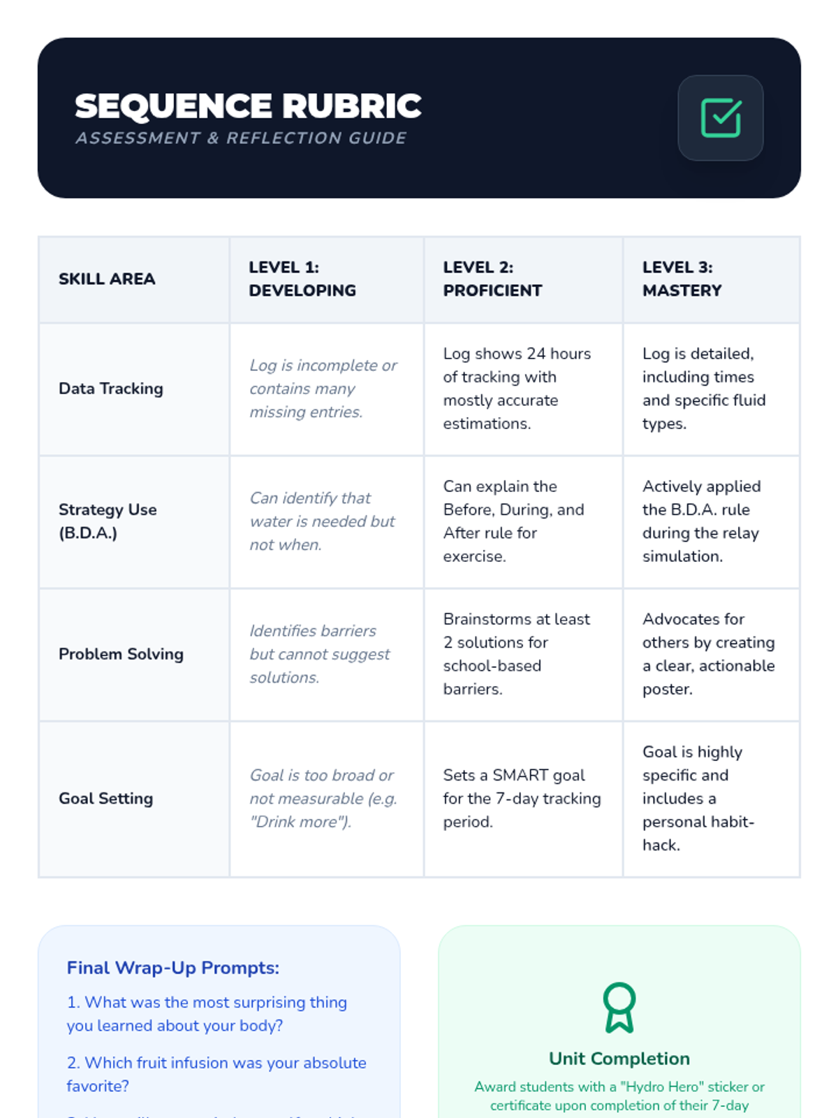 A 3rd-grade sequence focused on building sustainable hydration habits through data tracking, physical activity strategies, and creative flavor infusion. Students move from baseline assessment to personal goal setting and advocacy.