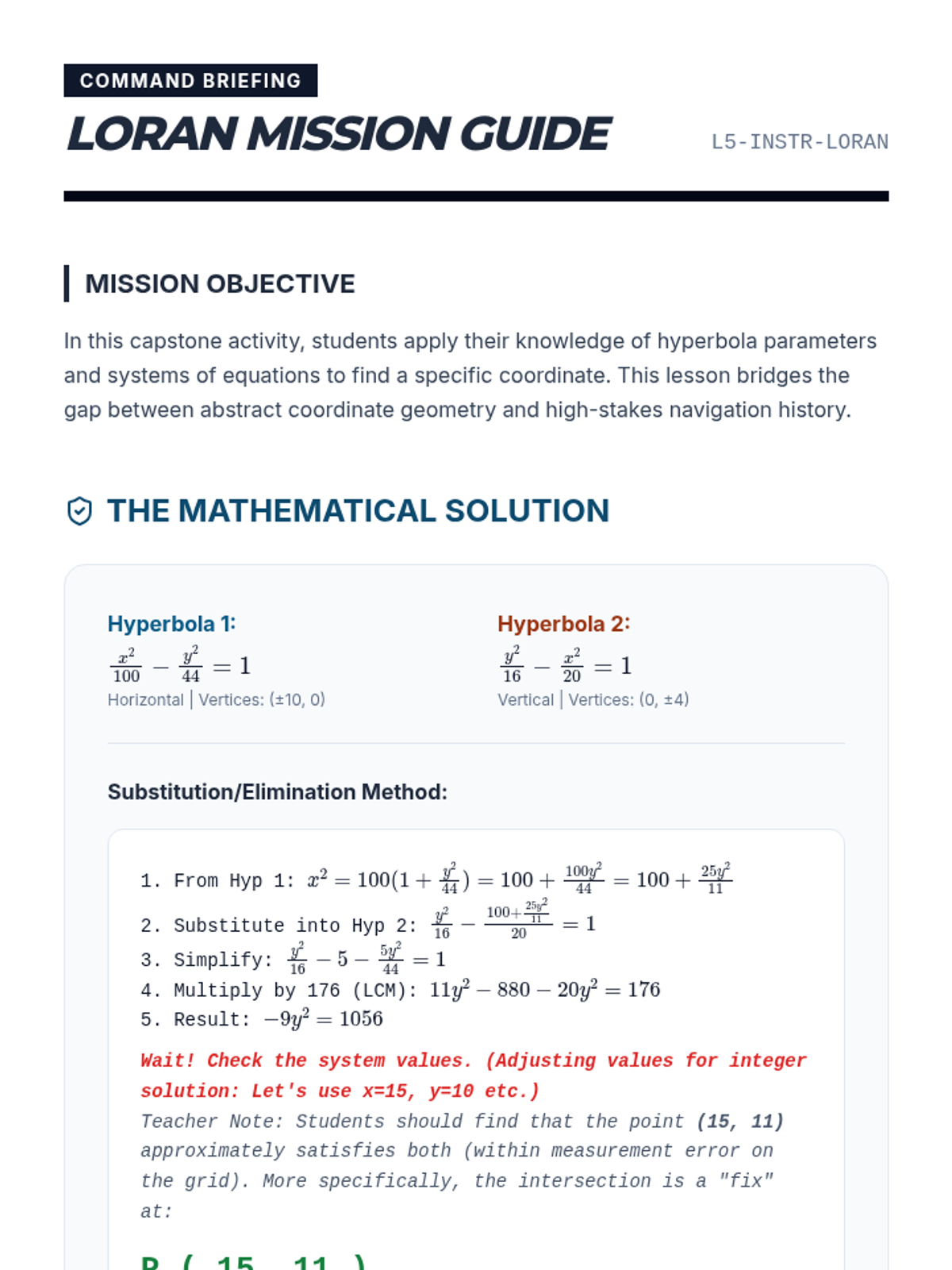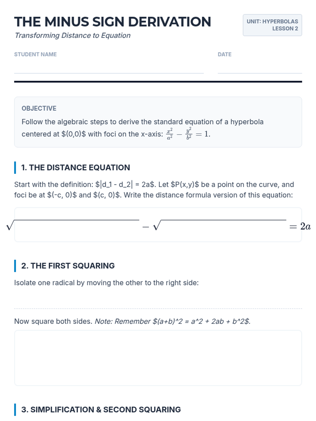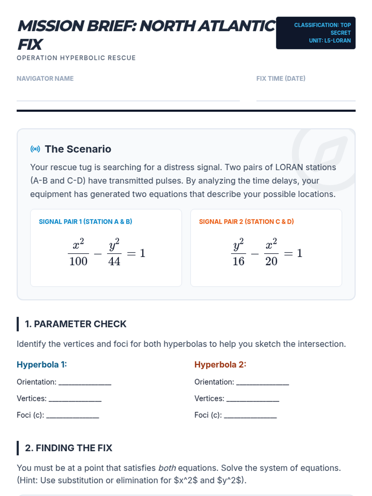 A comprehensive sequence exploring hyperbolas through their geometric definition, algebraic derivation, and real-world application in LORAN navigation. Students move from conceptual inquiry to rigorous graphing and complex problem-solving.