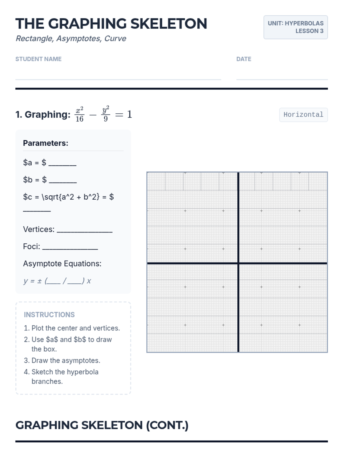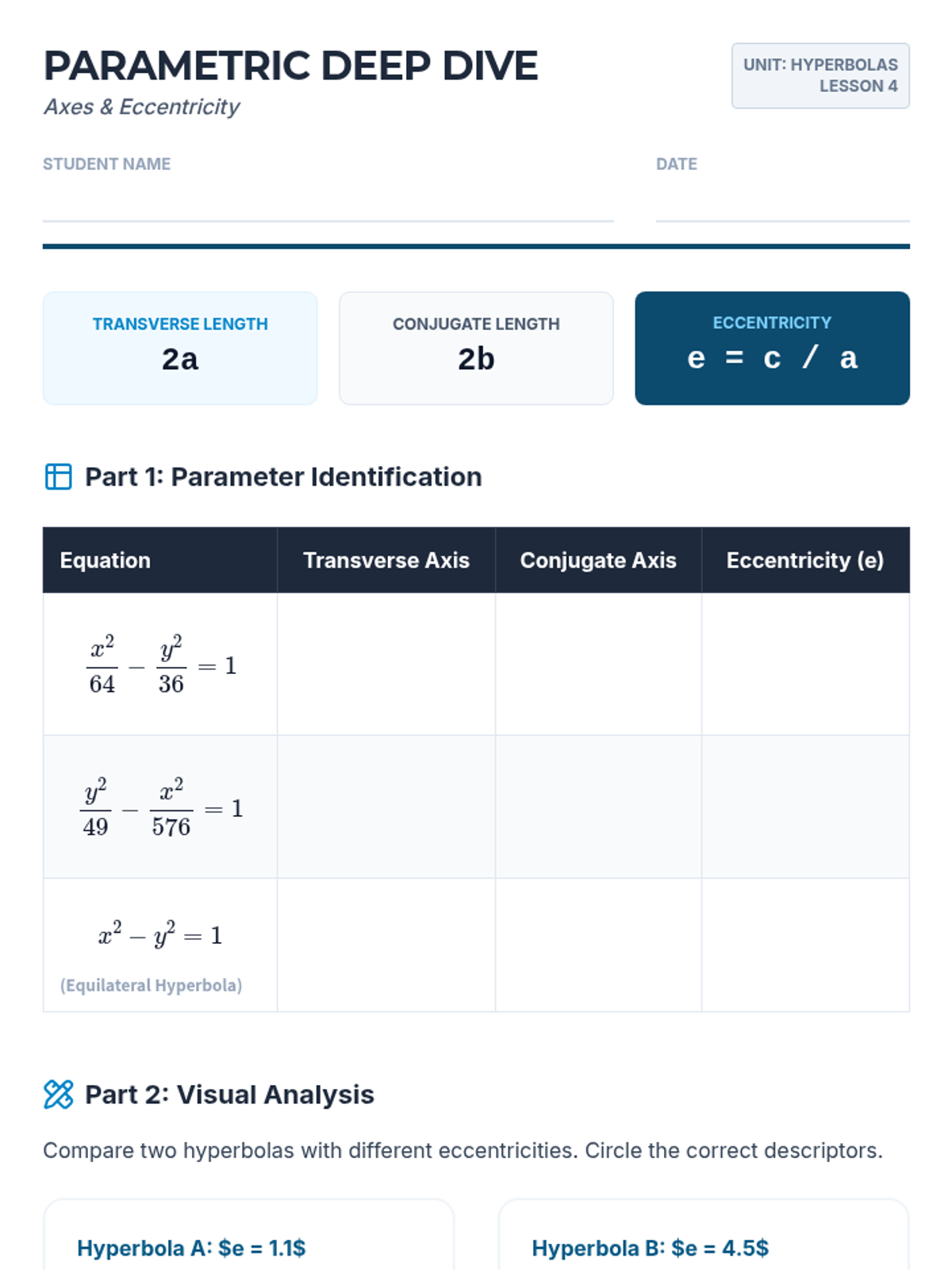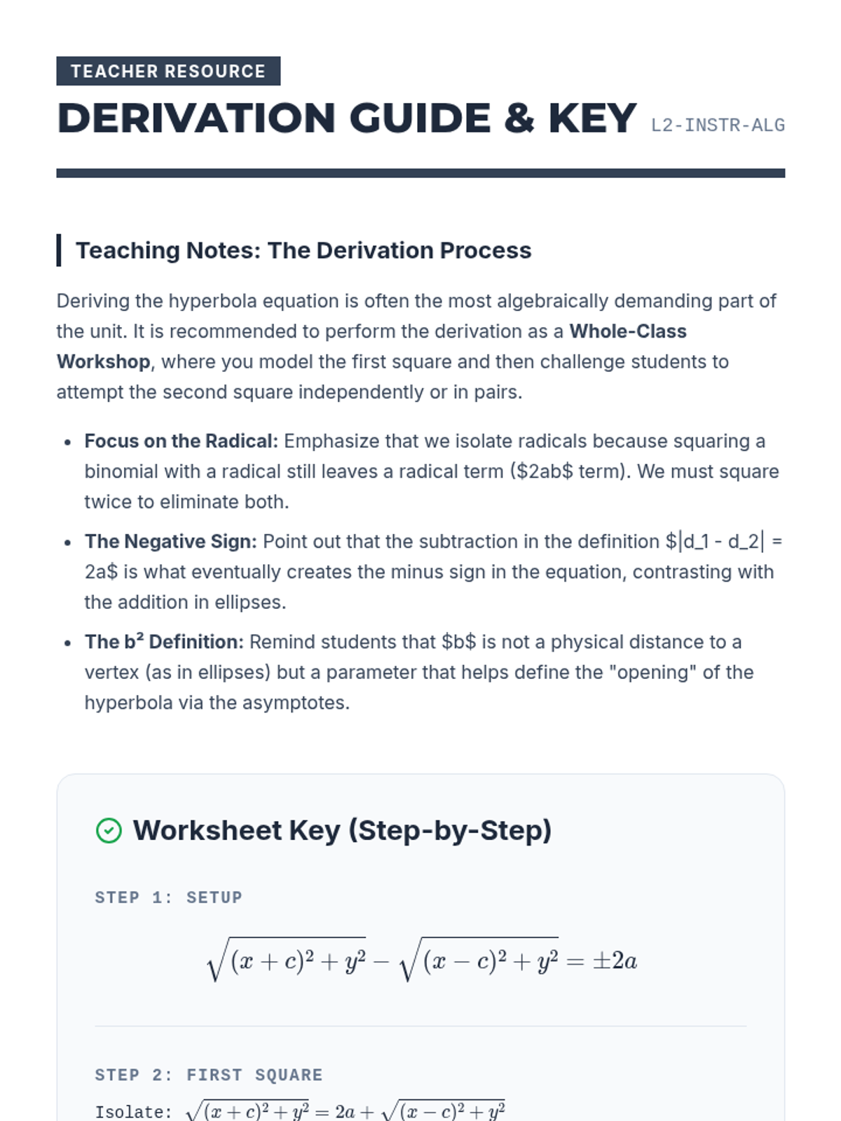 A comprehensive sequence exploring hyperbolas through their geometric definition, algebraic derivation, and real-world application in LORAN navigation. Students move from conceptual inquiry to rigorous graphing and complex problem-solving.