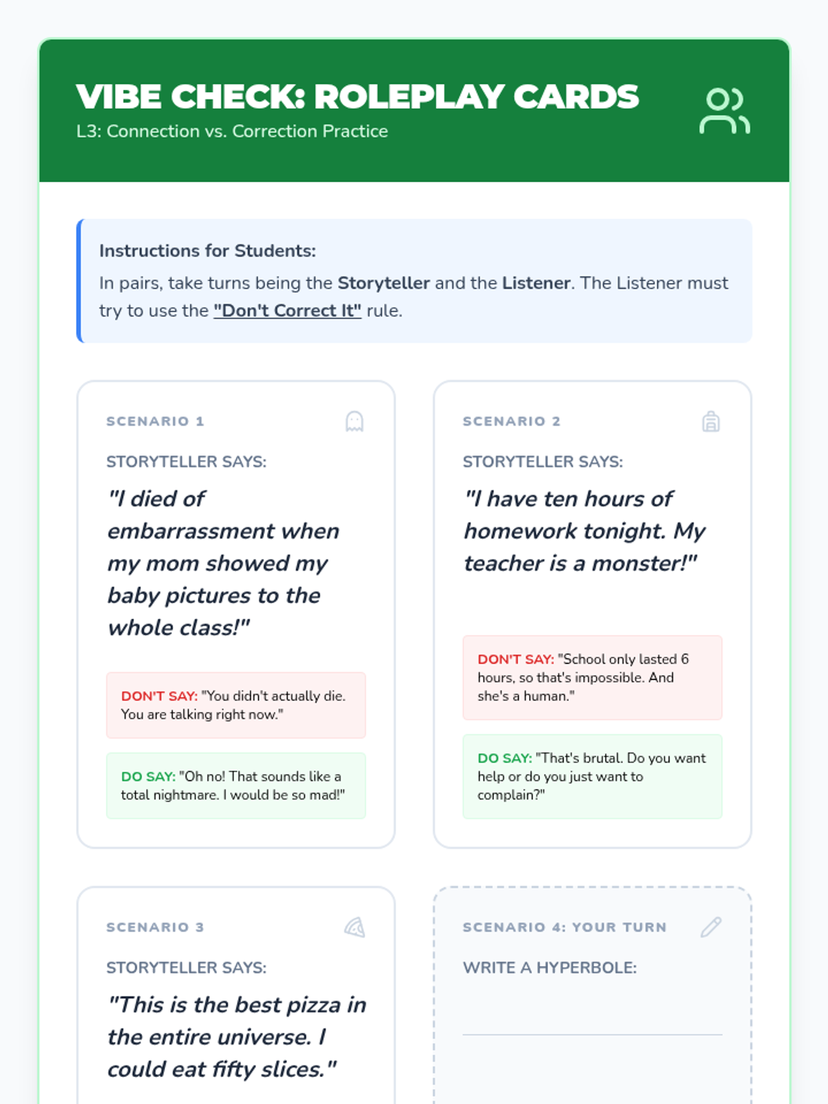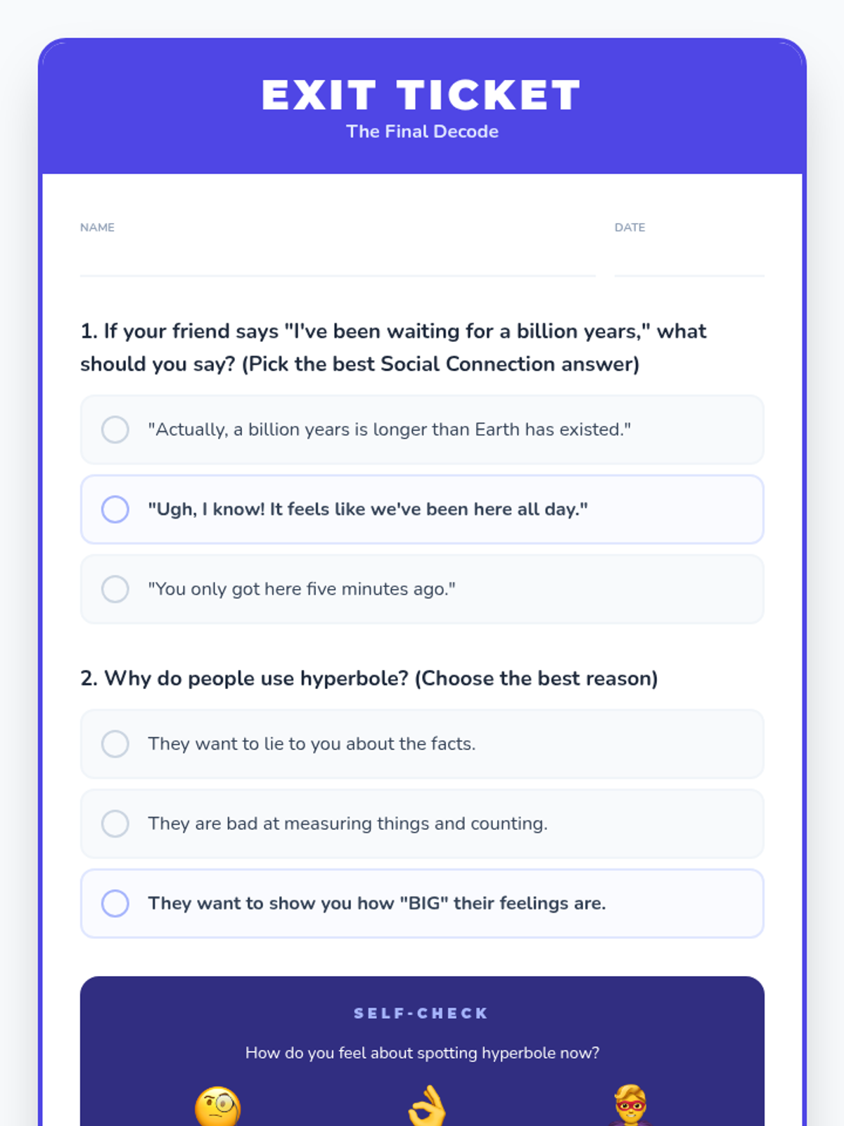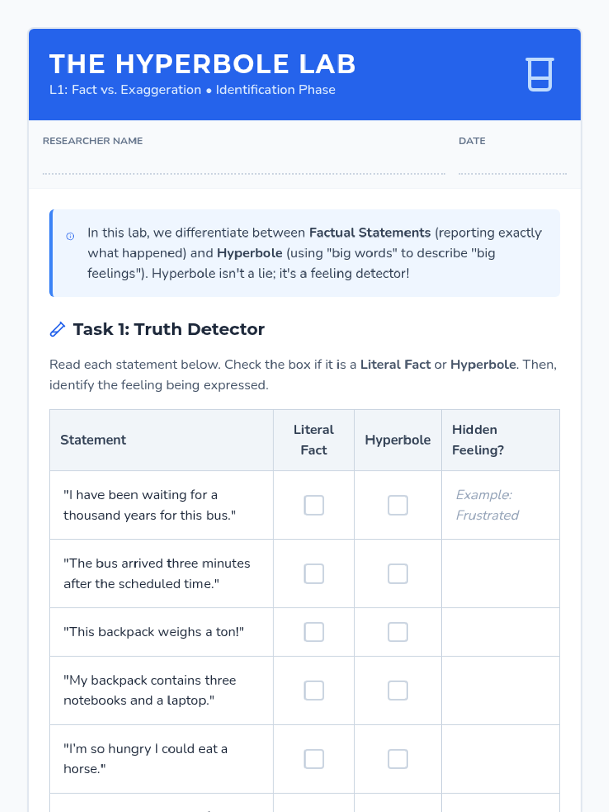 A 5-lesson sequence for 7th-grade social communication students focusing on hyperbole. Students learn to identify exaggeration as a tool for emotional expression, map the intensity of figurative language, and practice social validation instead of literal correction.