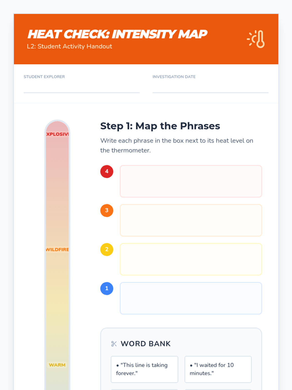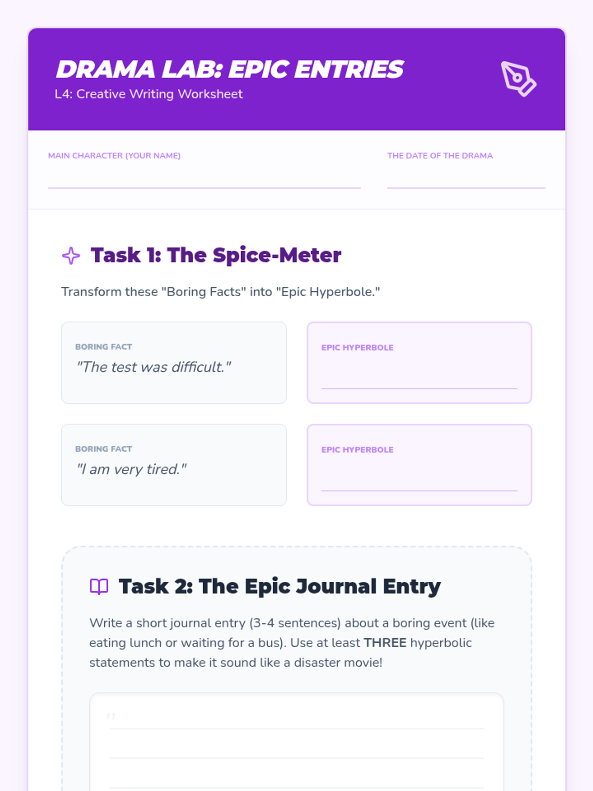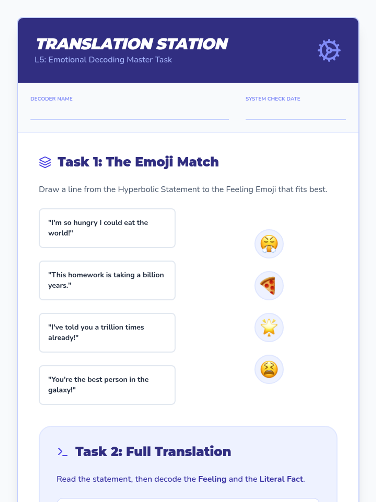 A 5-lesson sequence for 7th-grade social communication students focusing on hyperbole. Students learn to identify exaggeration as a tool for emotional expression, map the intensity of figurative language, and practice social validation instead of literal correction.