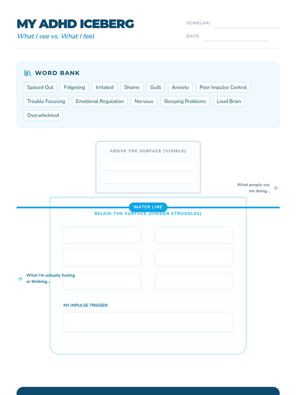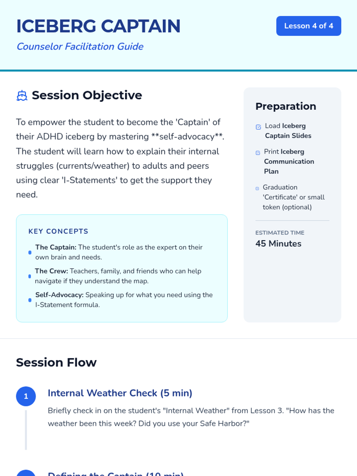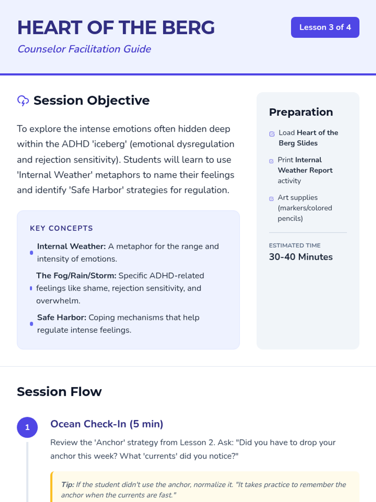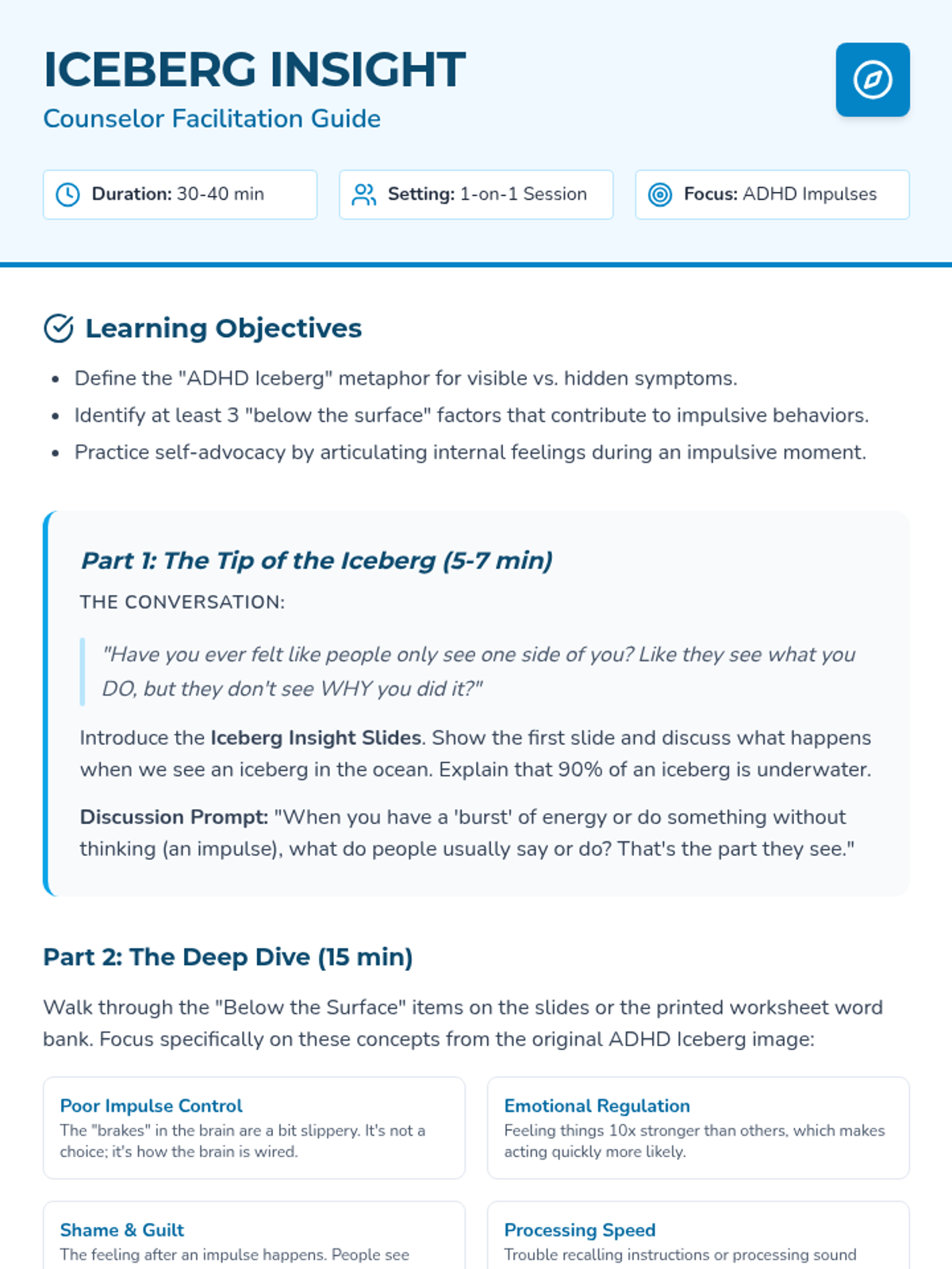A counseling series using the iceberg analogy to help students with ADHD understand their neurodiversity, master emotional regulation, and develop self-advocacy skills. Each lesson dives deeper into specific 'underwater' challenges.