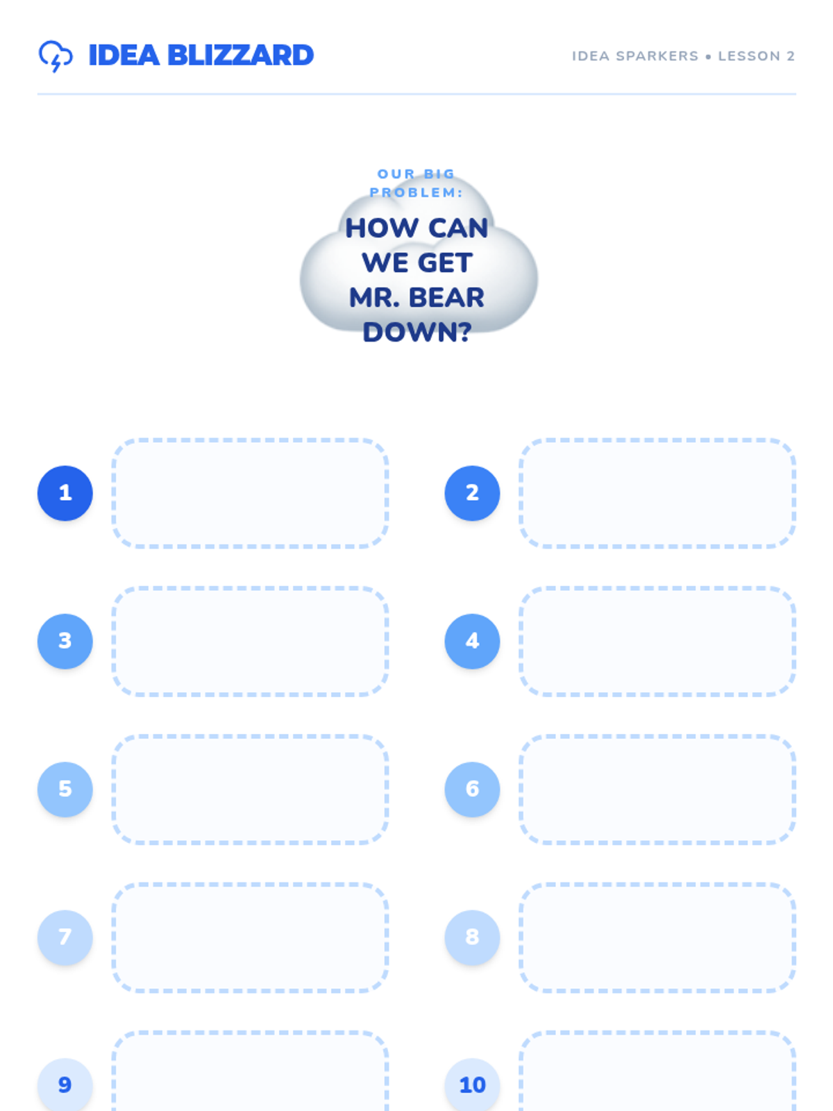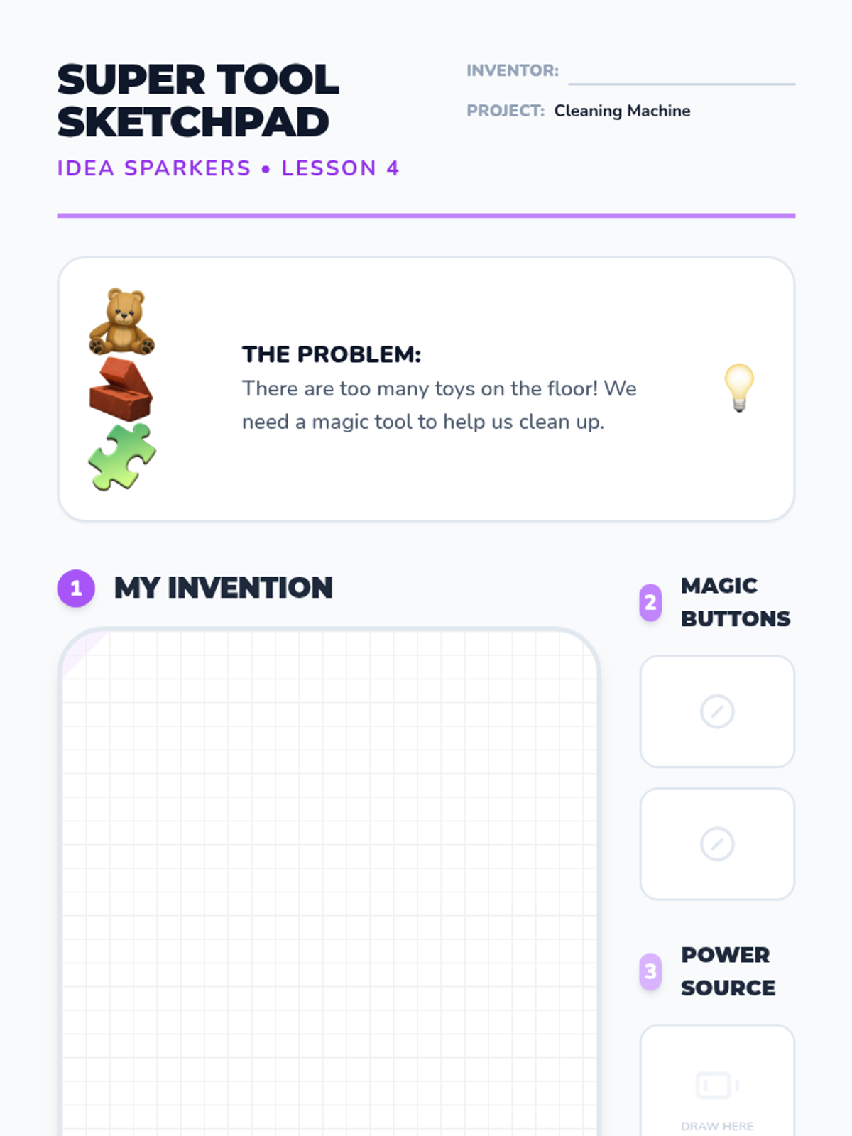 A hands-on exploration of creative problem-solving for Pre-K students. Using a class mascot and whimsical scenarios, students learn that there is never just one right answer by brainstorming, building, and inventing multiple solutions to simple challenges.