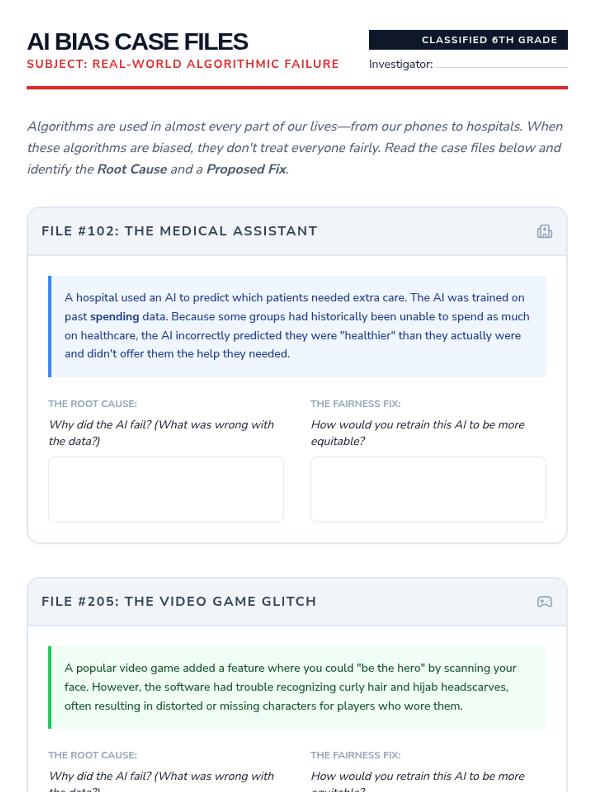An inquiry-based exploration of machine learning for 6th graders, focusing on how training data influences algorithmic outcomes and how to identify and mitigate bias in AI systems.