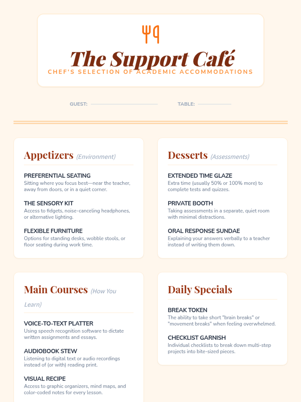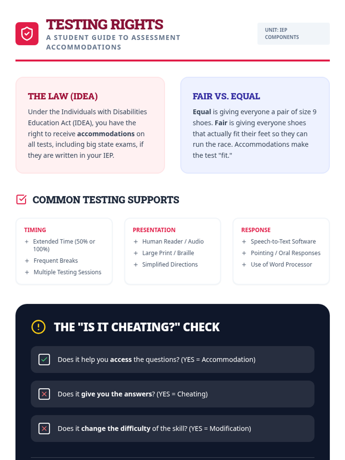 This sequence explores the specific supports within an IEP, focusing on the distinction between accommodations and modifications. Students engage in simulations and workshops to identify valid tools for overcoming learning barriers and learn to advocate for their personal support needs.