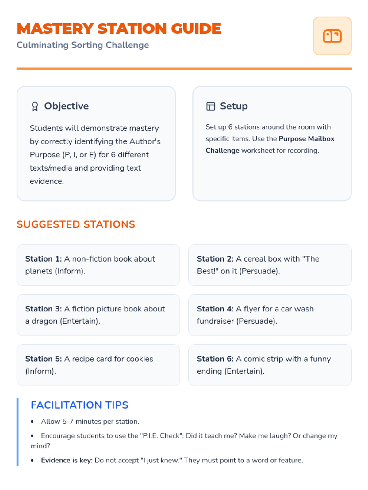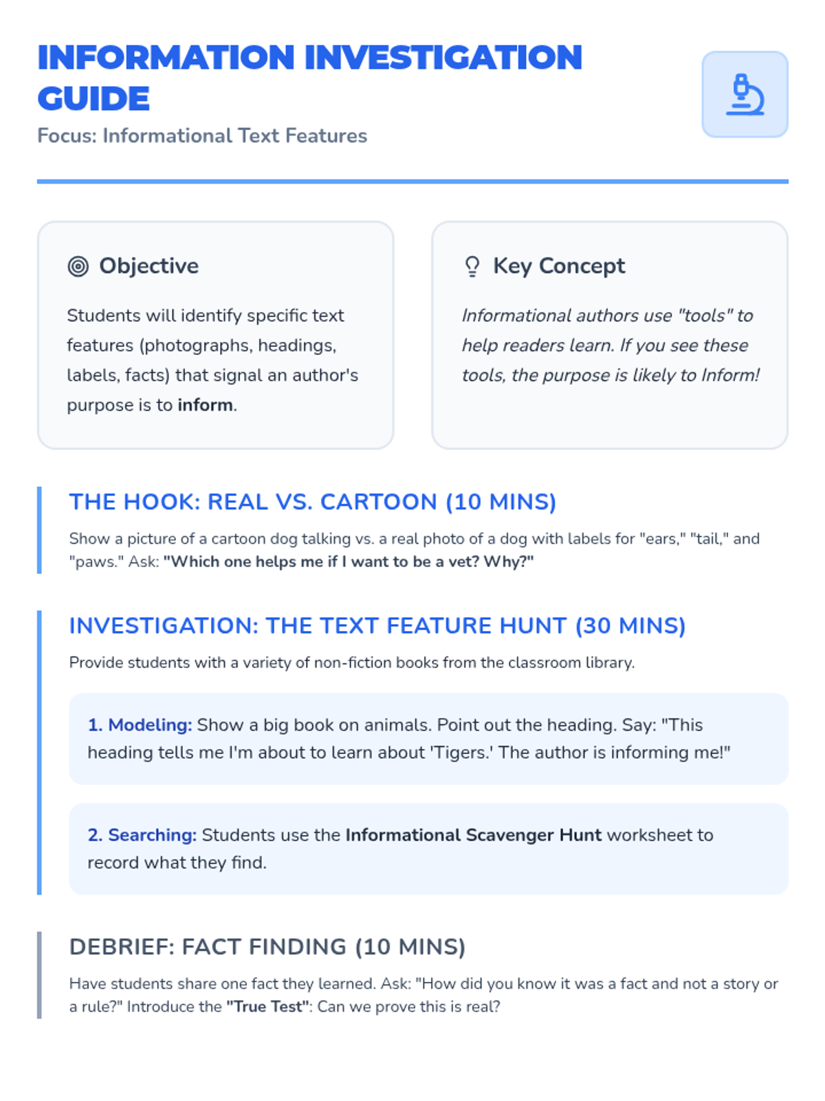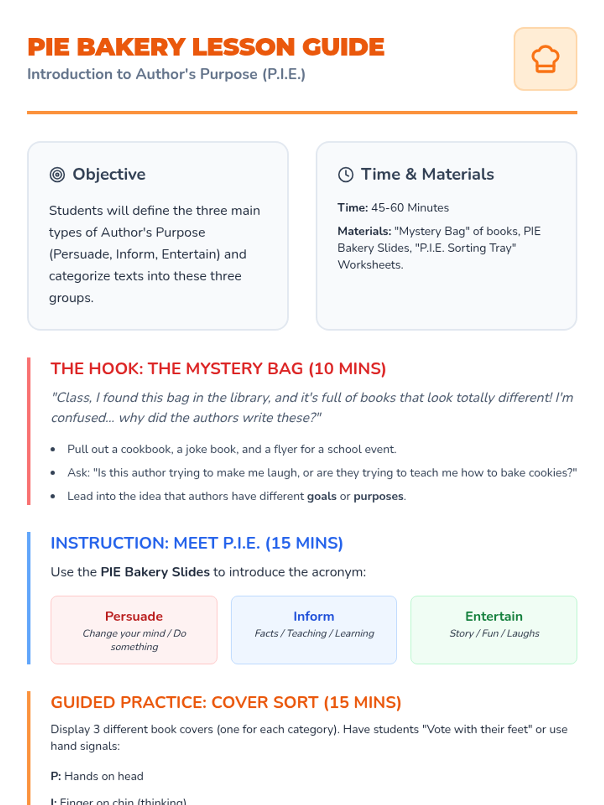 This sequence introduces second-grade students to the fundamental concept of Author's Purpose using the P.I.E. (Persuade, Inform, Entertain) framework. Students will learn to categorize texts, identify informational features, recognize narrative elements, and spot persuasive language through interactive lessons and a culminating mastery challenge.