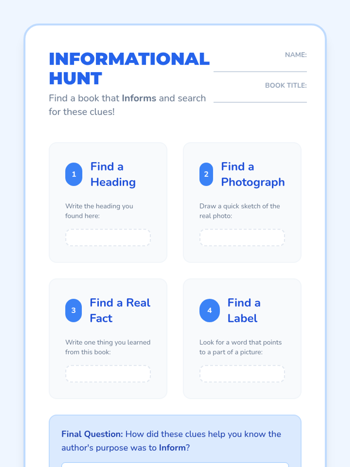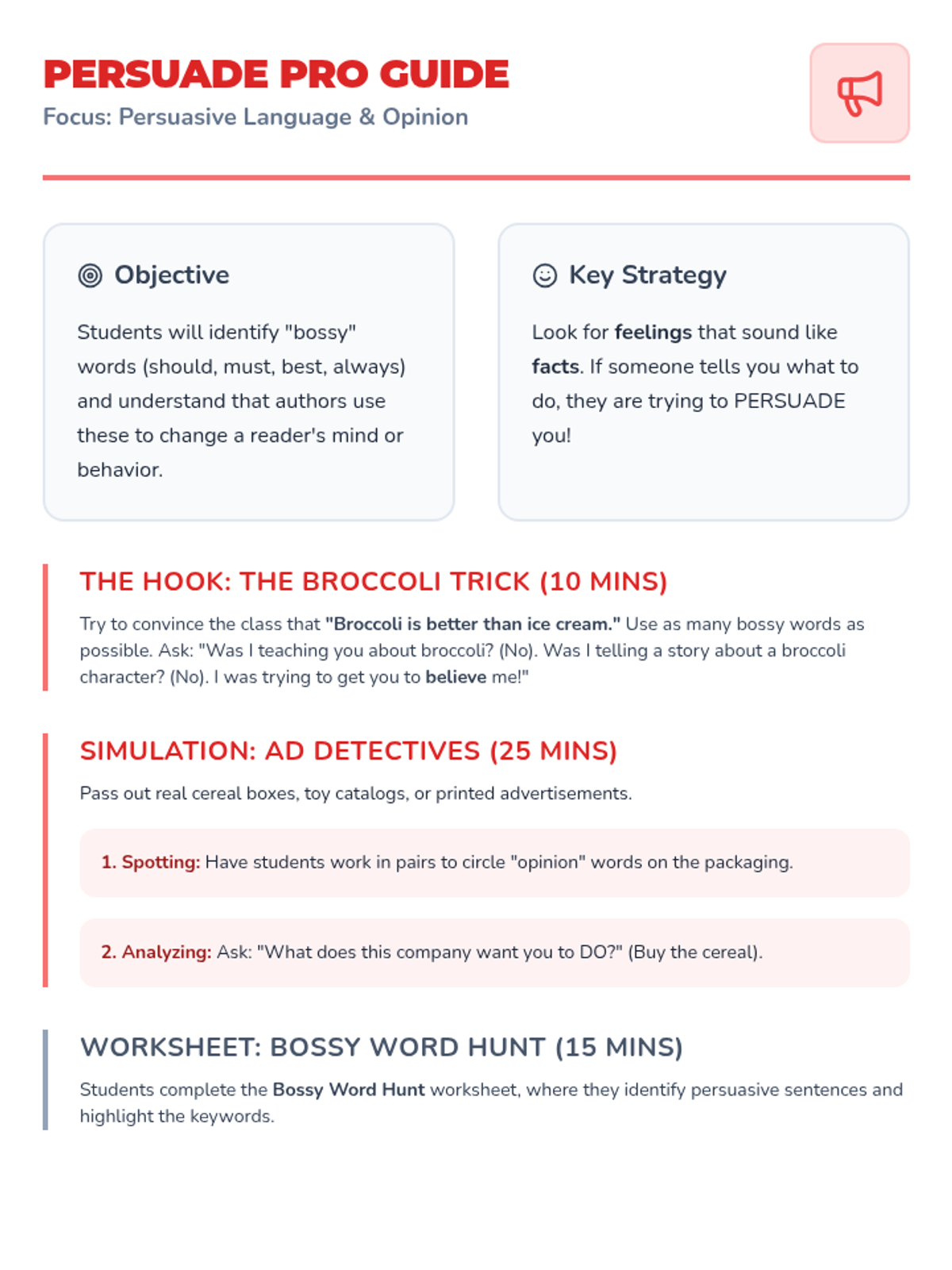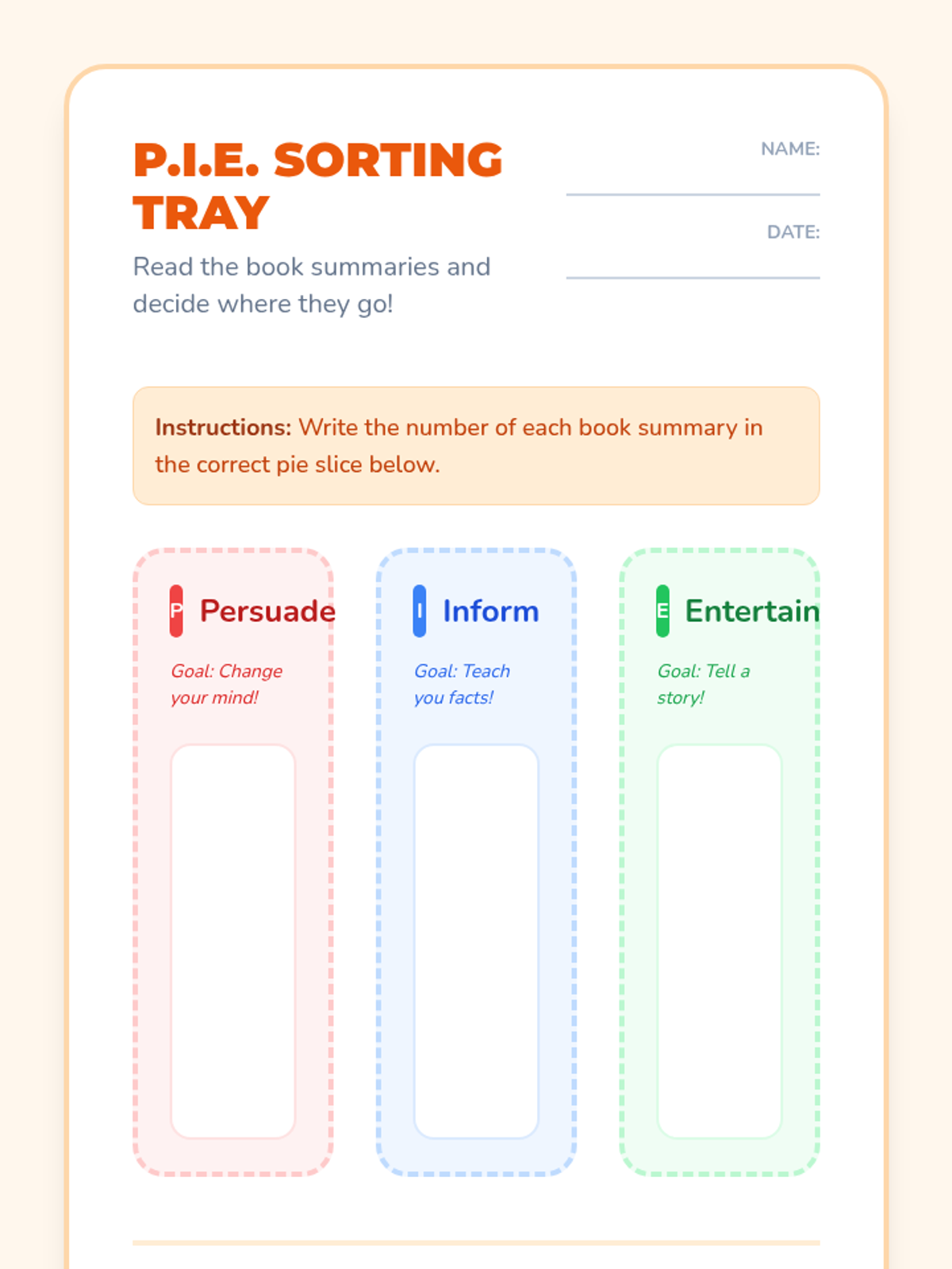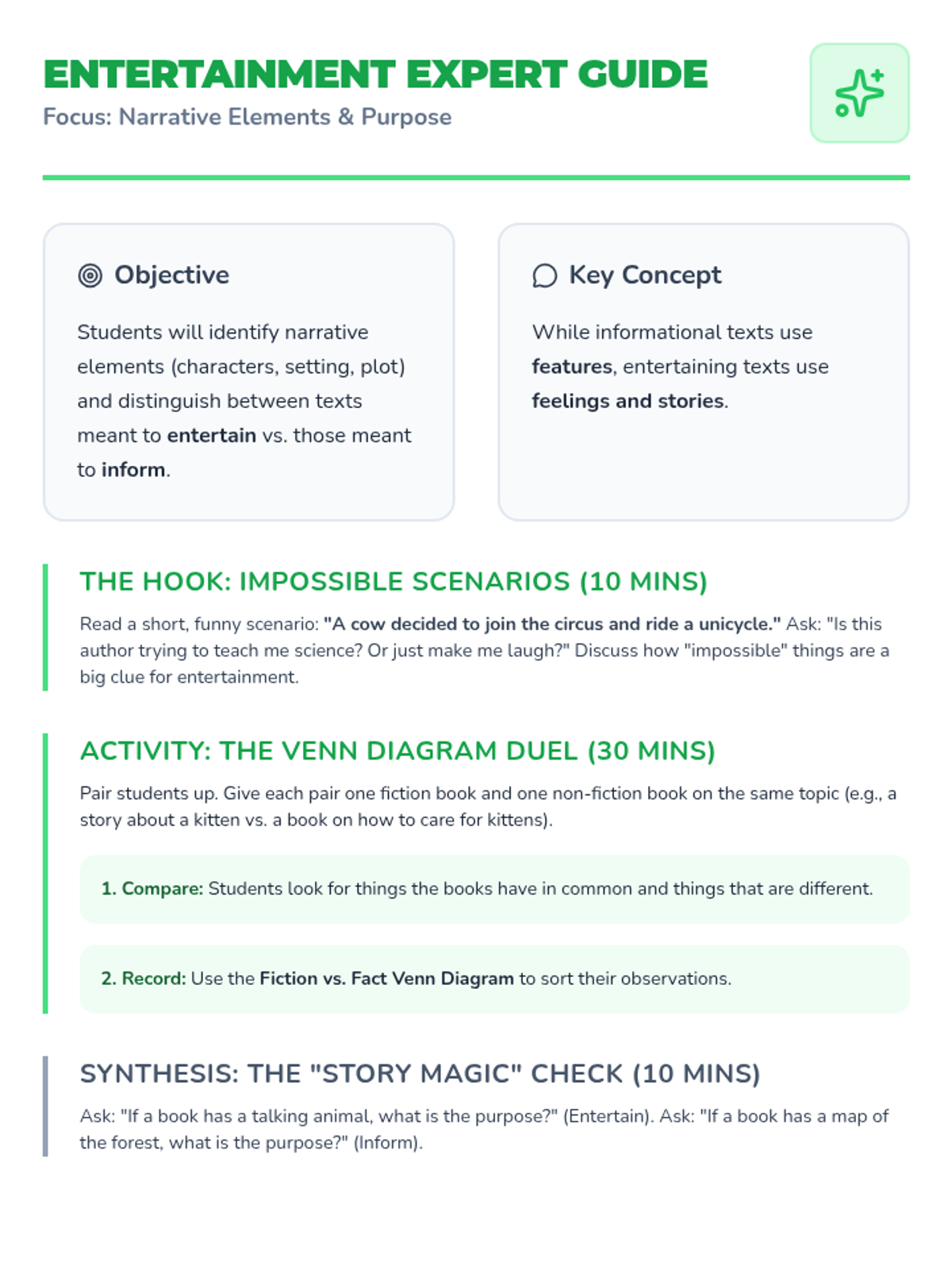 This sequence introduces second-grade students to the fundamental concept of Author's Purpose using the P.I.E. (Persuade, Inform, Entertain) framework. Students will learn to categorize texts, identify informational features, recognize narrative elements, and spot persuasive language through interactive lessons and a culminating mastery challenge.