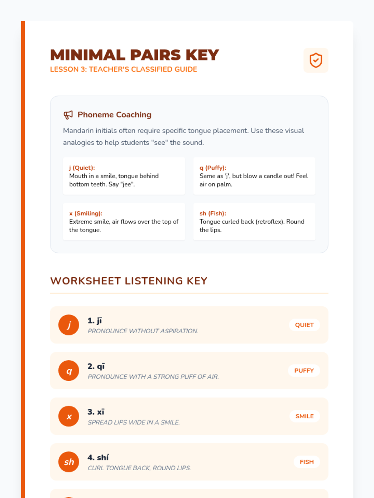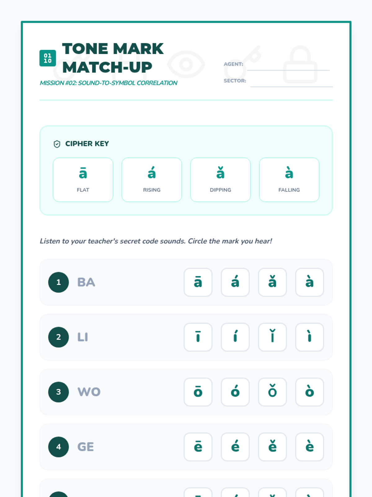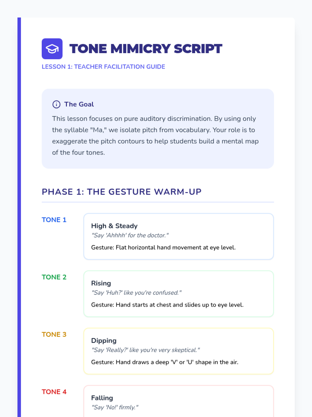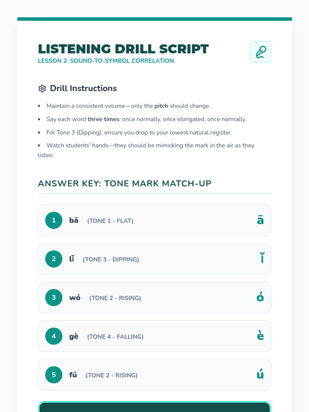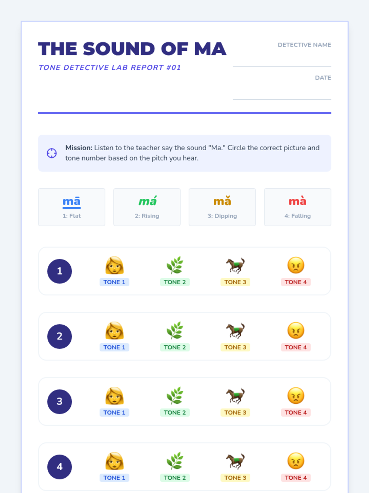 This sequence introduces 3rd-grade students to the four Mandarin Chinese tones. Students will learn to distinguish pitches, associate them with Pinyin marks, recognize specific phonemes, and identify tones in multi-syllable words through listening exercises and games.