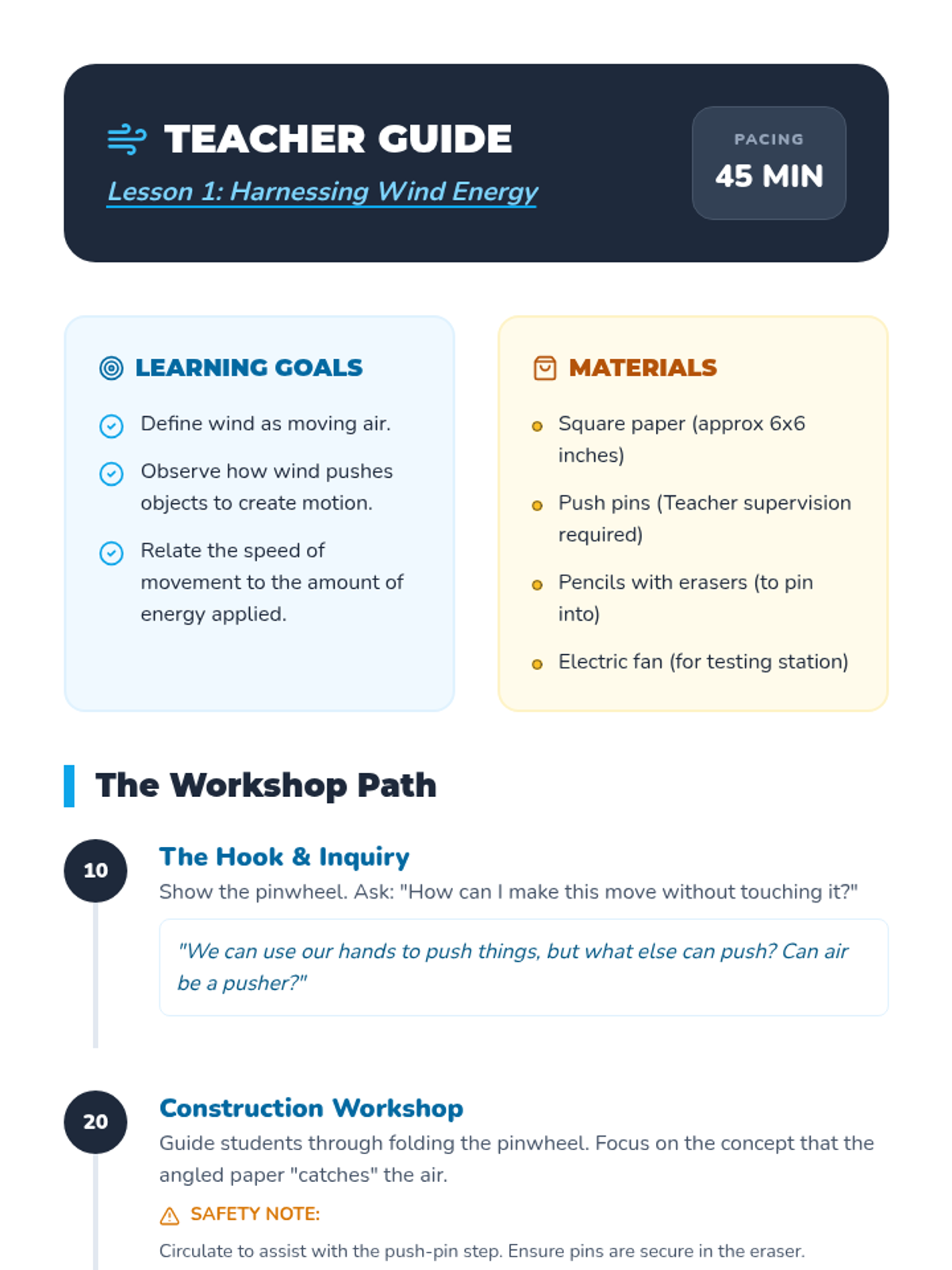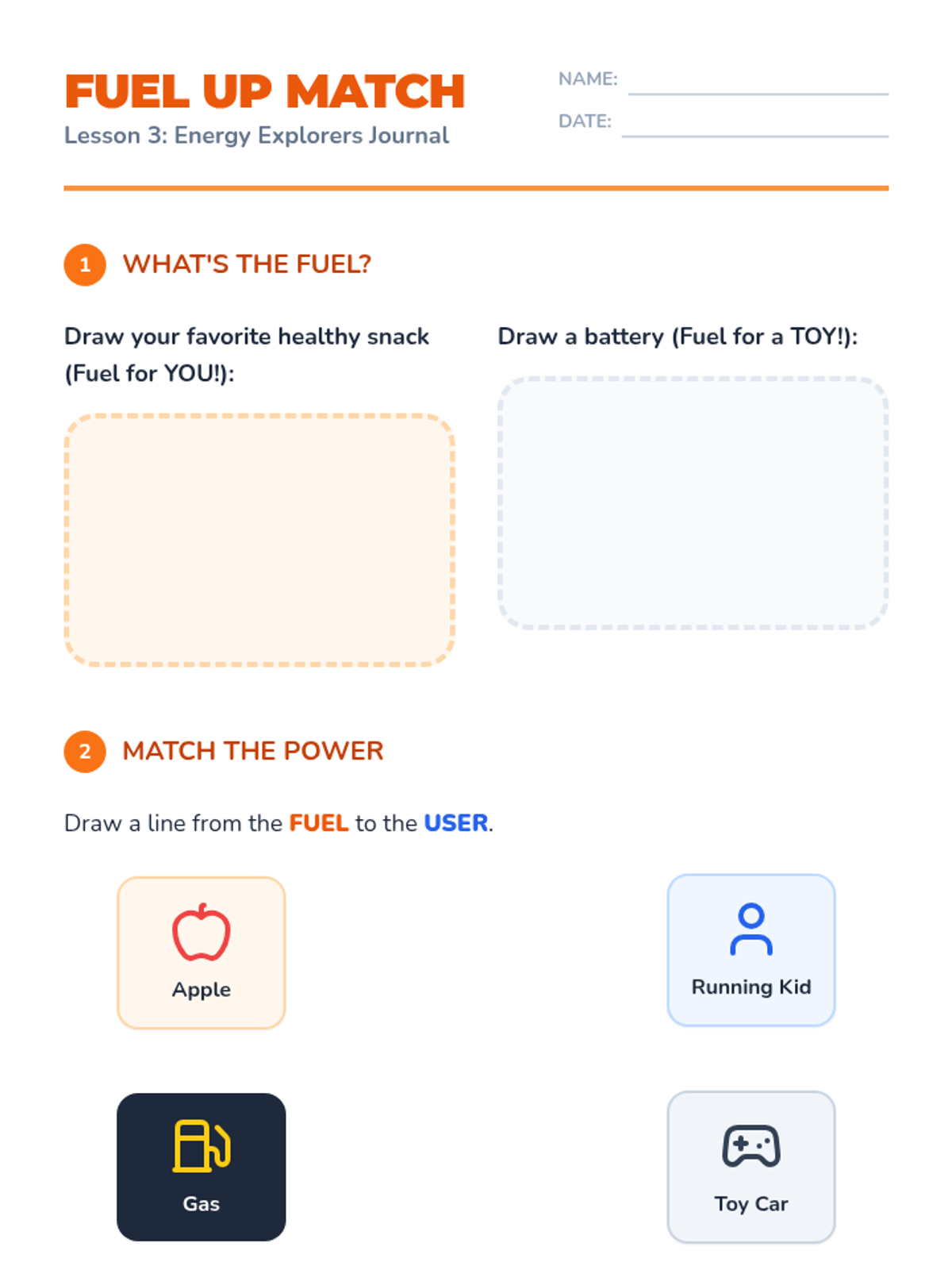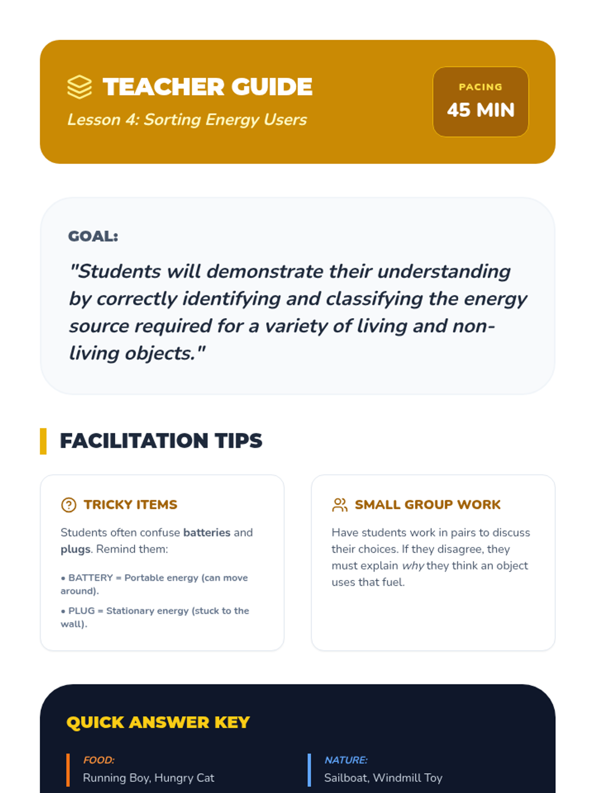 A 1st Grade physics sequence exploring natural and artificial energy sources. Students learn about wind, water, food, and electricity as 'fuels' that make things move, culminating in energy conservation practices.