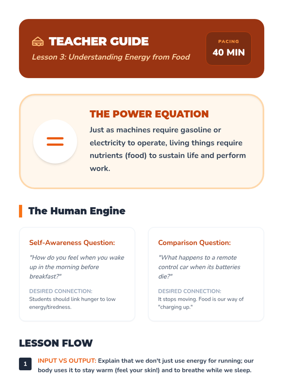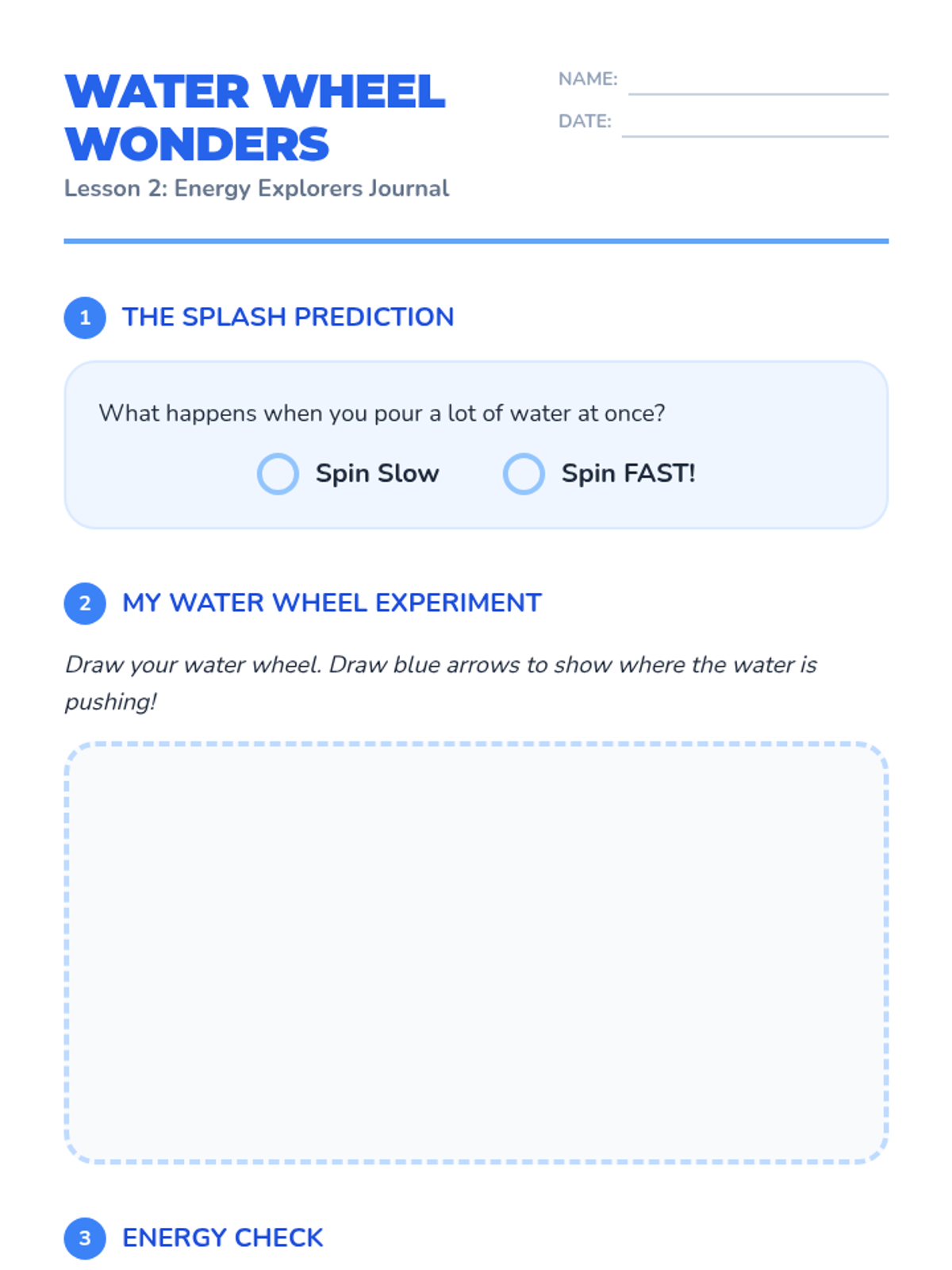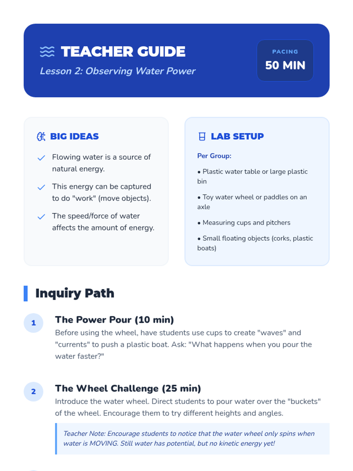 A 1st Grade physics sequence exploring natural and artificial energy sources. Students learn about wind, water, food, and electricity as 'fuels' that make things move, culminating in energy conservation practices.