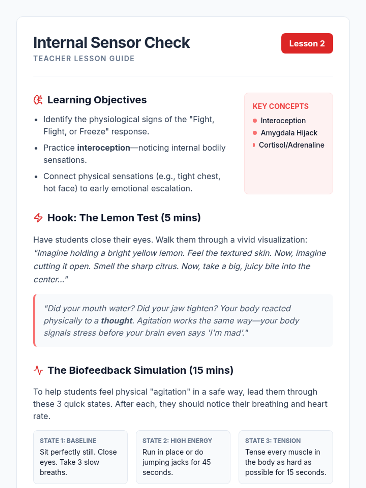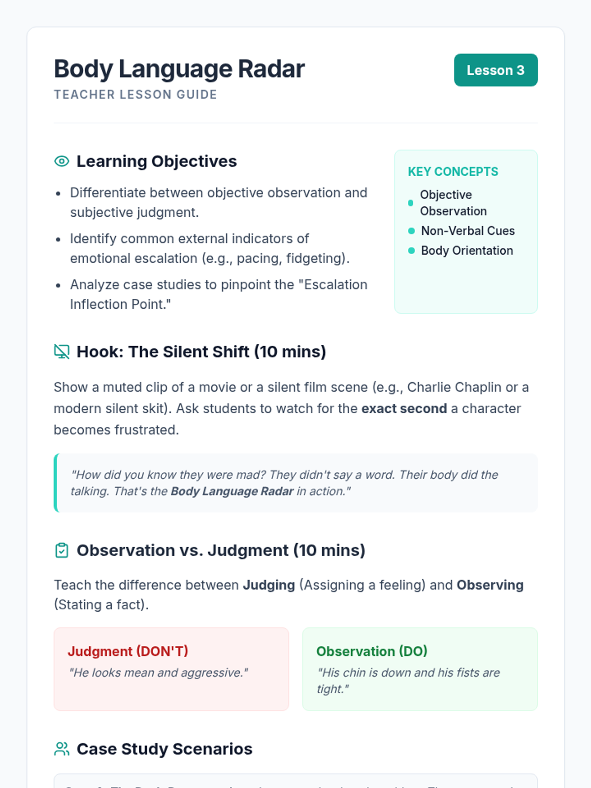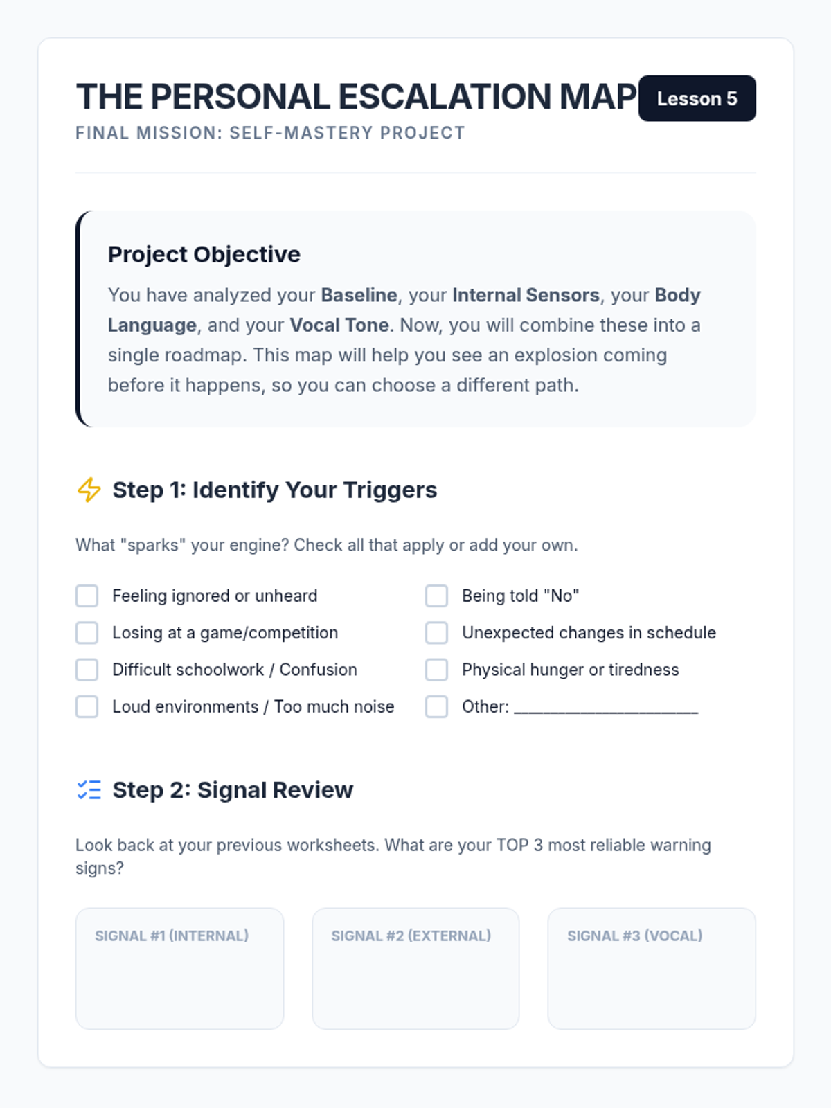 A comprehensive 5-lesson unit for 7th-grade students to identify internal and external signals of emotional escalation. Students move from establishing baseline behaviors to creating a personalized 'Escalation Map' to help them recognize when to engage coping strategies before a crisis occurs.